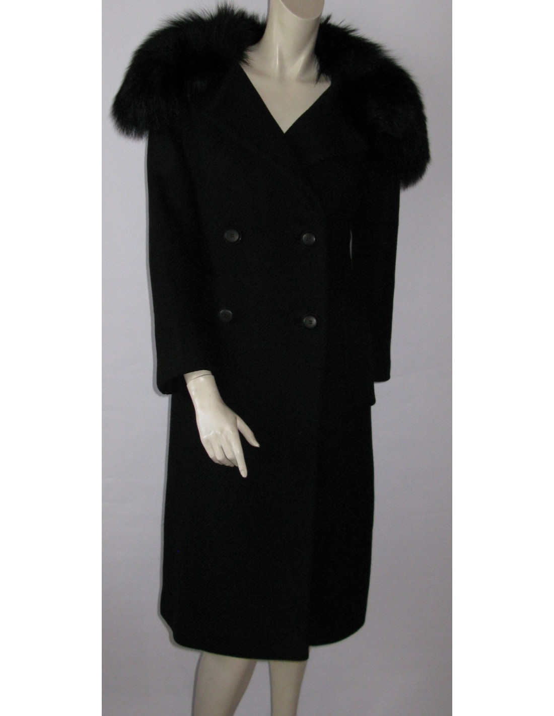 Coat Black wool patterned stripes, demi-ceinture buttoned at the back on the side seams, median cleft from the waist, double-breasted front with interior buttons to adjust the size and Pocket split on the sides. Lining (4 cm) slightly disjointed.