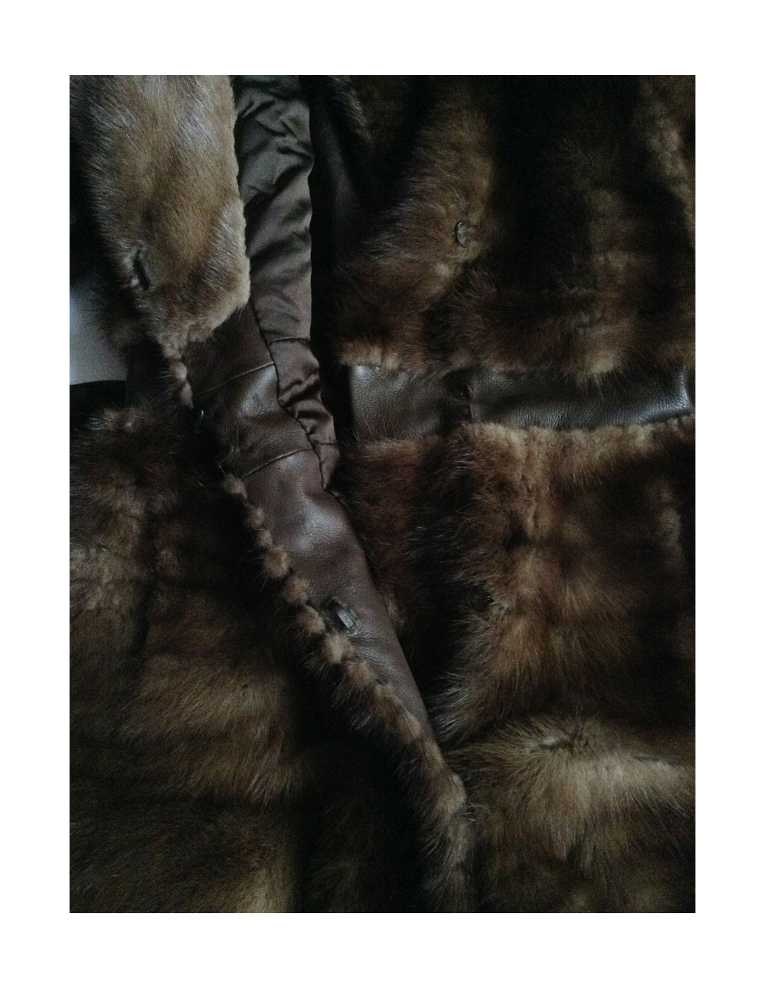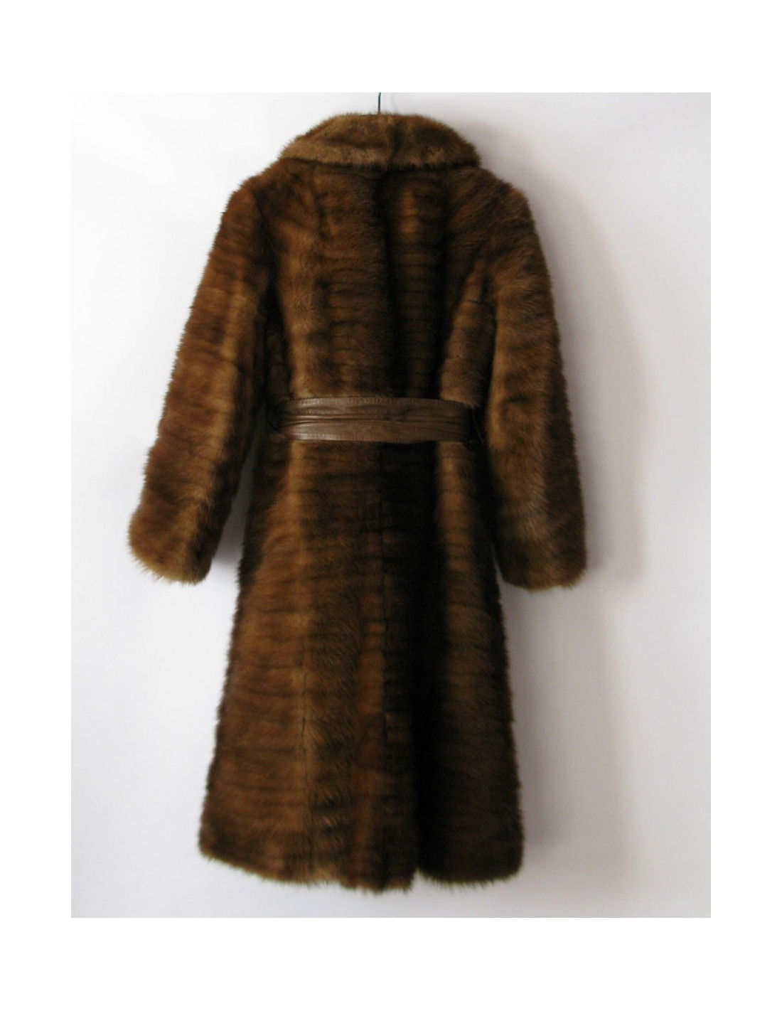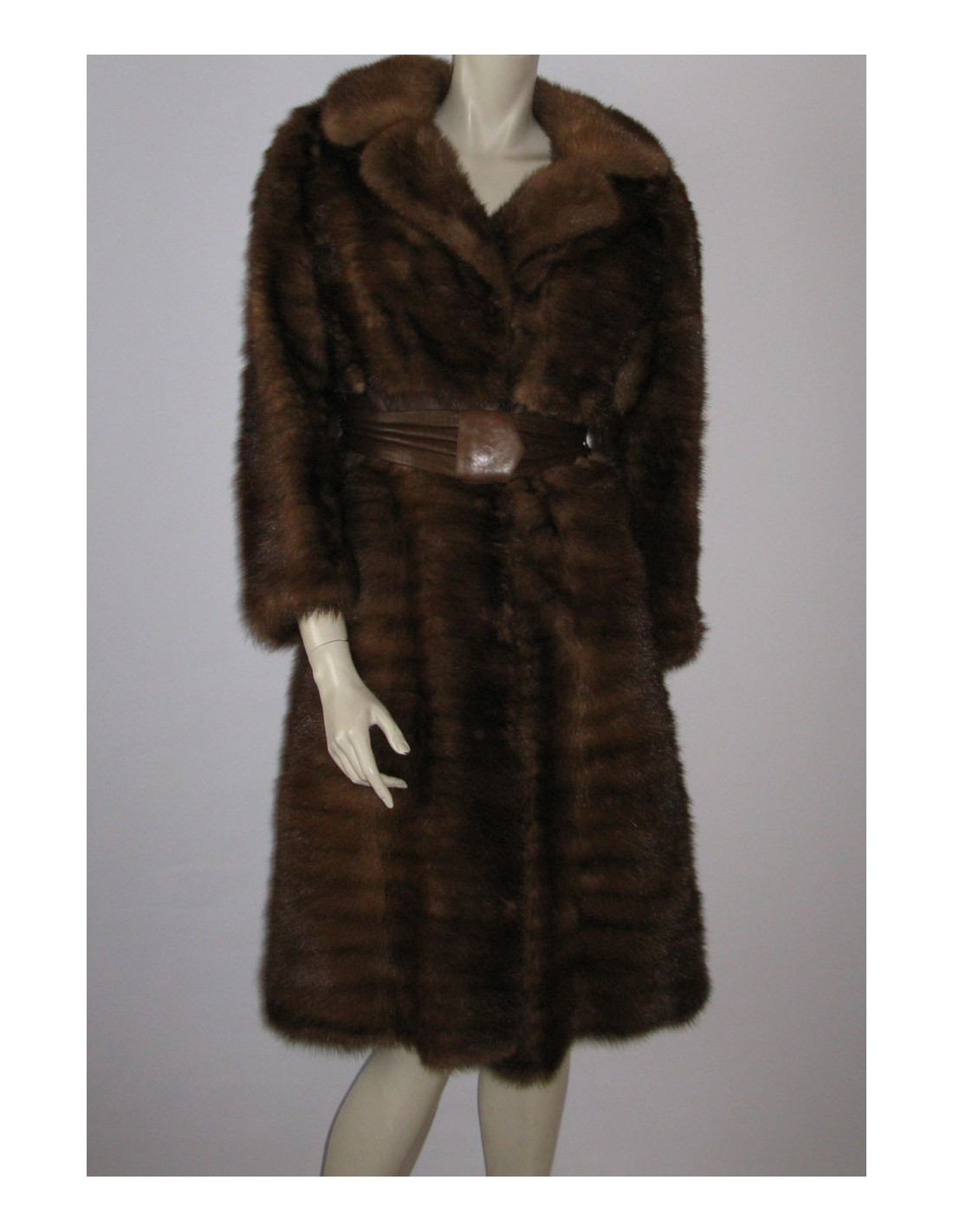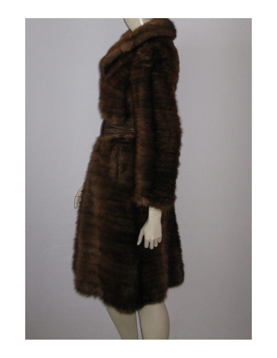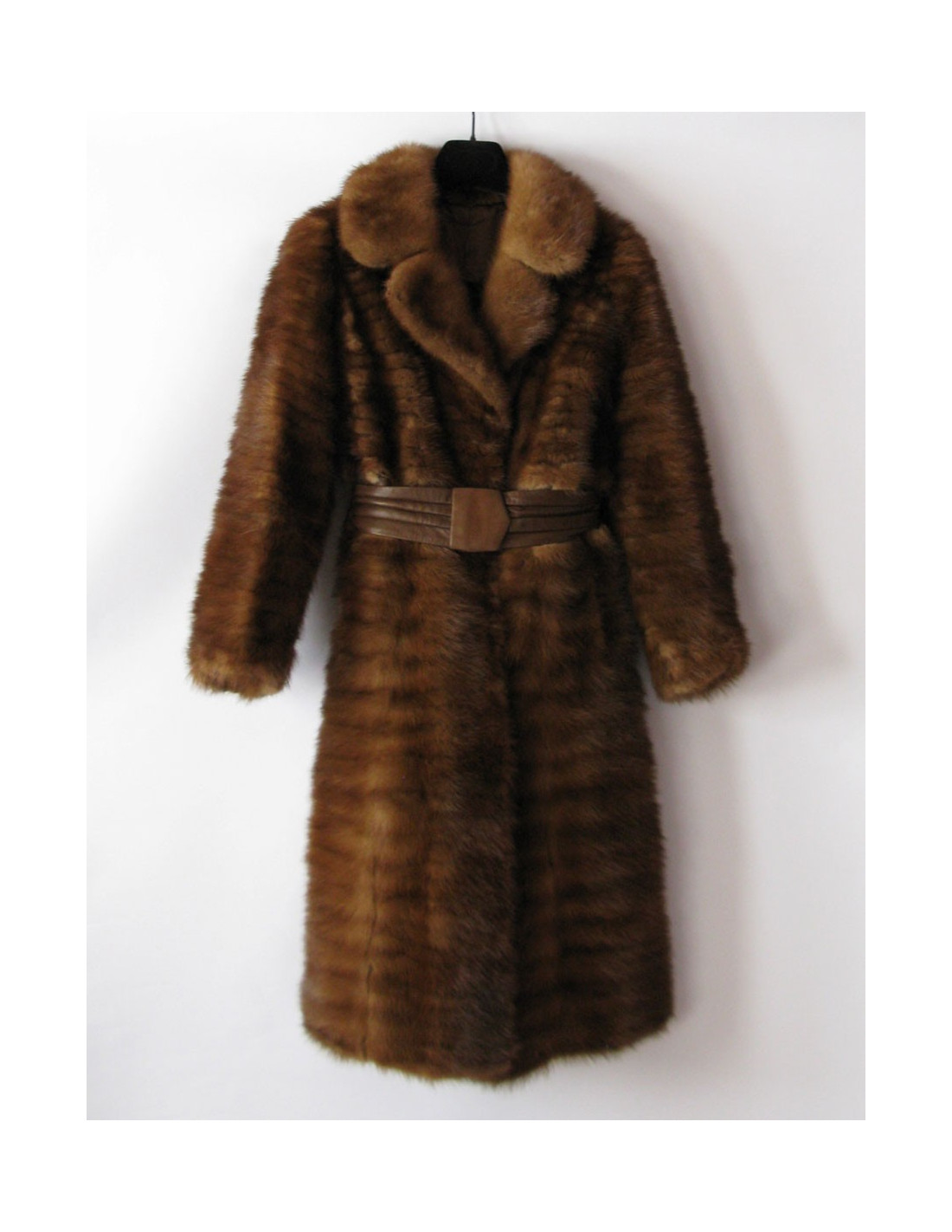 Splendid! Coat of mink year 70' Brown T36Fr, semi-long, notched collar, long sleeves. Mink female worked horizontally with a belt and a brown leather band built around the size. Closure by hooks. Pockets on the sides. 100% mink.