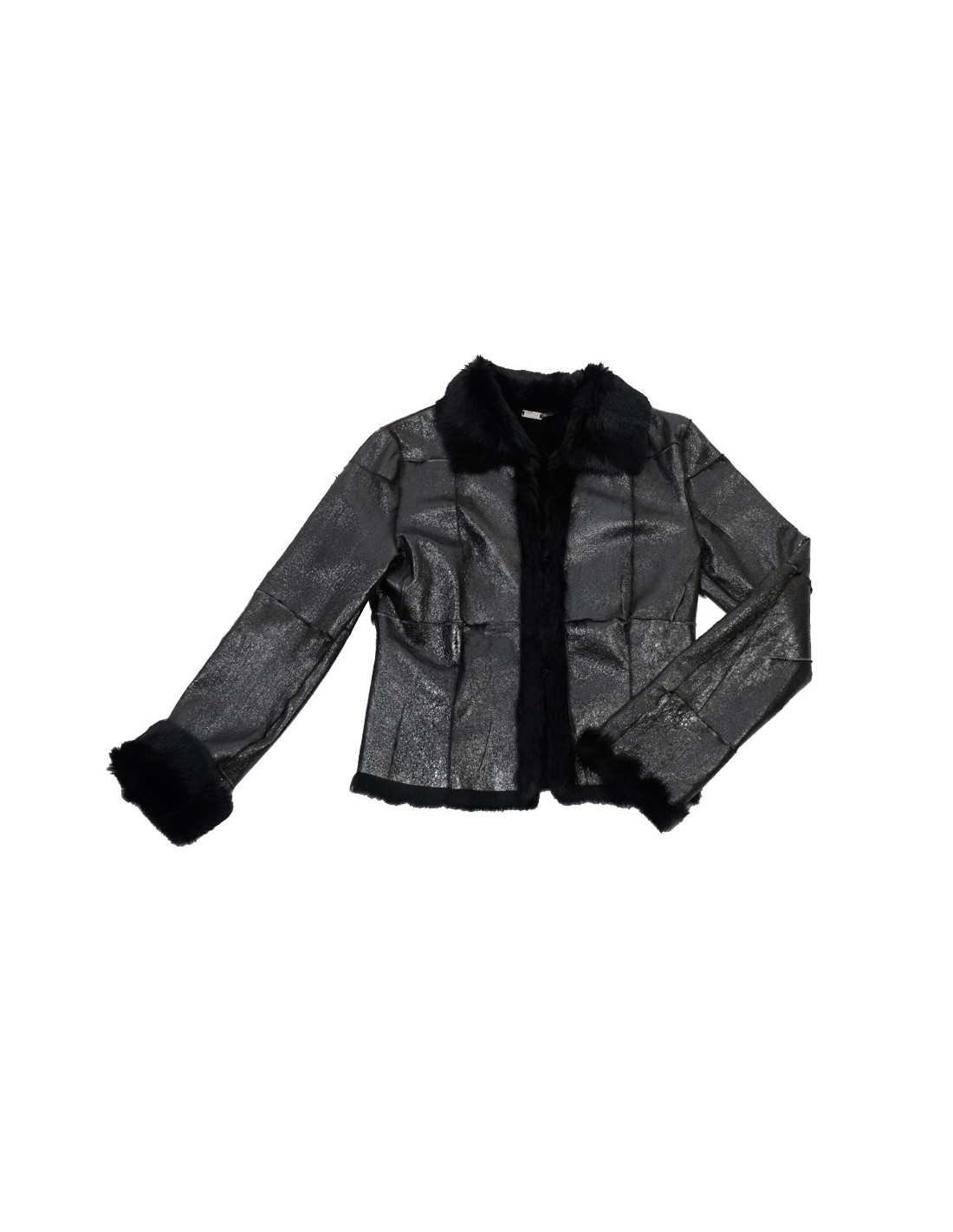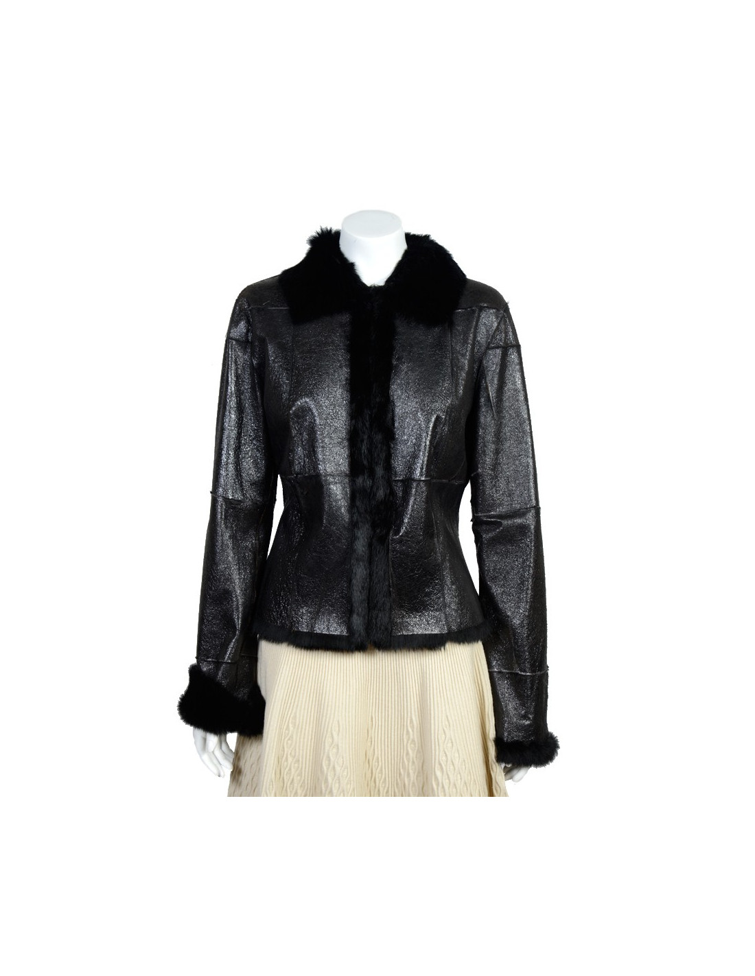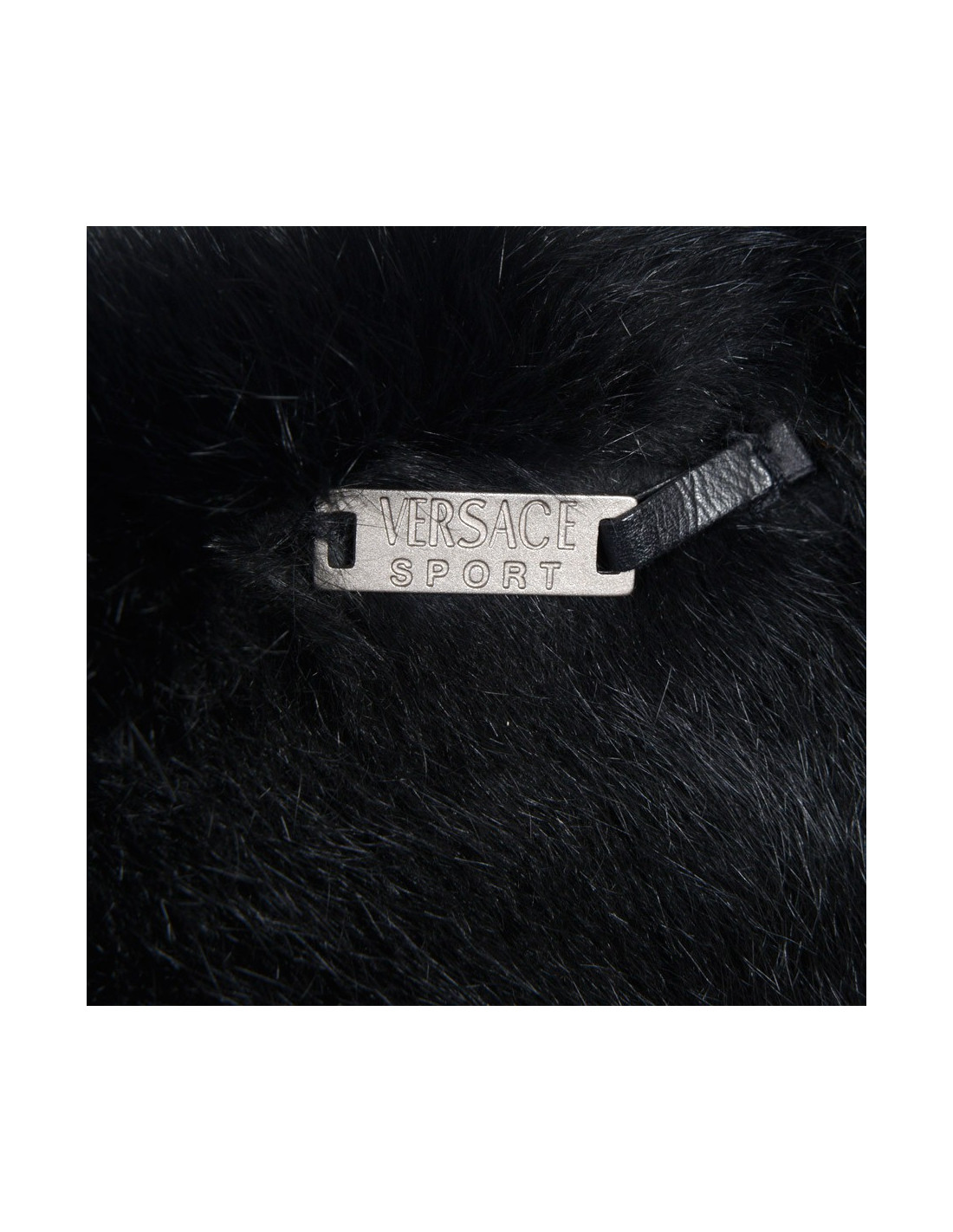 Ravishing short Versace sport black leather jacket on the outside and on the inside black rabbit fur. Closure 3 hooks. It can also be worn over jeans on a dress. Not size but label is equivalent to a 38/40. In very good condition. A slight scratch is located on the left side but very little visible because it is tiny.