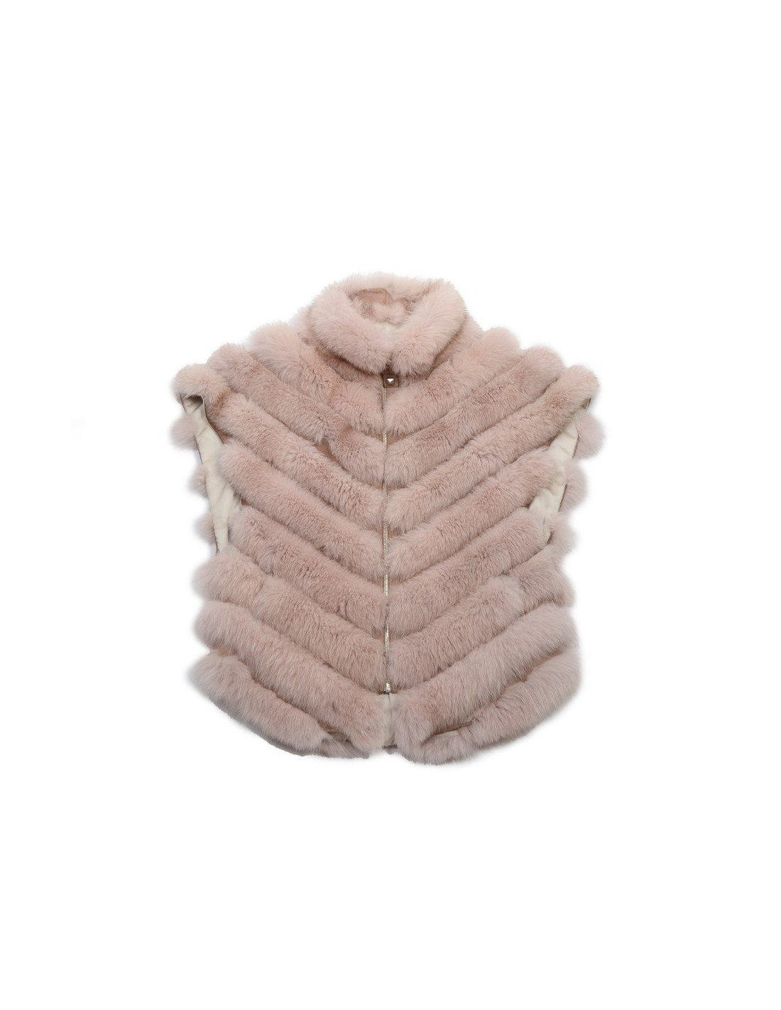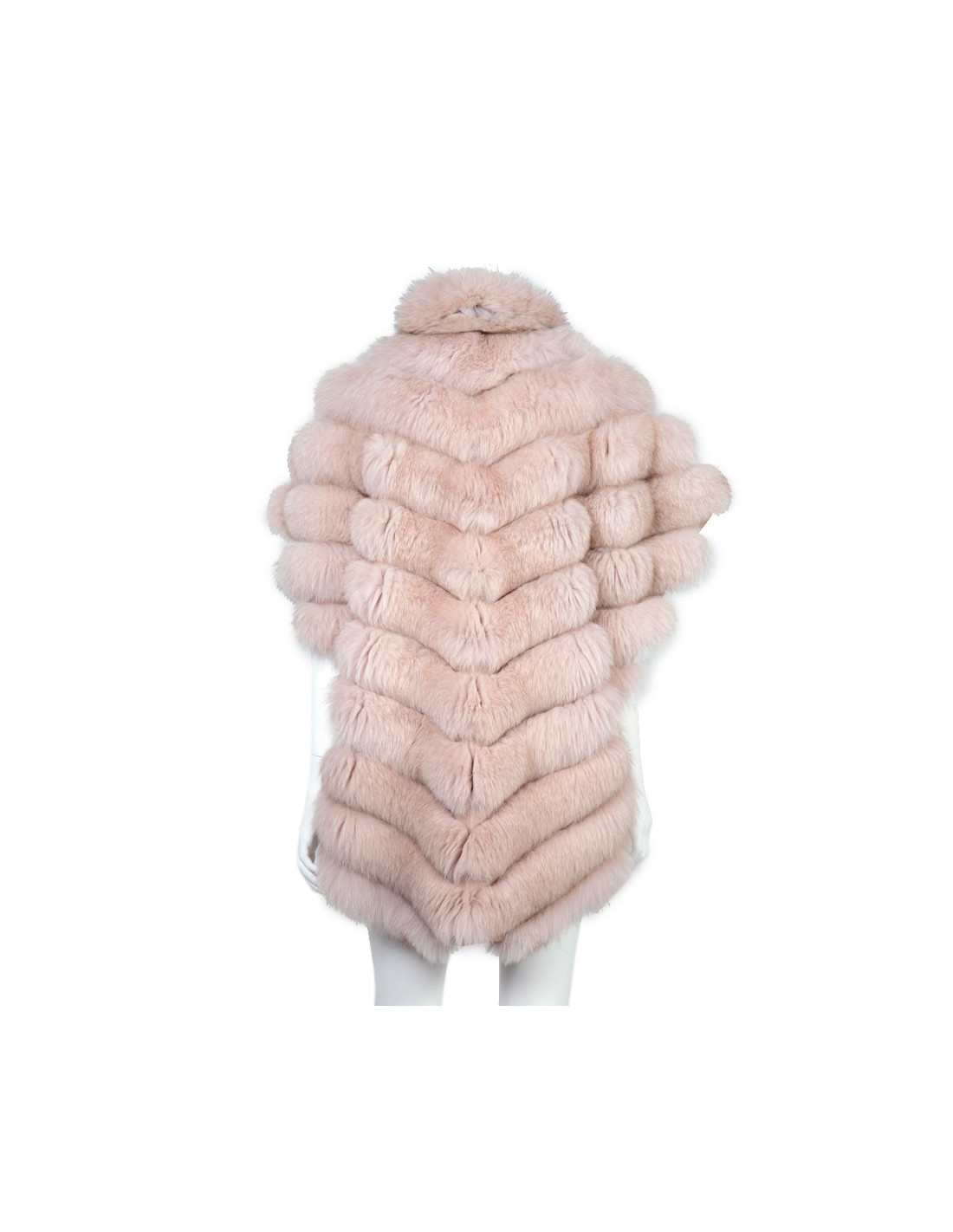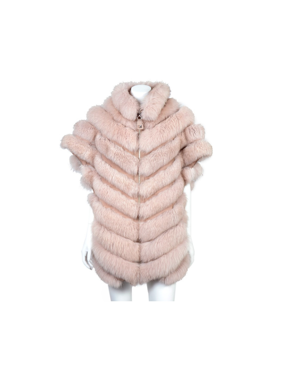 Great coat in pale pink color with 3/4 sleeves fur unbranded. It consists of strips of fur overlapping of other strips of suede in the same tone. A pocket on each side. The inside is pink satin. Zipped. No size tag, is equivalent to a 38. Very nice piece.