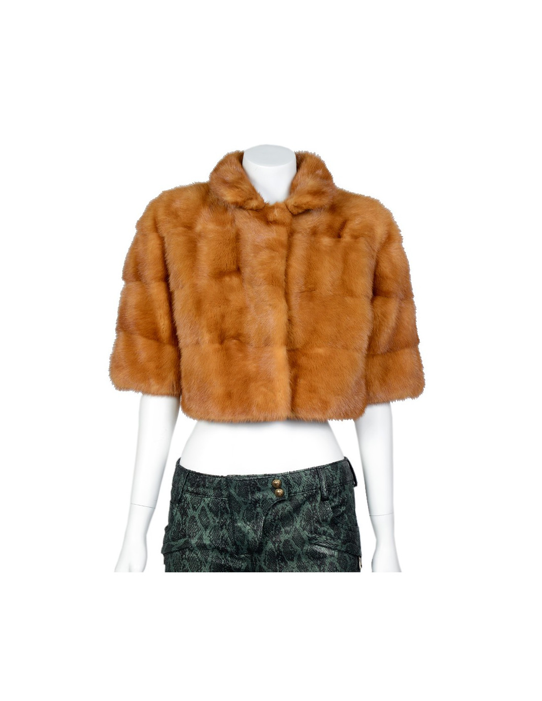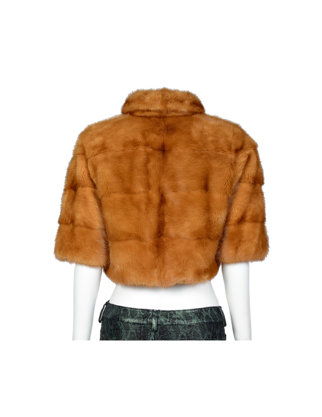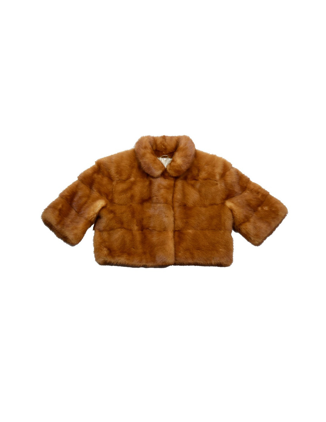 Beautiful short jacket without mark mink of cognac color with 3/4 sleeves. The Interior is silk with floral prints. It closes with 3 buttons hooks. No size tag, is equivalent to a 36. In very good condition.