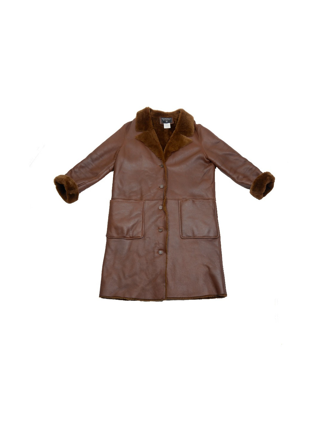 Beautiful coat Chanel returned to Brown in color. Size 40. It has two pockets in the front. Acronyms 'CC' button closure 5. The sleeves are adjustable, you can the returned at your leisure. In very good condition.
