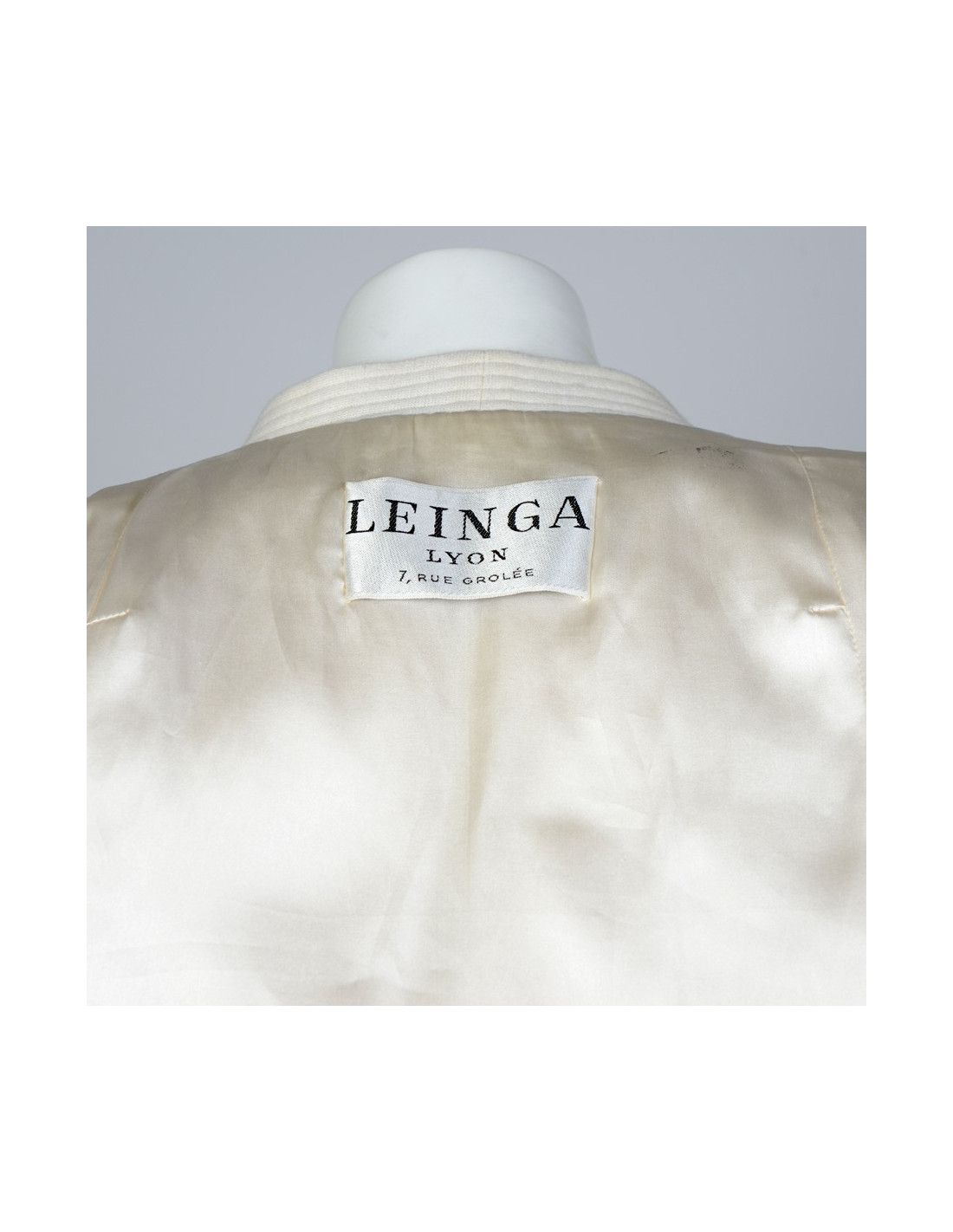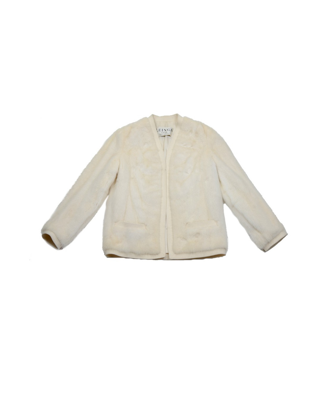 Leinga broken white mink fur jacket. Not size but tag is equivalent to a 38. Jacket without collar two front lower pockets with silk satin lining. Very good condition.