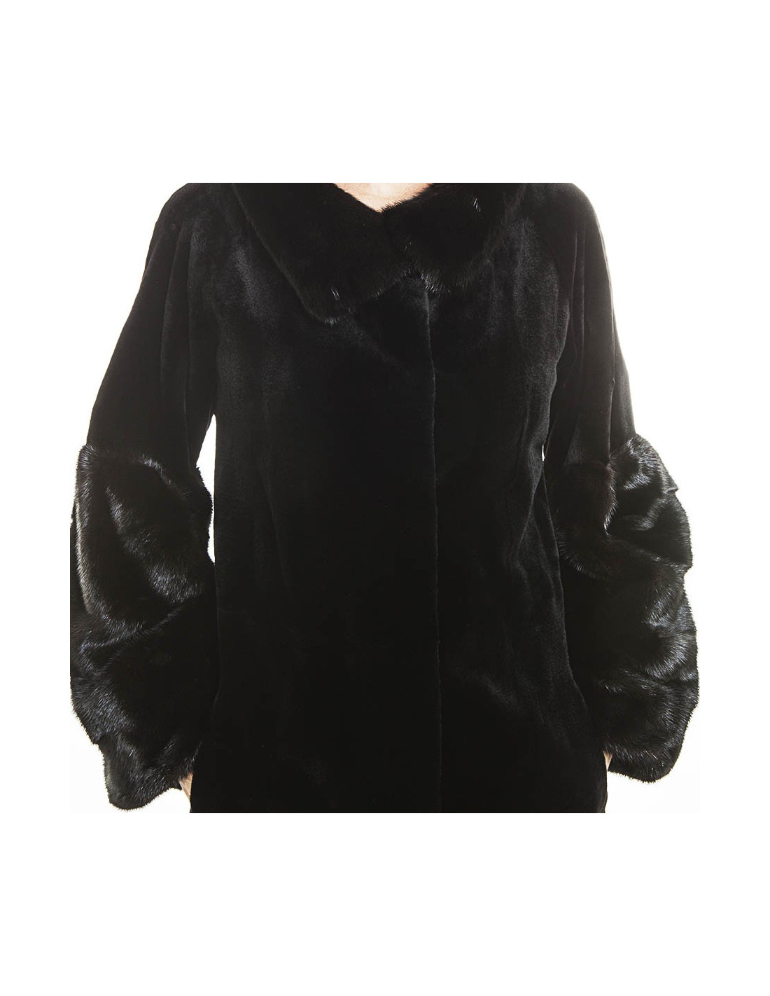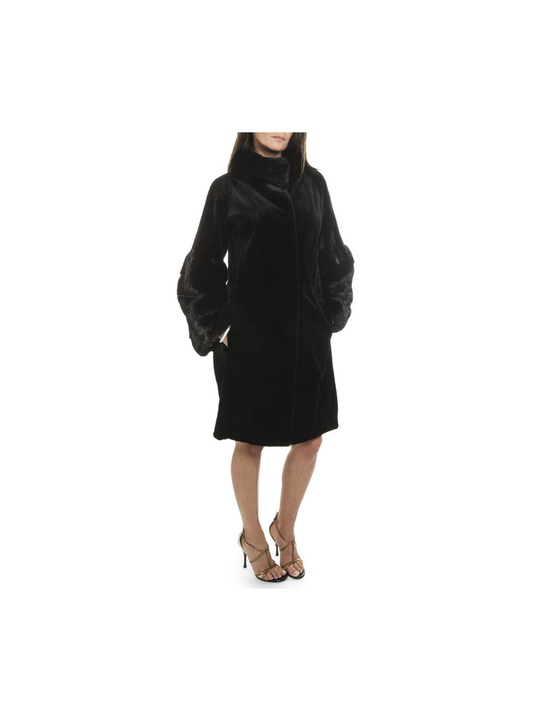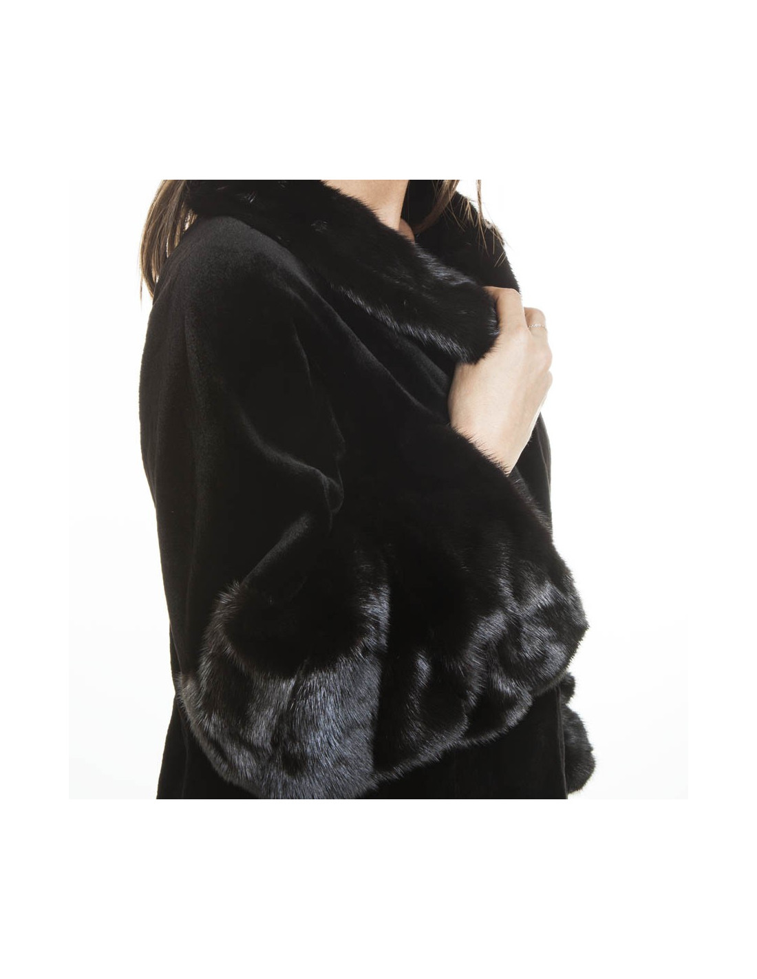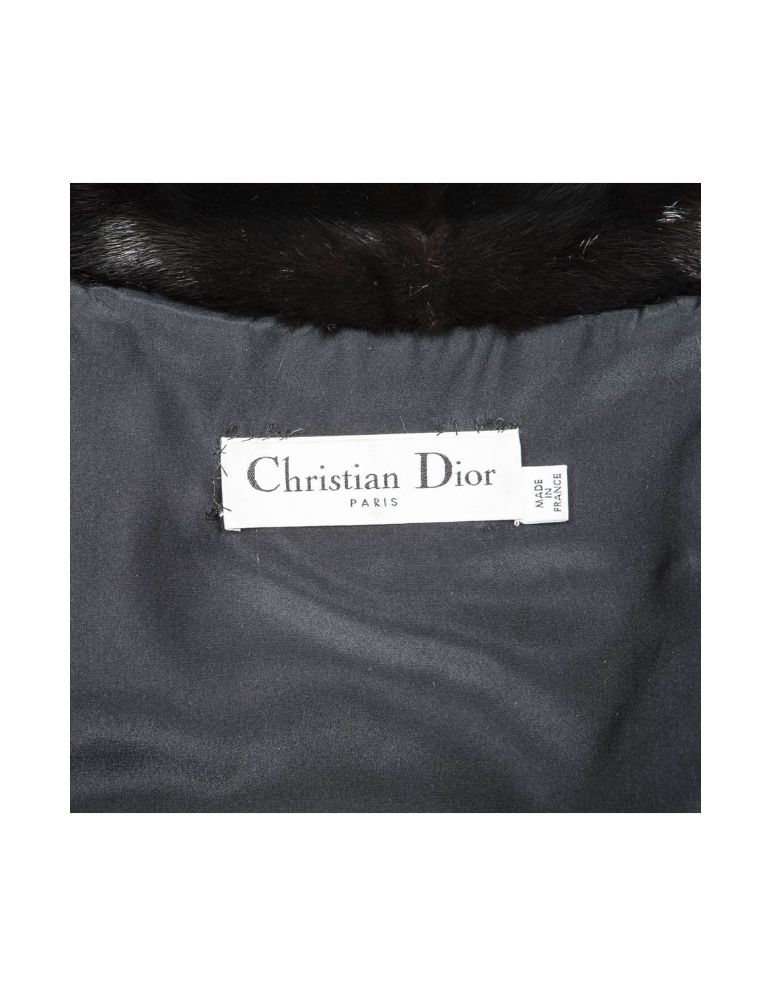 Black and long the House of Christian Dior in shaved mink coat on the sleeves and the collar with brown highlights. Snap button closure. Two pockets at an angle. Silk lining. There are 3 links leather in order to pass a belt but belt missing. In very good condition.