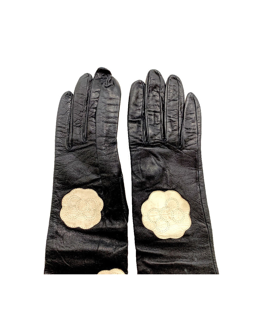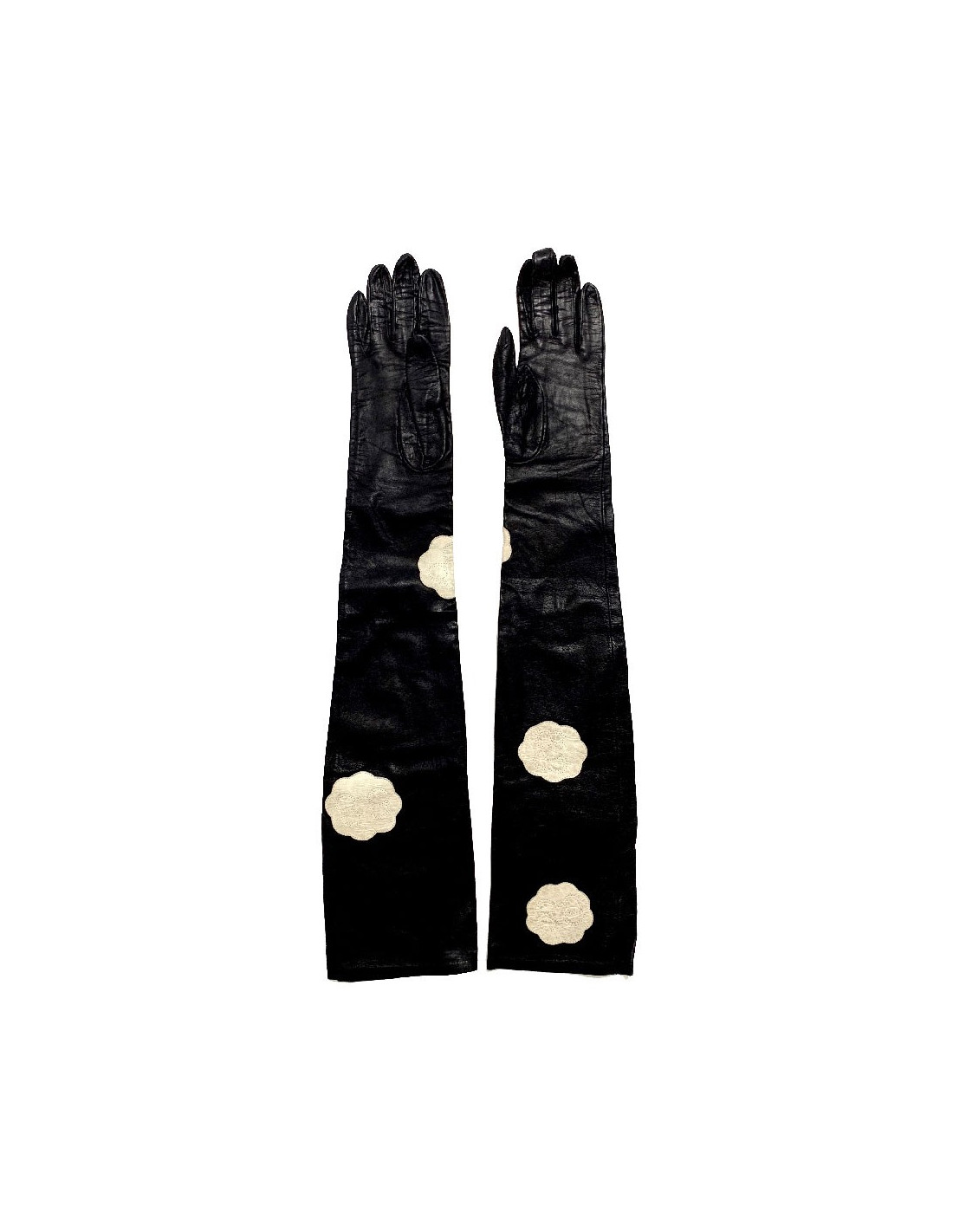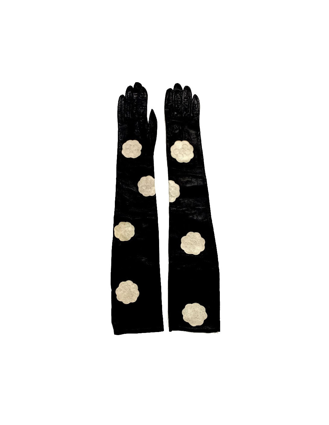 Superb pair of long CHANEL gloves, in smooth black lambskin leather, on which white leather inserts depicting camellias have been sewn. A refined accessory that's elegant to wear.