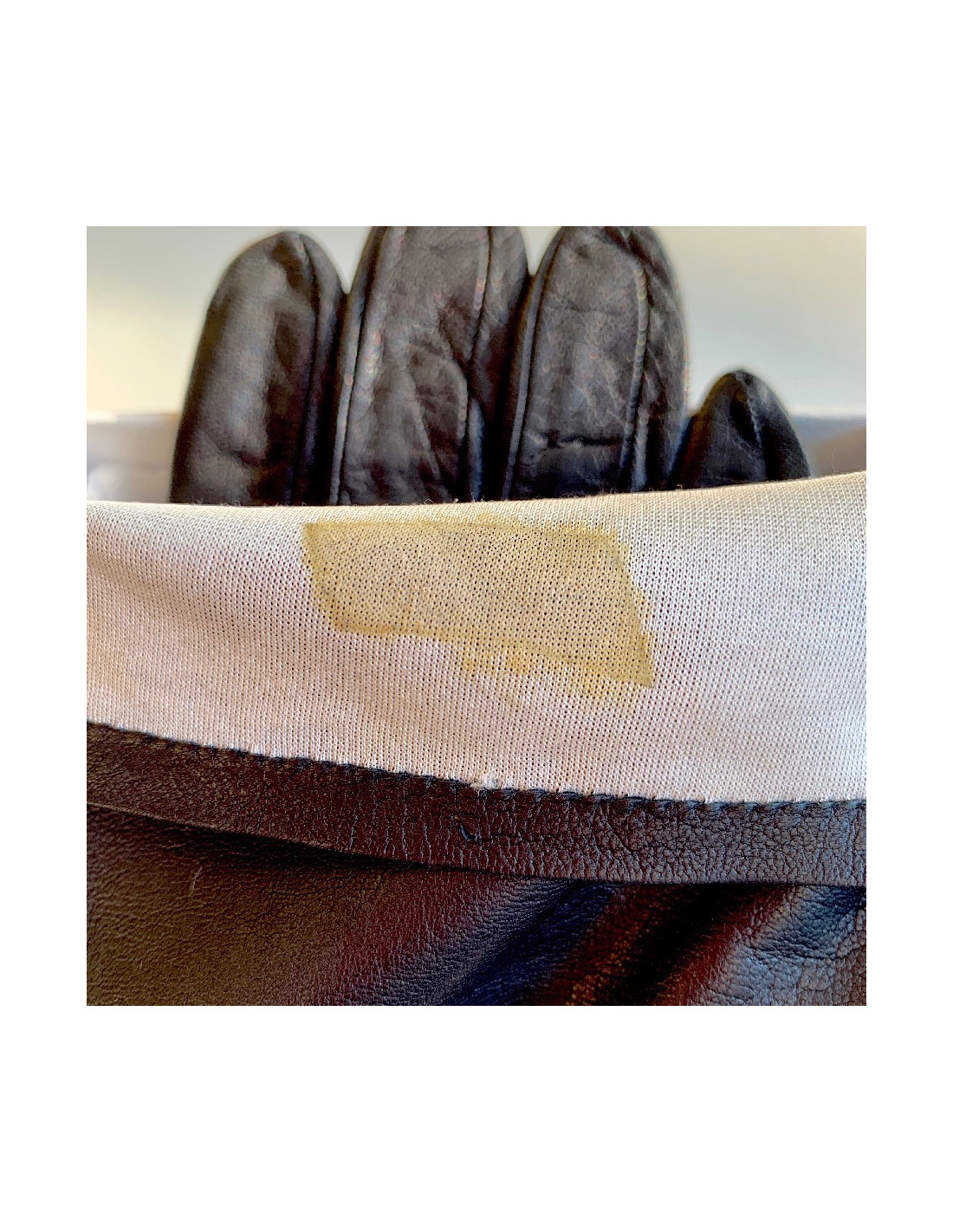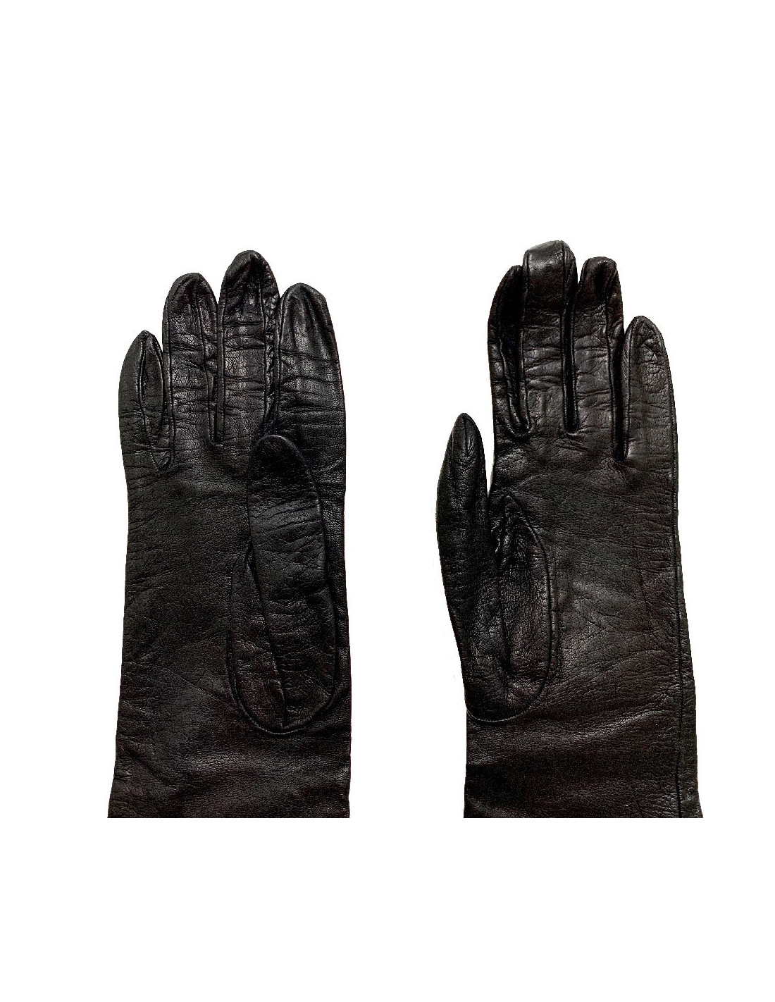 These long gloves are in good condition. The camellias show stains and signs of use (see photo). The smooth lambskin is marked by use. Inside the other glove Inside one glove there is a trace of the material label that has peeled off.