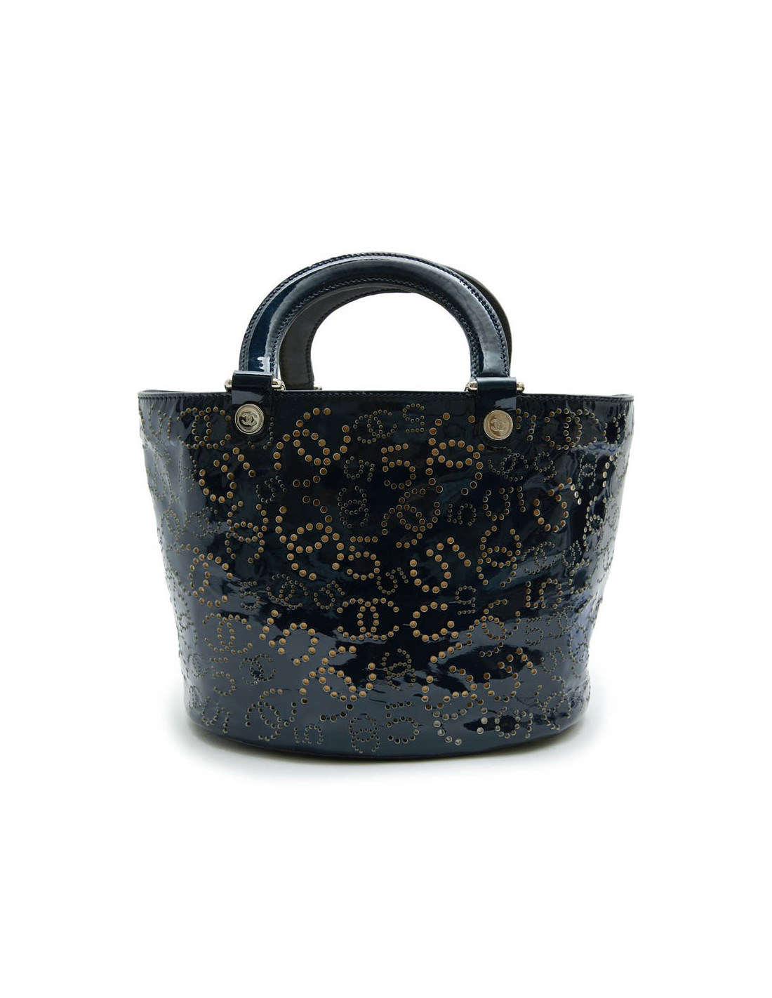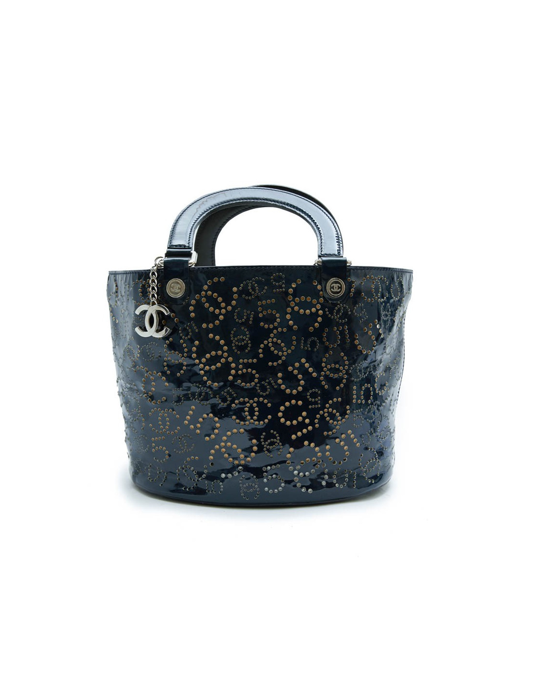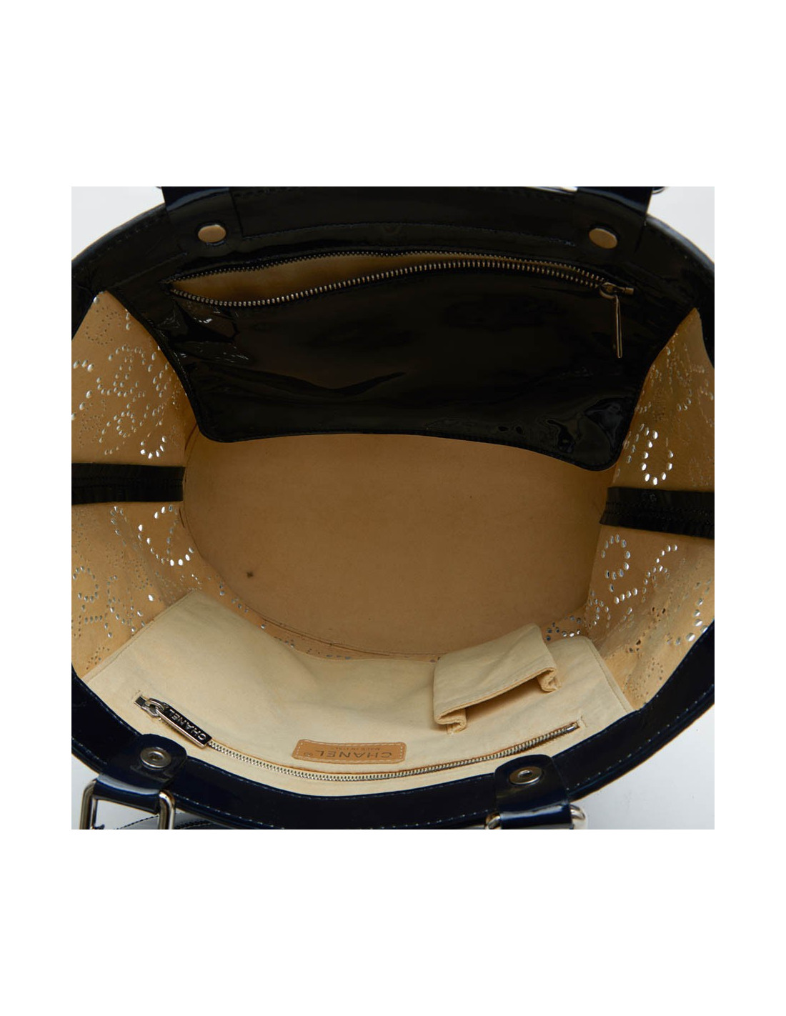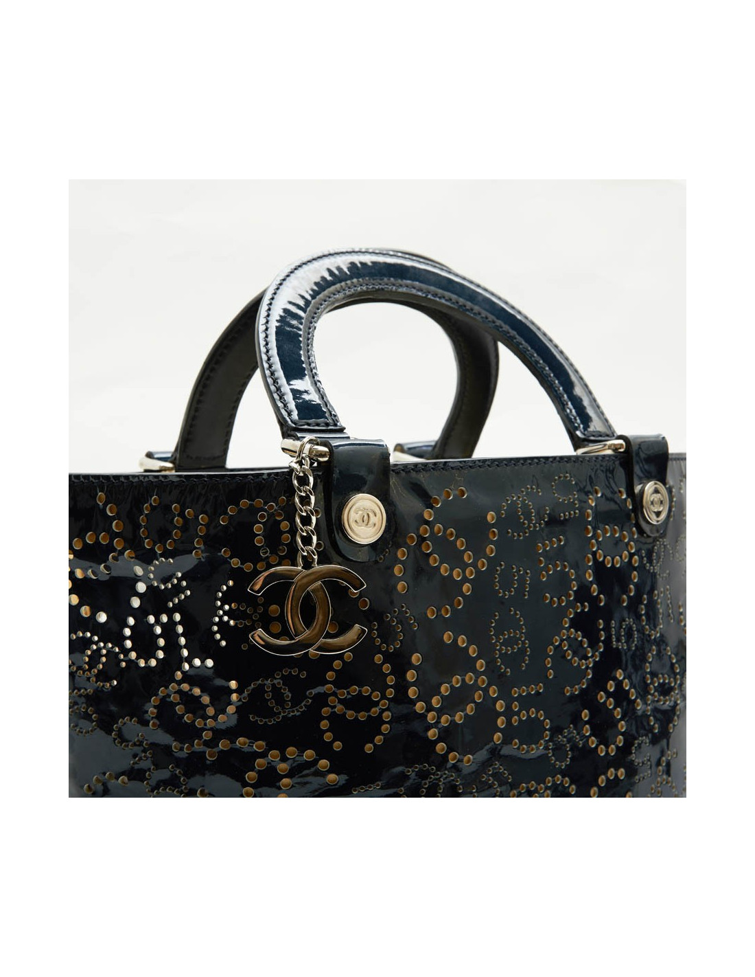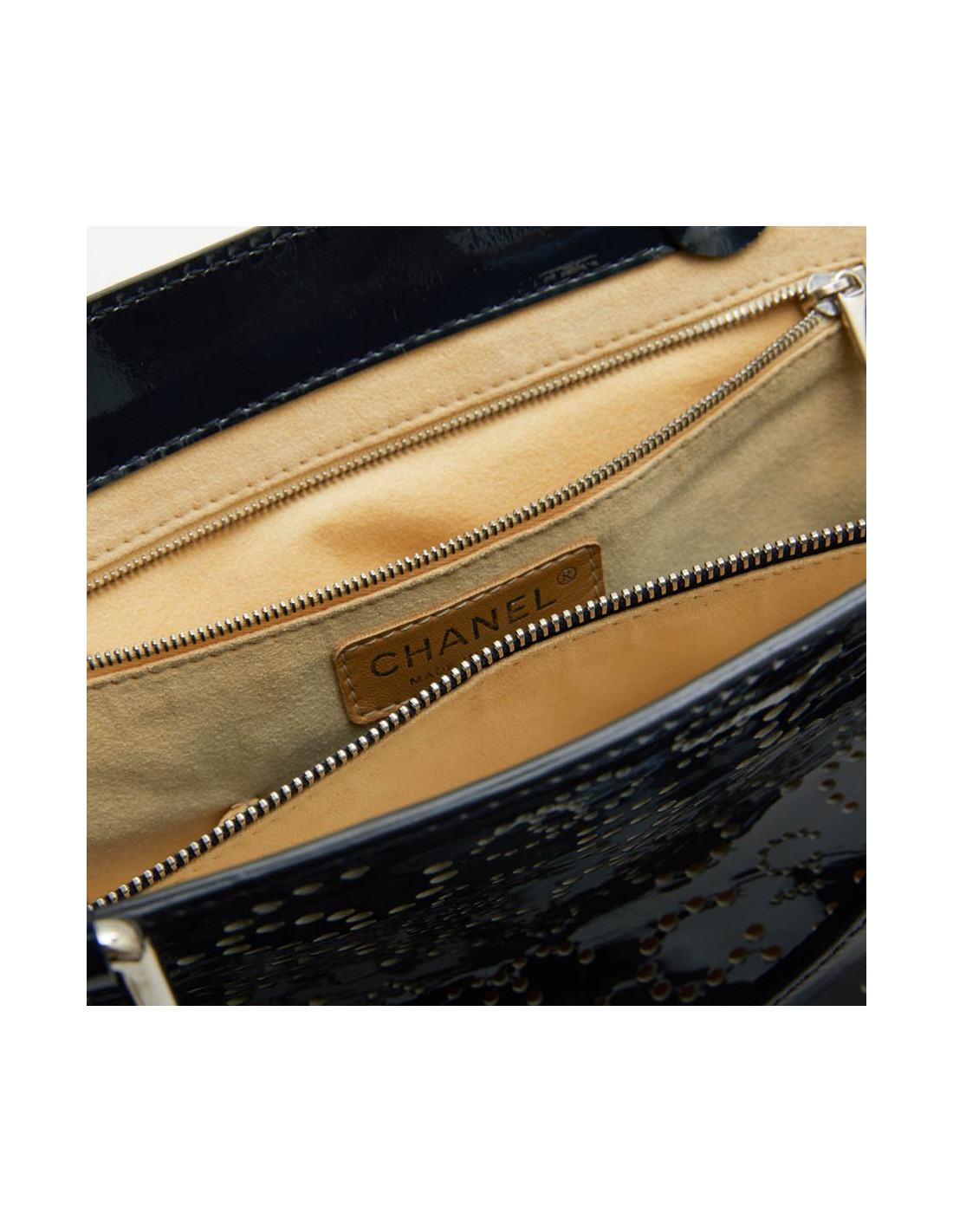 Chanel bag in perforated navy blue patent leather. Palladium silver metal hardware.