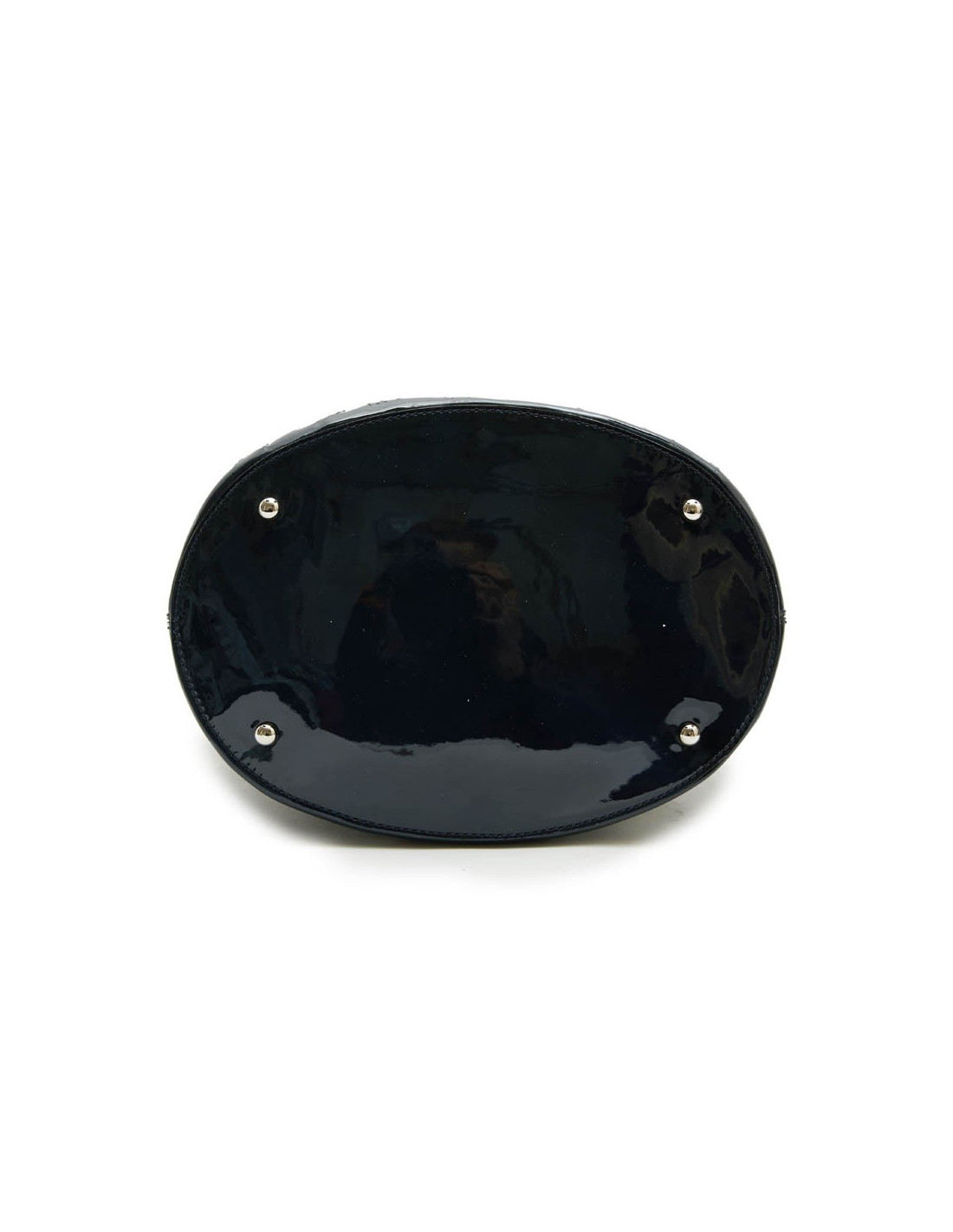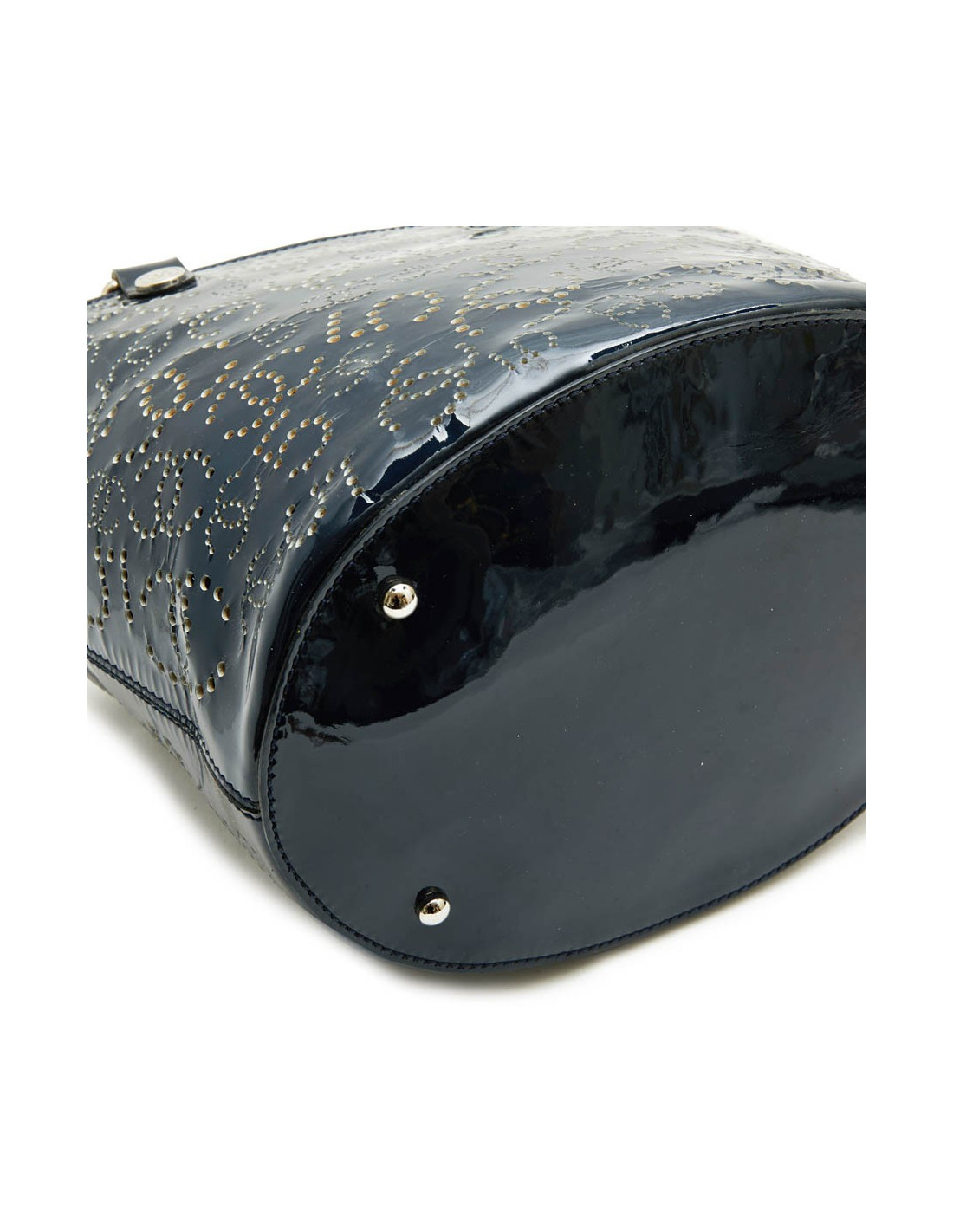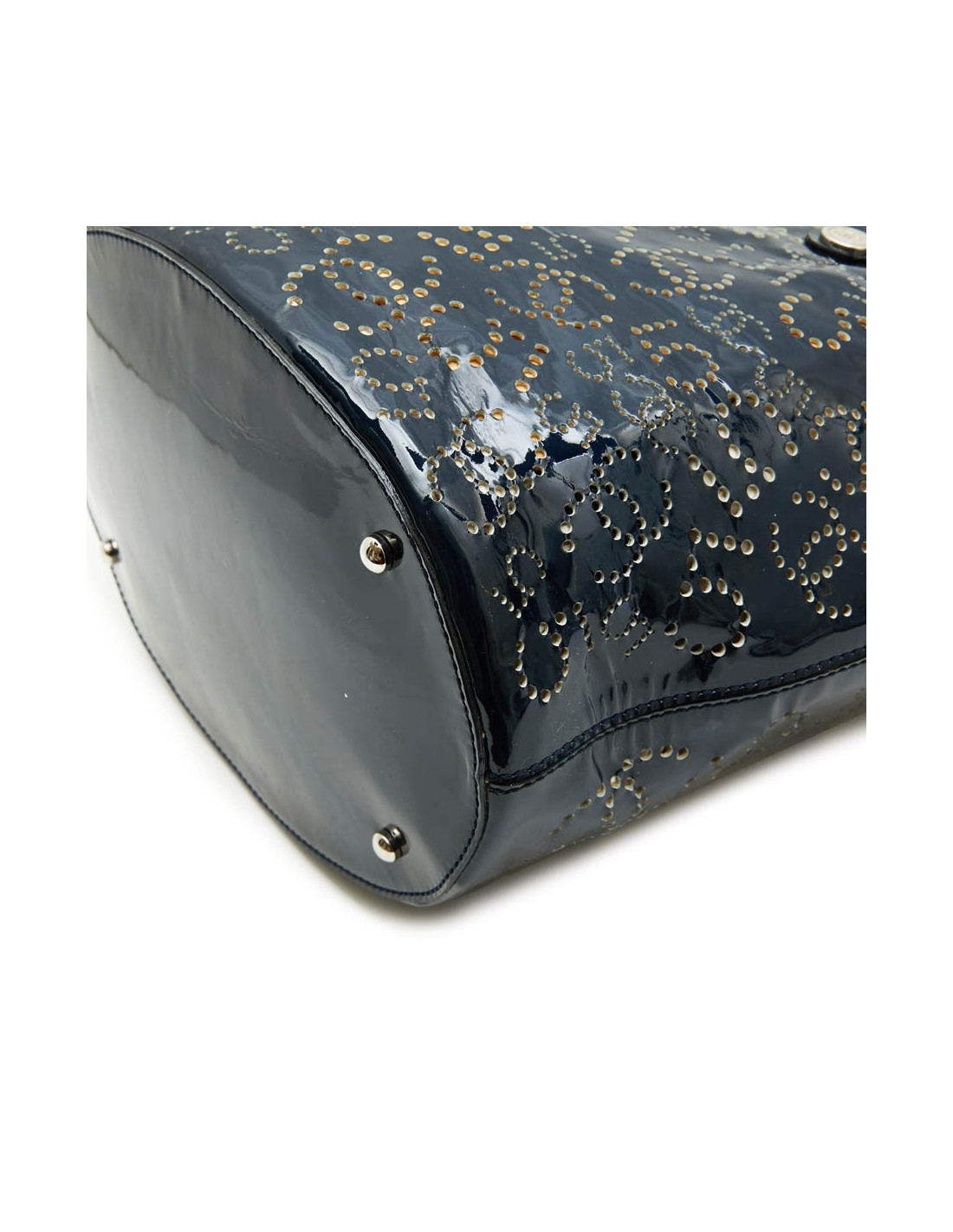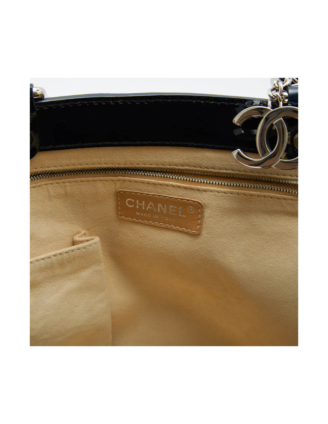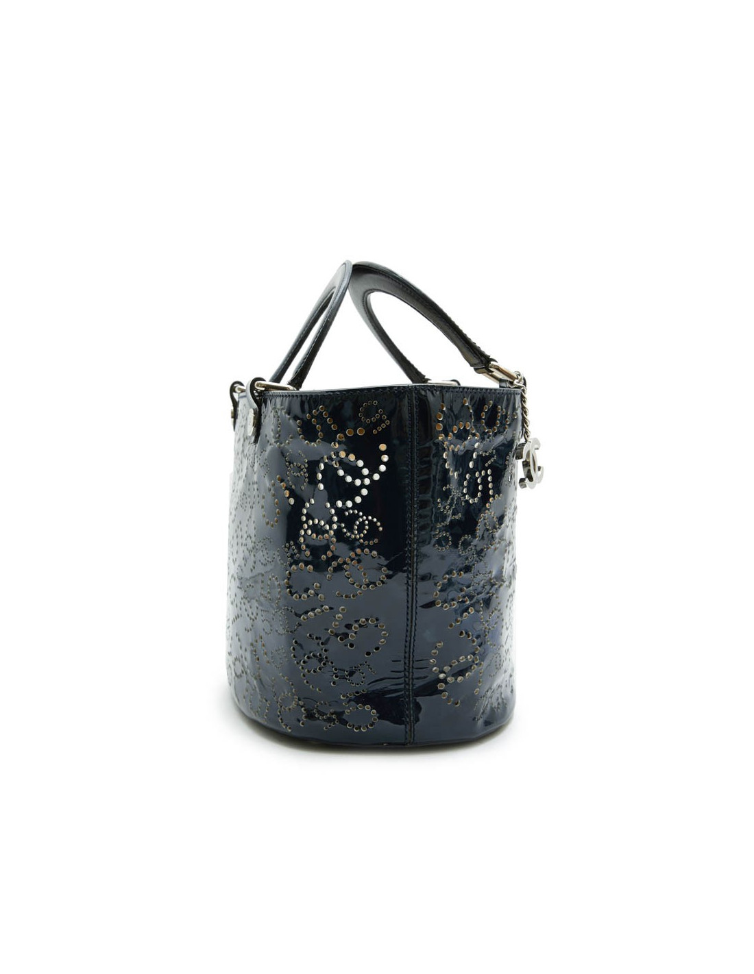 Chanel bag in perforated navy blue patent leather. Palladium silver metal hardware.