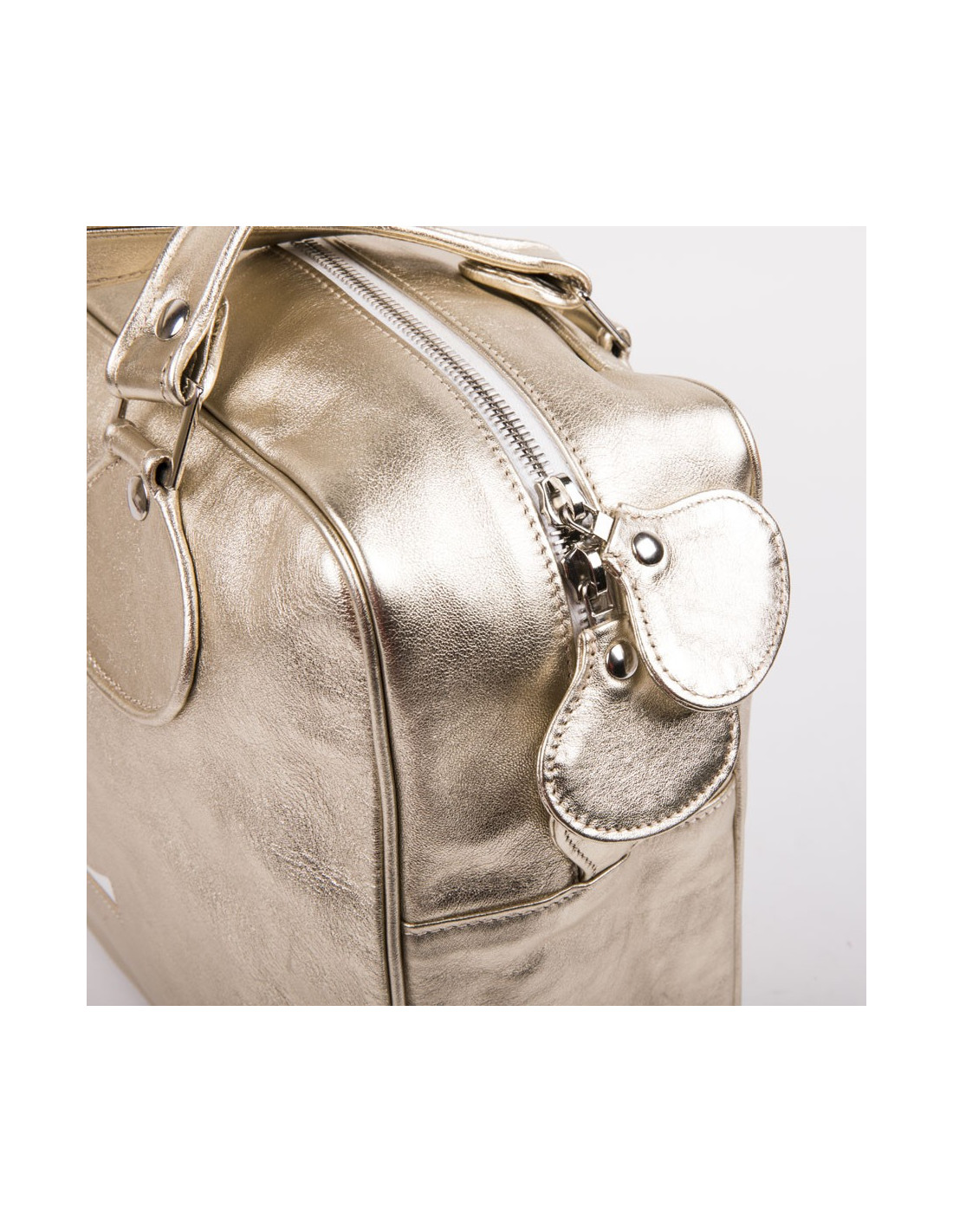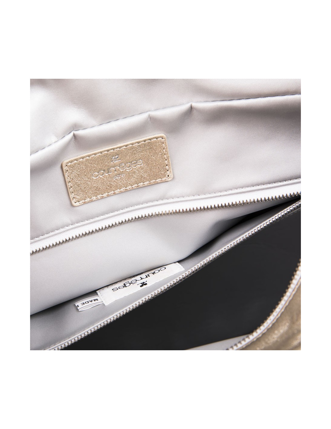 Courrèges bag in golden soft smooth lamb leather. Silver metal hardware. Double zipper.