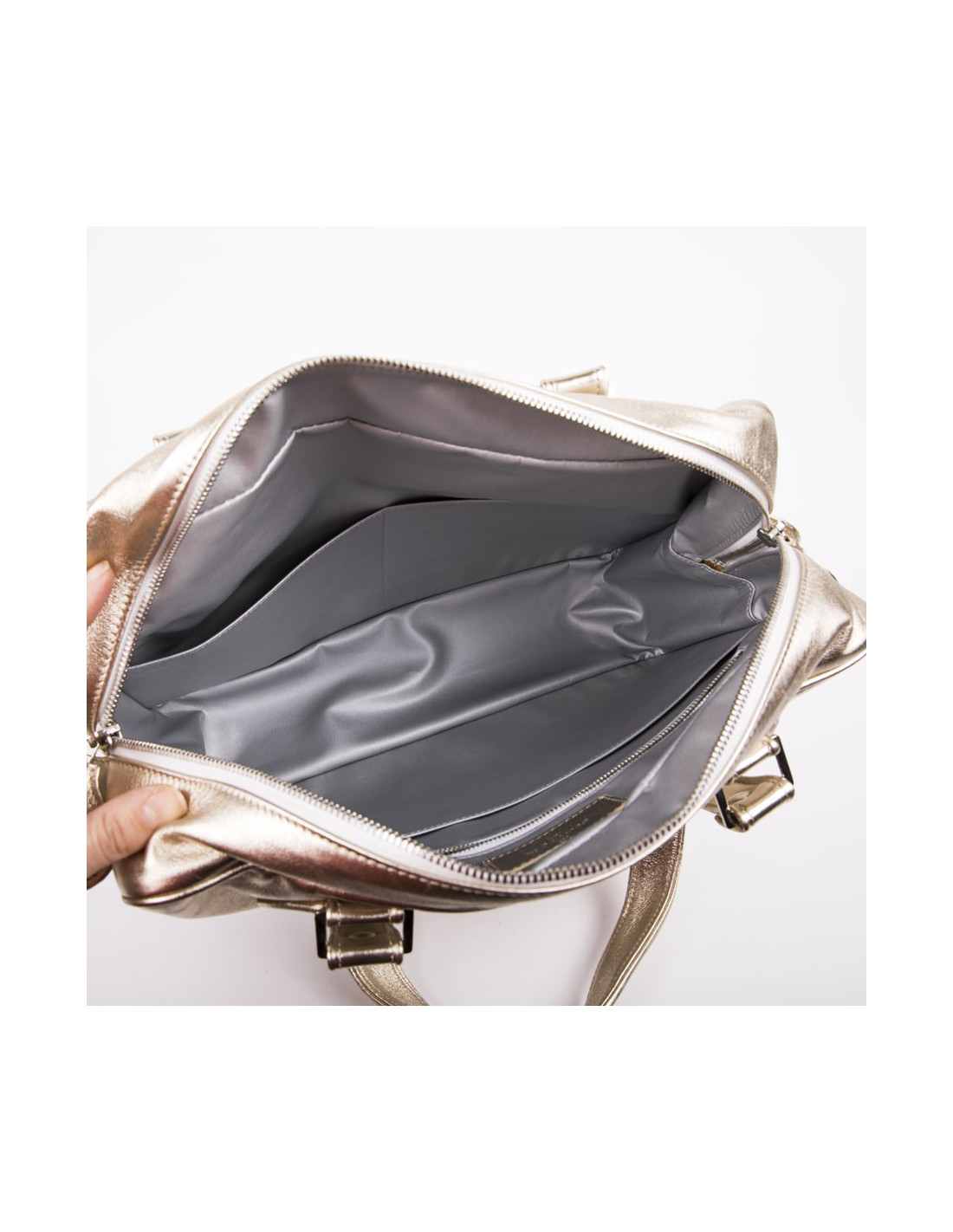 The interior is in matt silver fabric with many compartments including a zipped pocket.