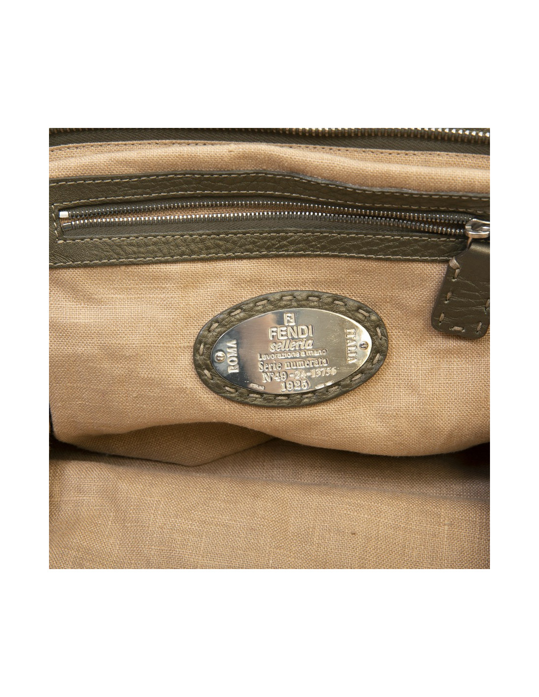 Fendi bag in green khaki grained leather. Silver metal hardware. Zip closure. The interior is in beige linen fabric with a zipped pocket.