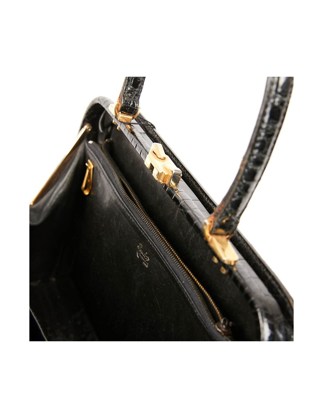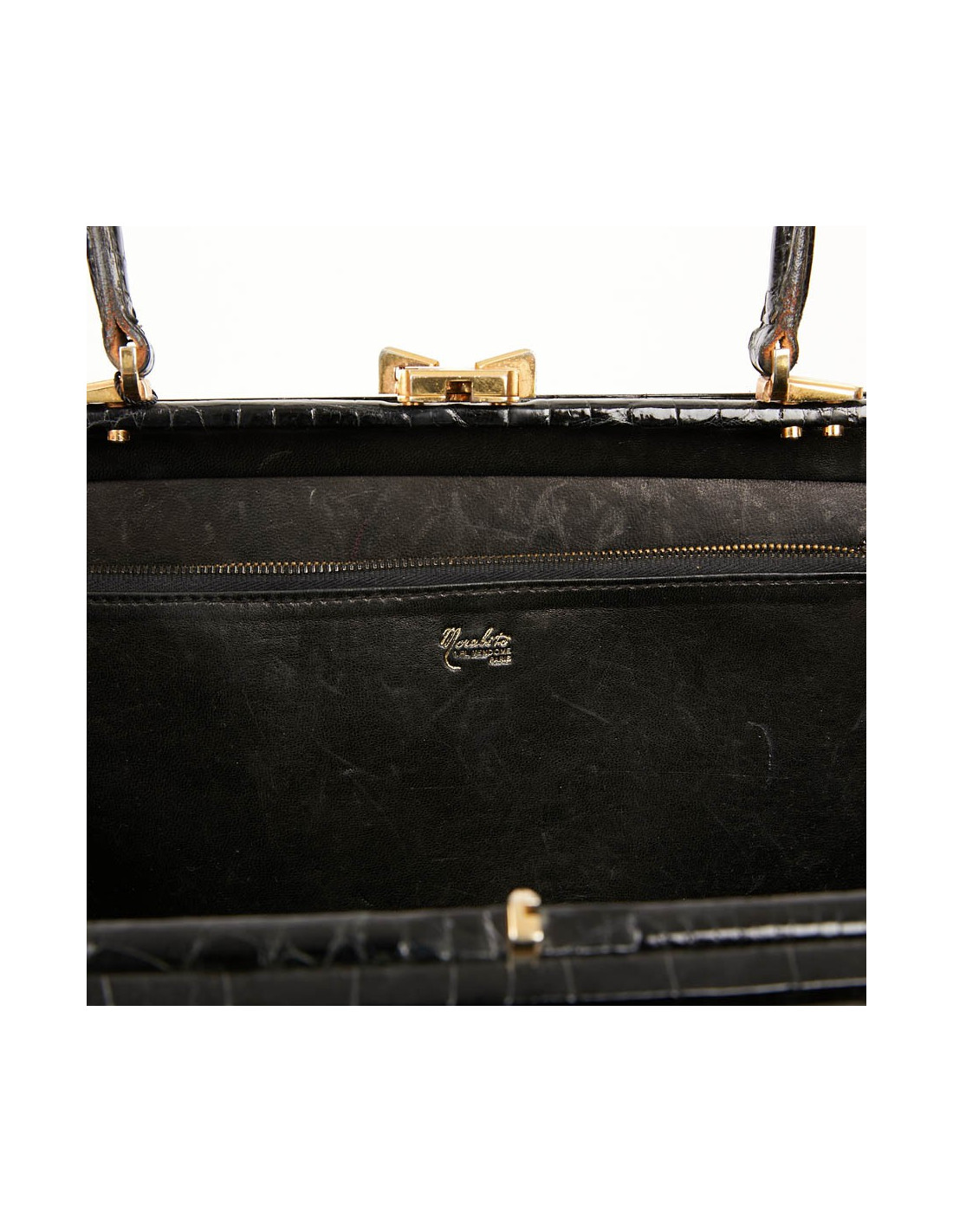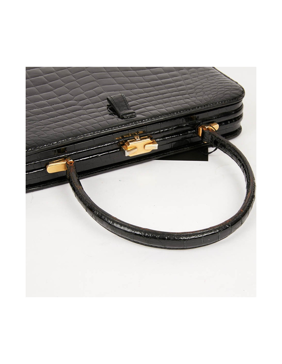This vintage MORABITO bag is in black crocodile. The hardware is in aged gold metal, and closes with a snap fastener. It's in very good condition on the outside, but we're putting it in the “good condition” category because it's a little damaged on the inside (see photos). It can be carried by hand.