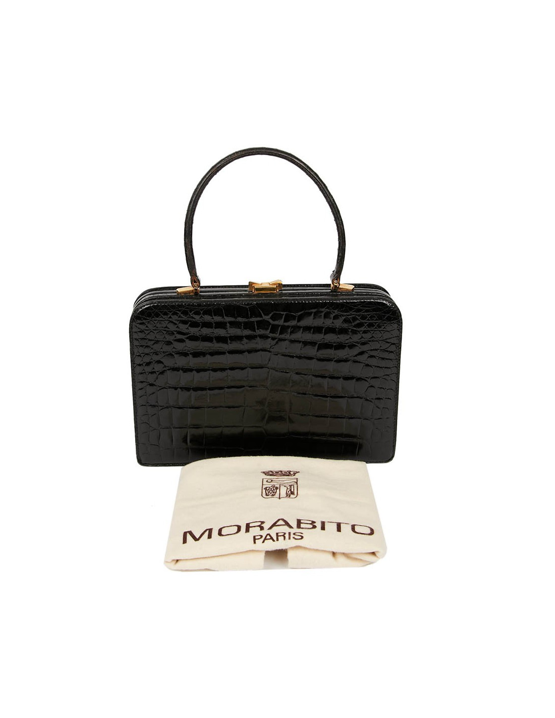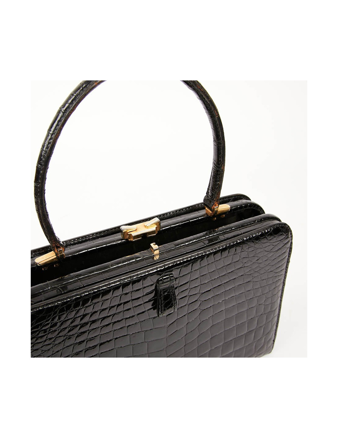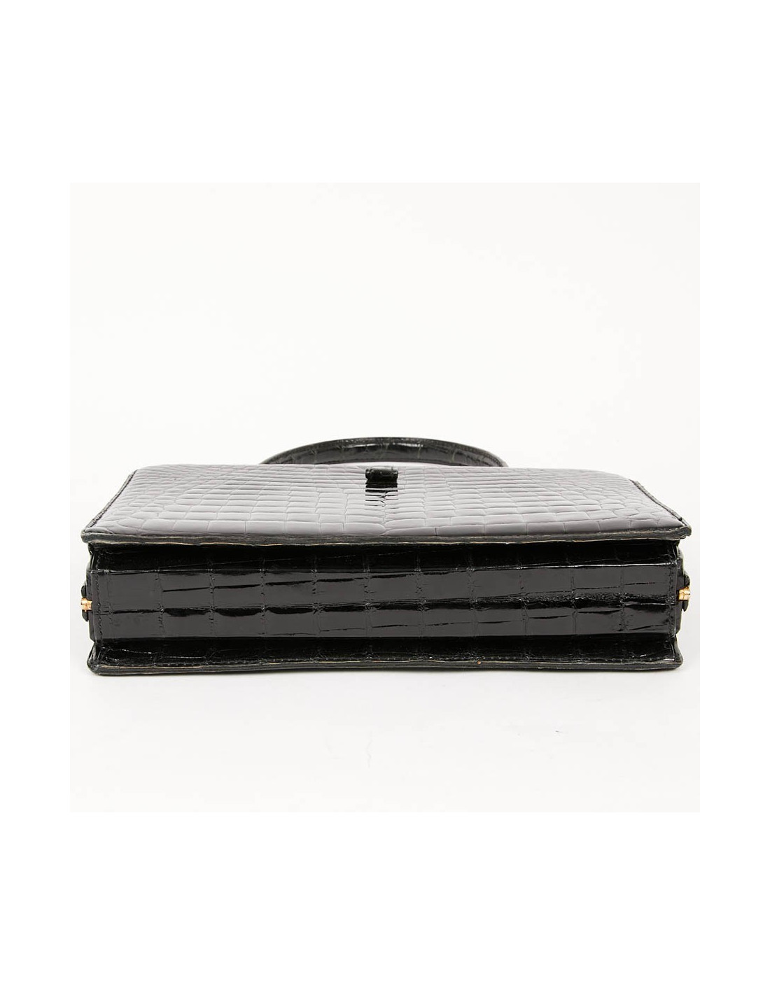 This vintage MORABITO bag is in black crocodile. The hardware is in aged gold metal, and closes with a snap fastener. It's in very good condition on the outside, but we're putting it in the “good condition” category because it's a little damaged on the inside (see photos). It can be carried by hand.