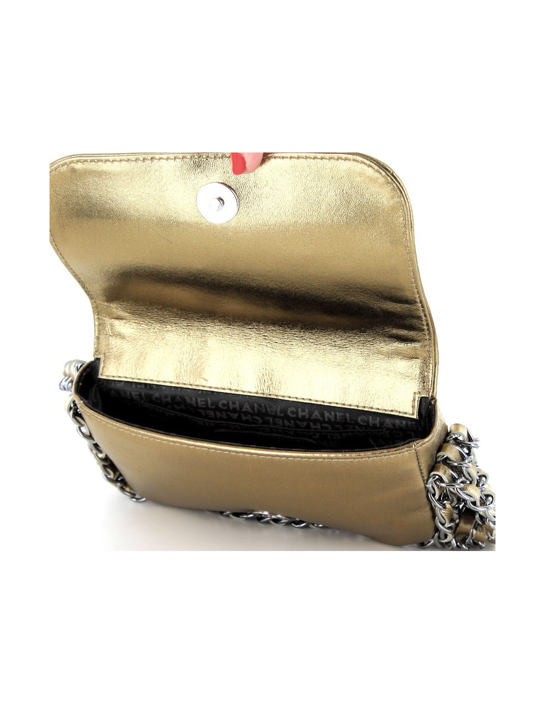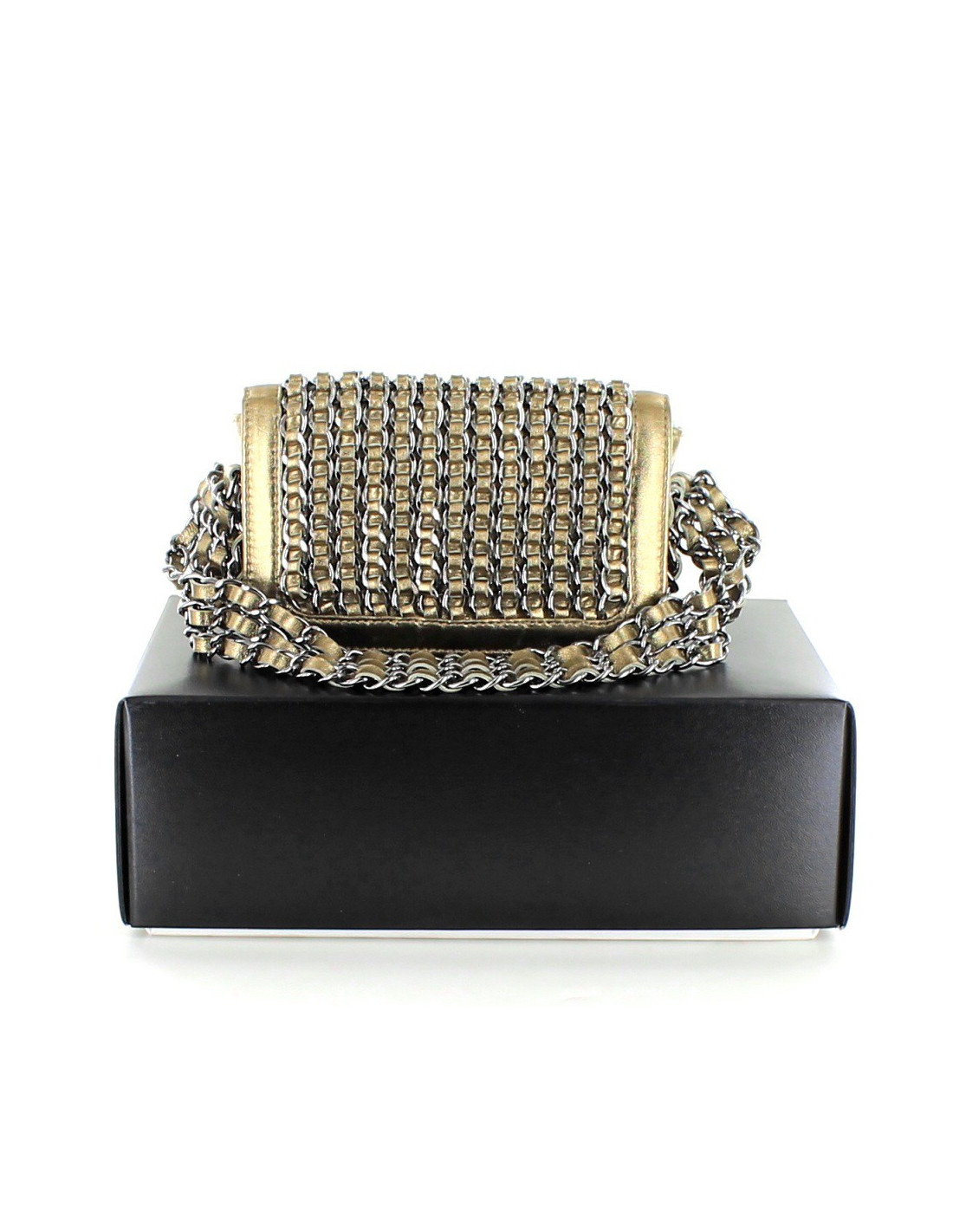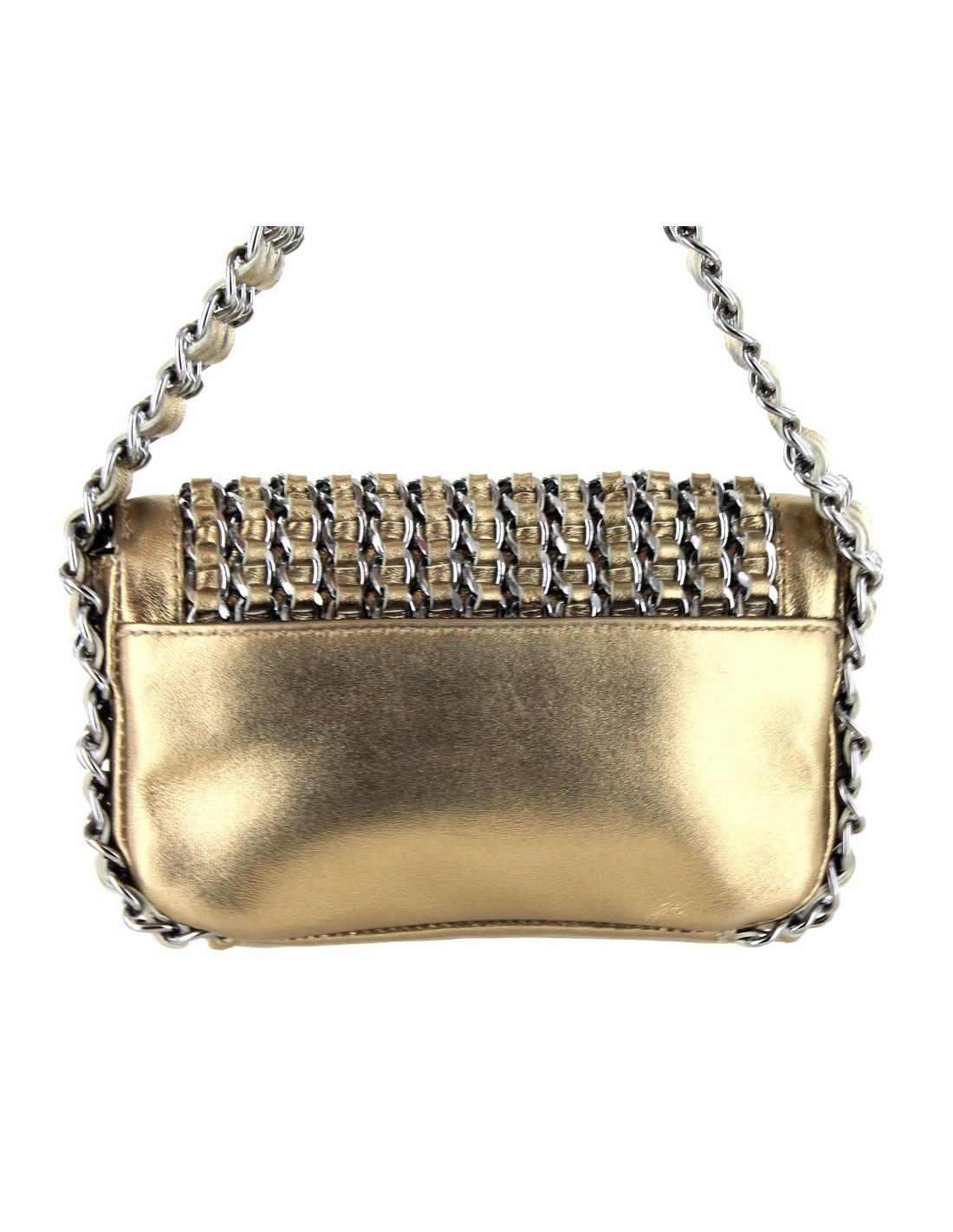 It is worn on the arm or the hand by a shoulder strap consisting of 3 chains intertwined by leather ribbons of 37 cm.