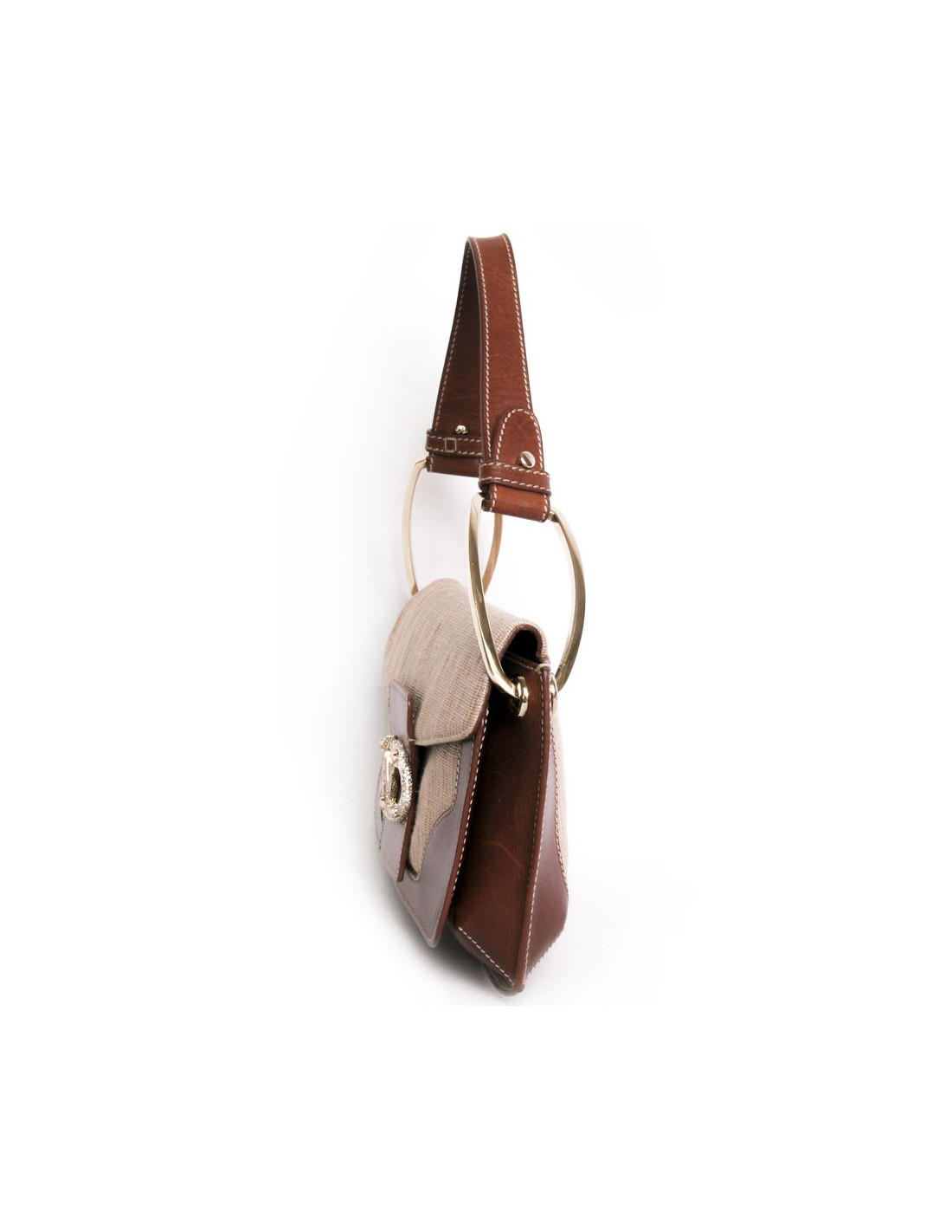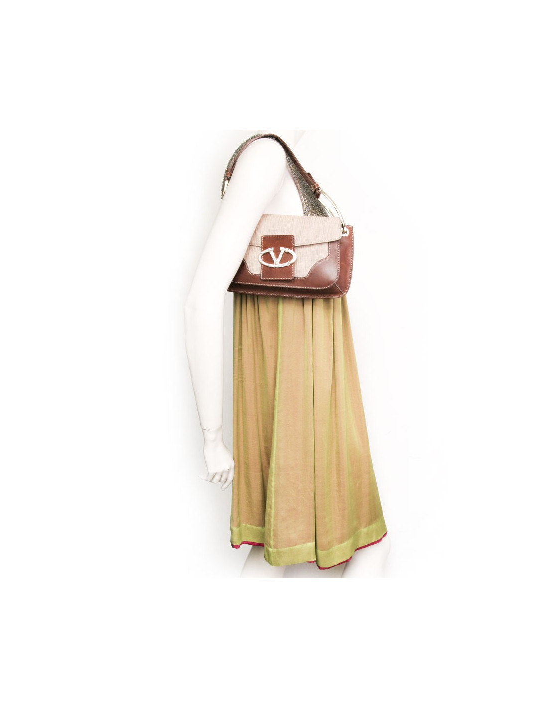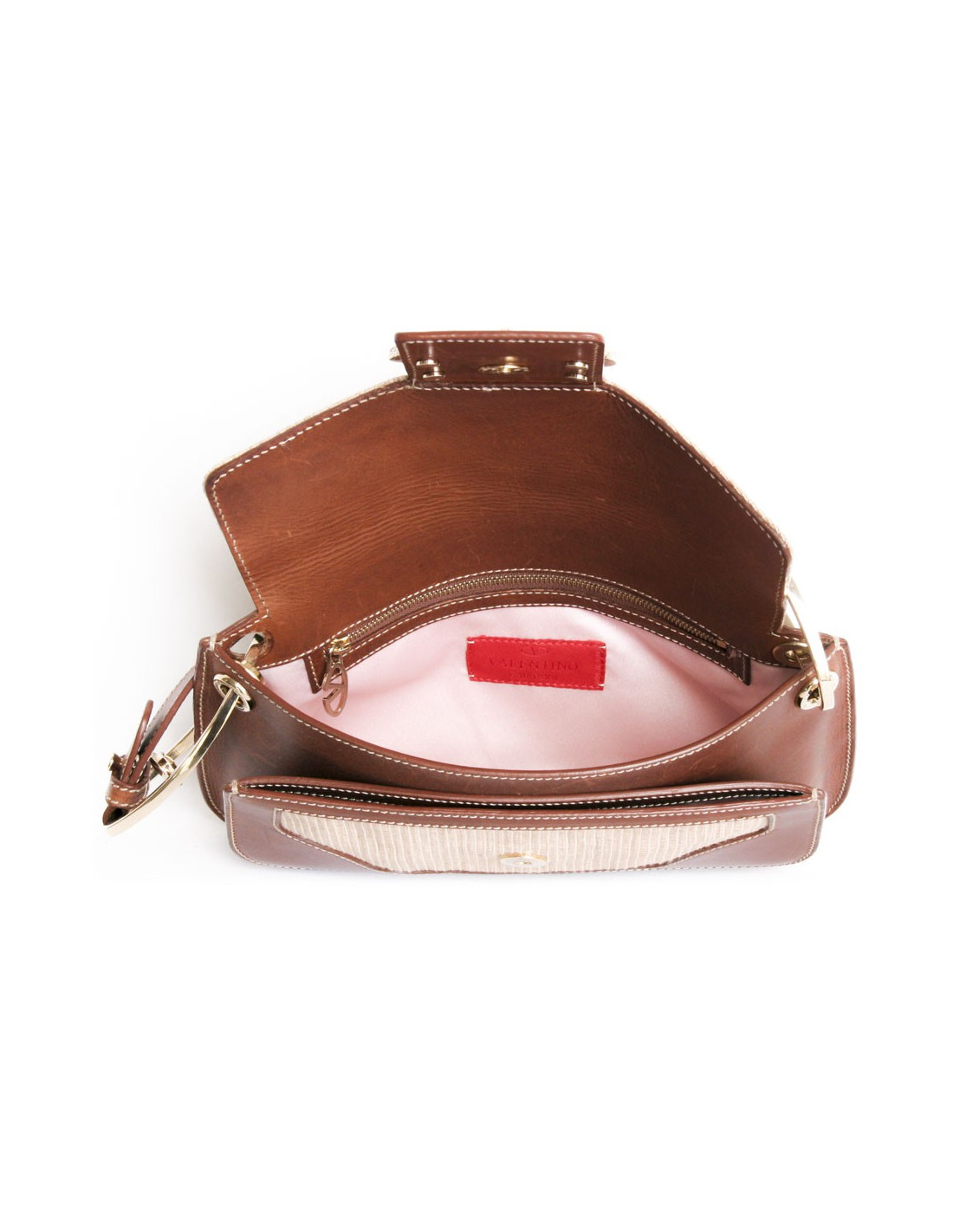 Valentin Garavani bag, fiberglass abaca and cognac leather. It is worn on the shoulder.