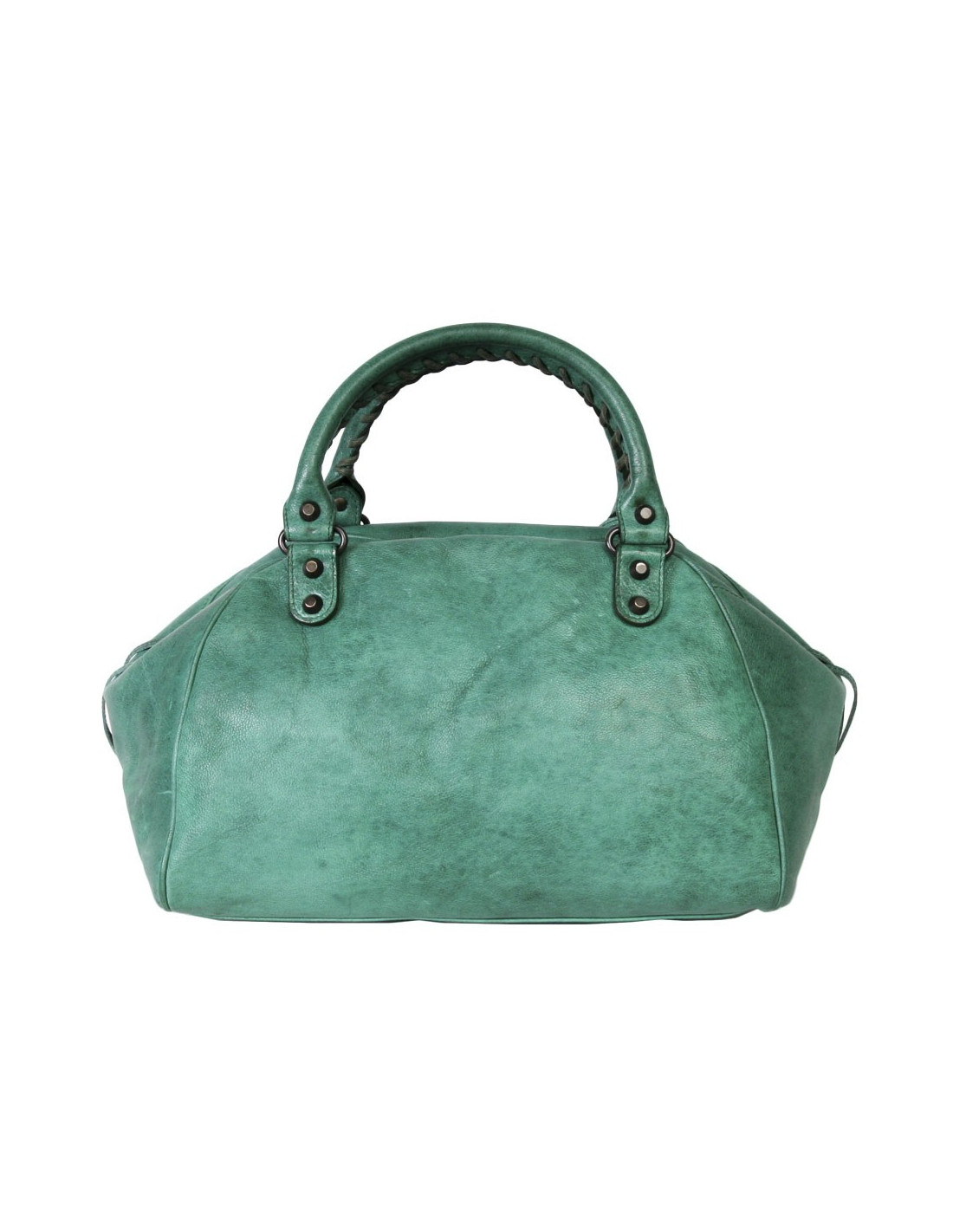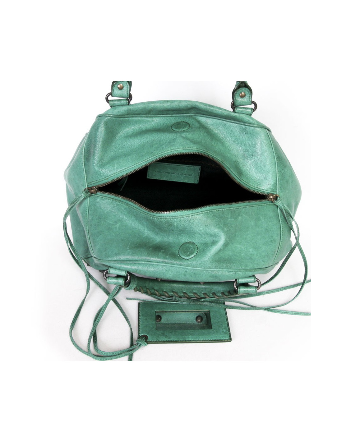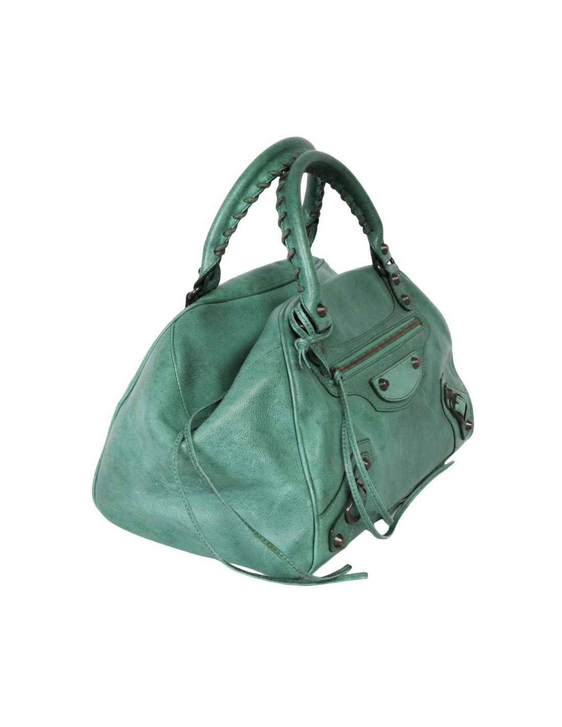 Bag Balenciaga green leather, aged brass jewelry. Very original closure by a zipper and two magnets to folding and masking the latter. Impeccable Interior. Of light spots scattered on the bag (front, back, on the top). Light more clear traces on the front of the bag however on the leather Balenciaga antique effect, this gives a patina effect.