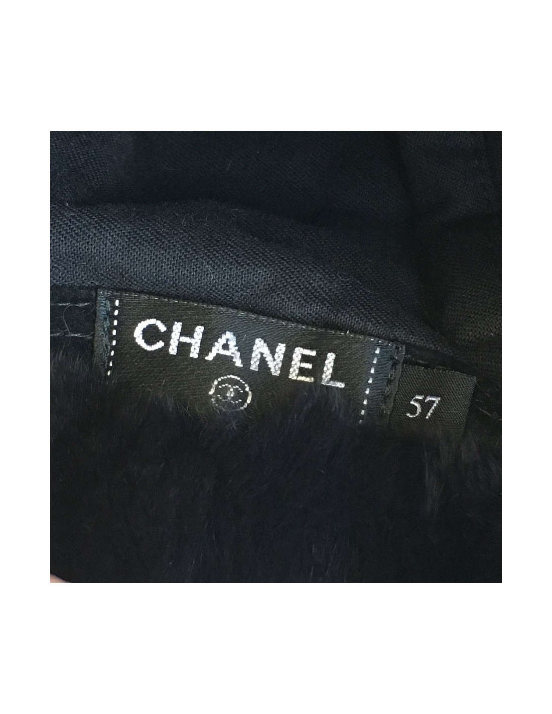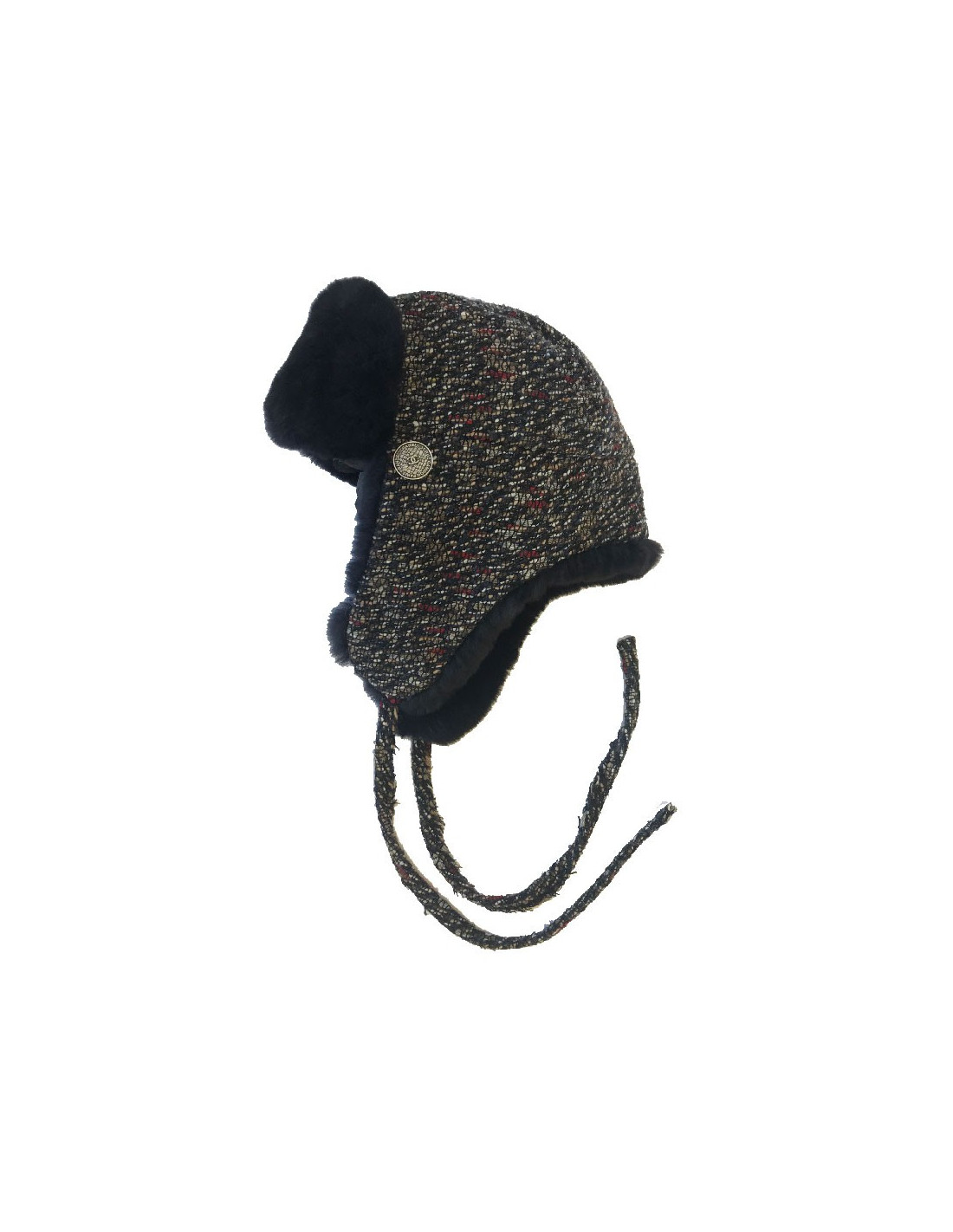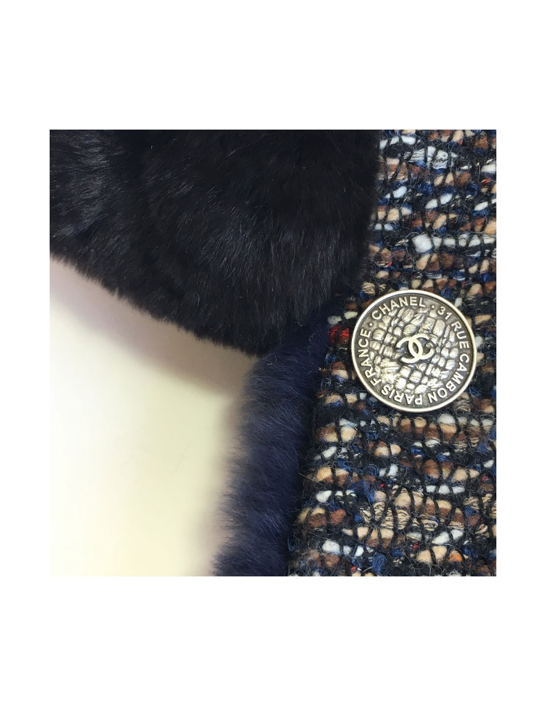 Details: Chanel chapka in multicolored tweed. The chapka is trimmed in black and blue orylag around the face.
