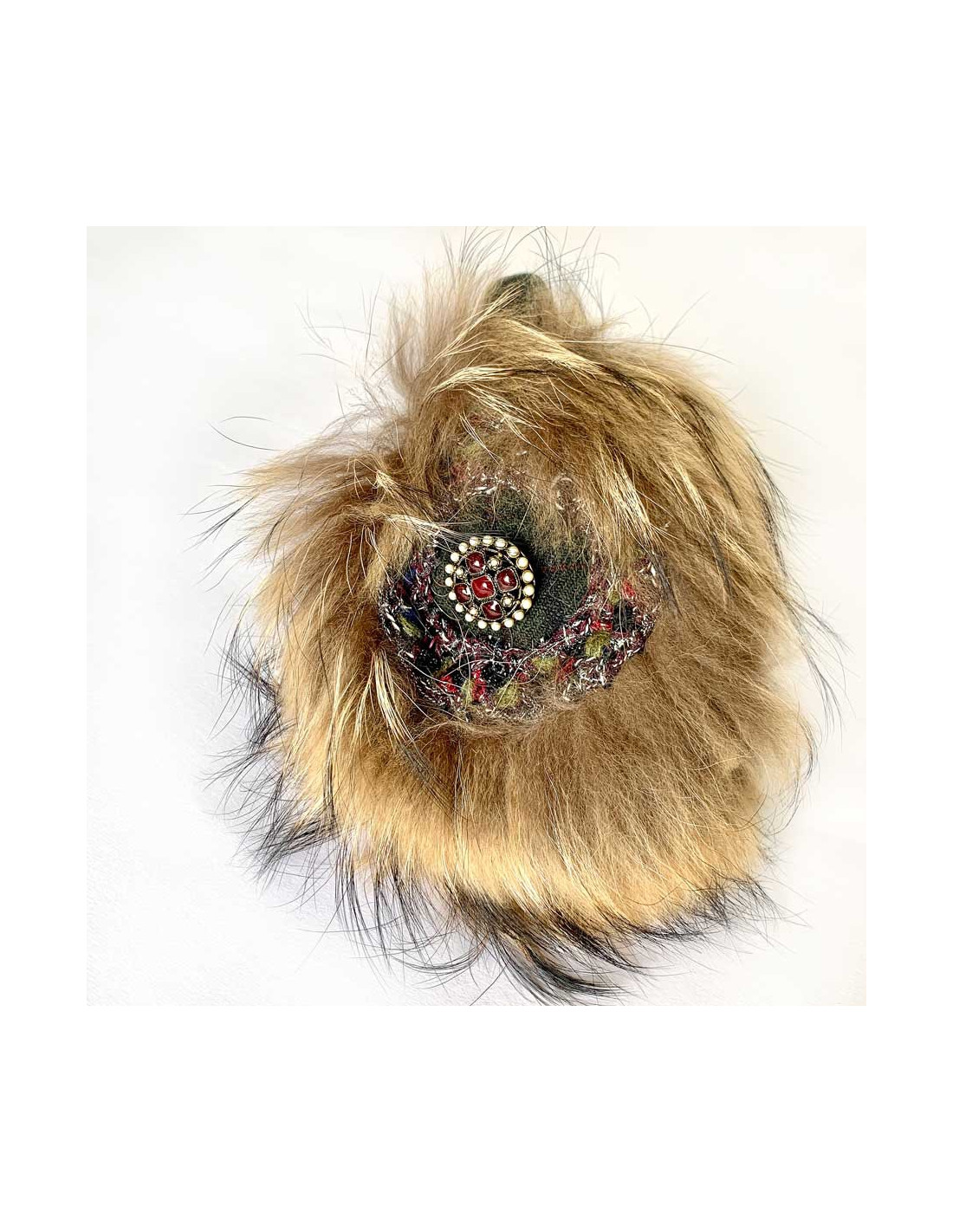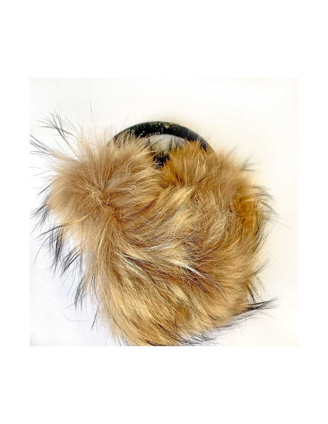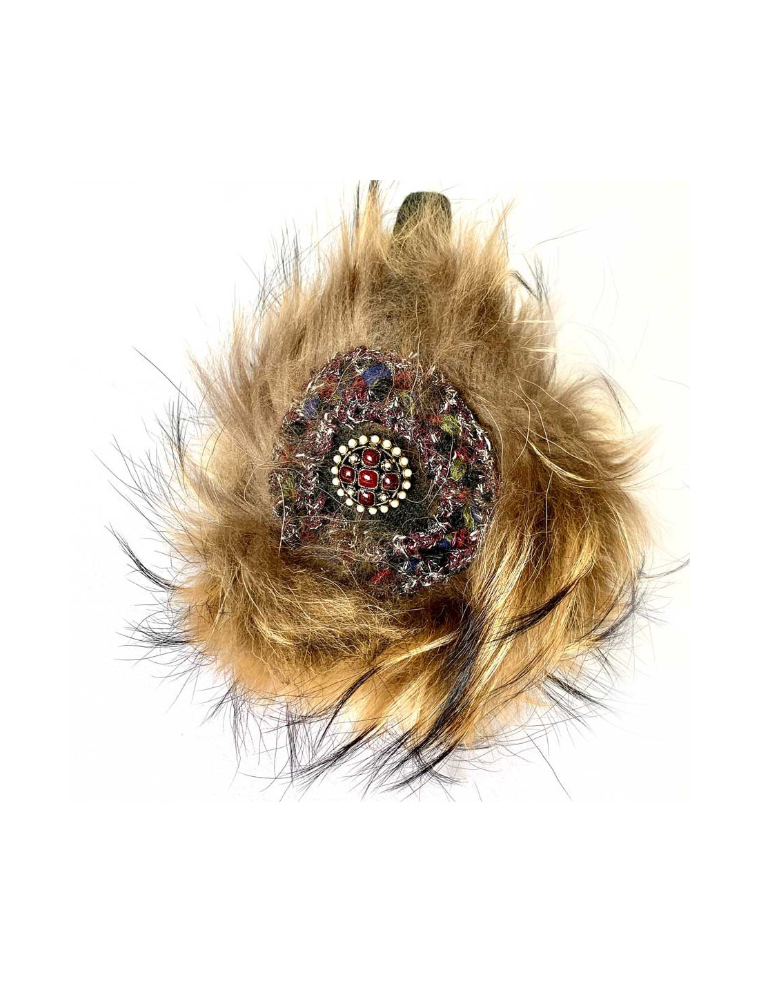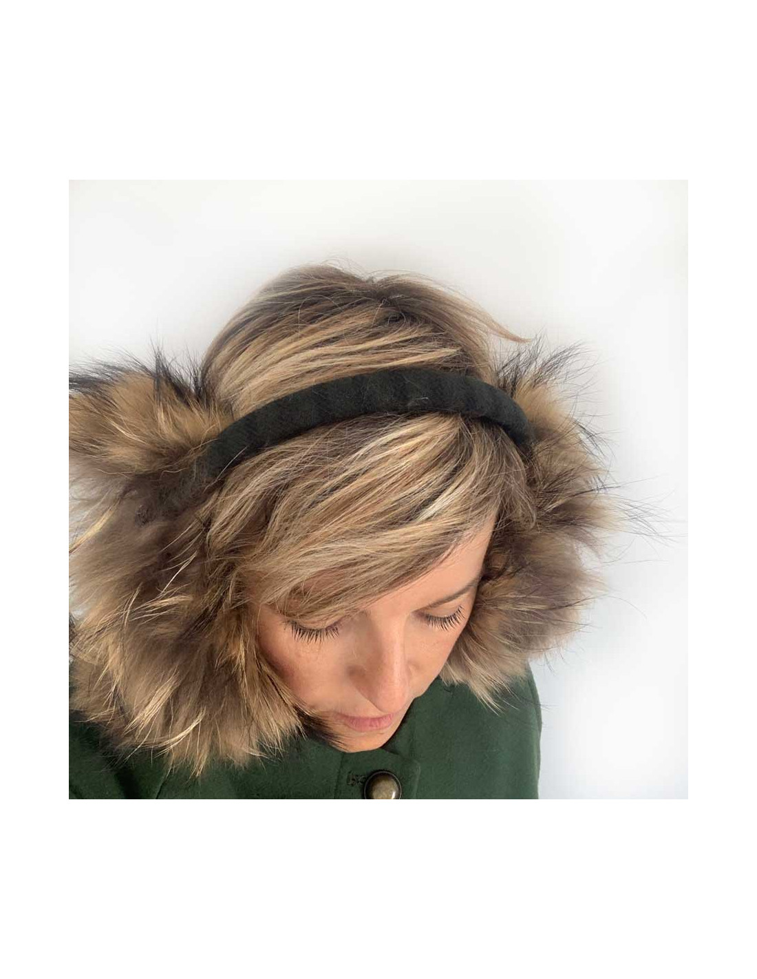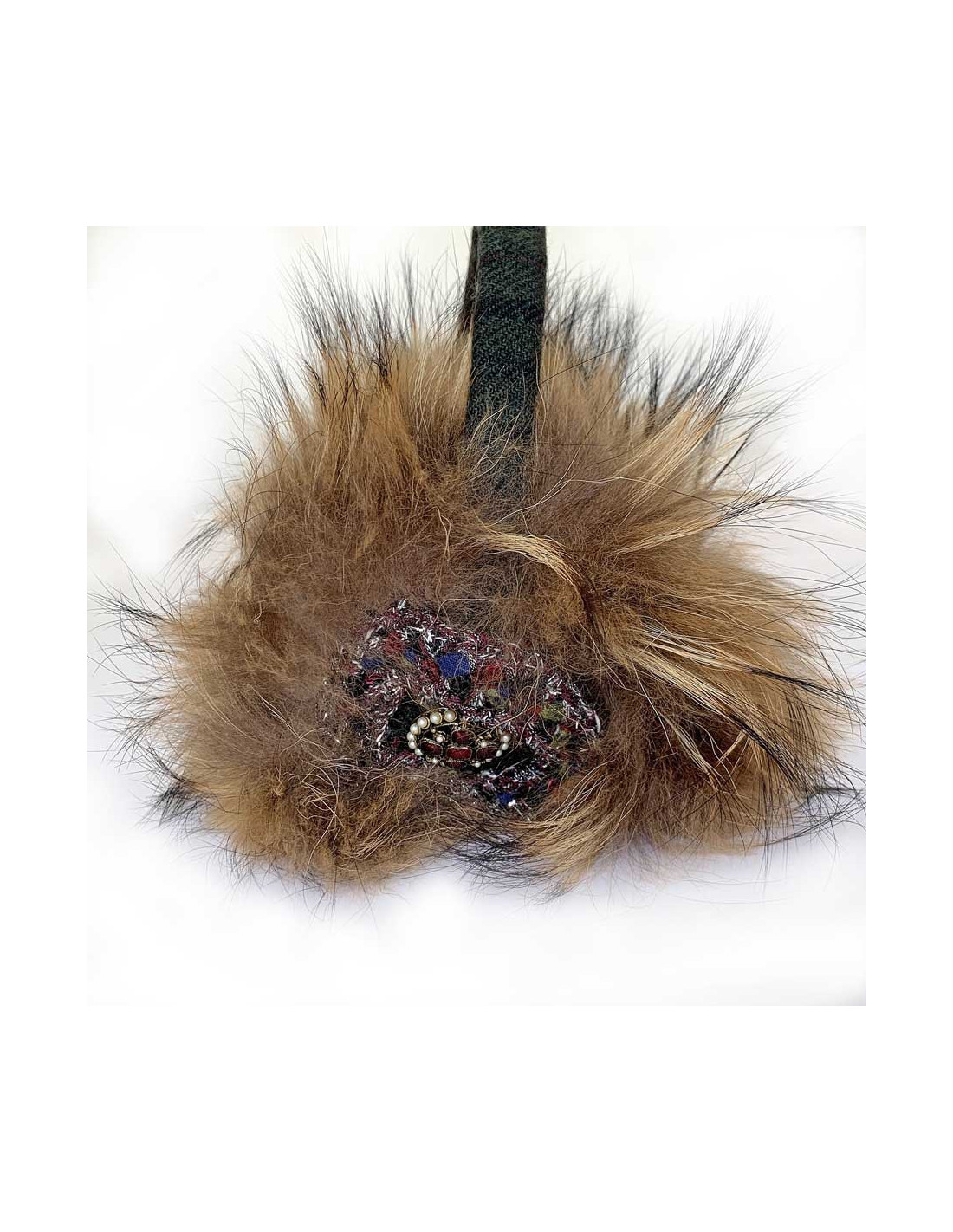 The headband is covered with a green, black striped Scottish fabric with fine Bordeaux lines. The earmuffs are in fur and adorned with a tweed circle, then a jewel button placed on the same fabric as the headband. The jewel button is in burgundy resin, it also has pearls and we see a small CC on it. At each fall-winter show, the French fashion house CHANEL imagines incredible earmuffs.