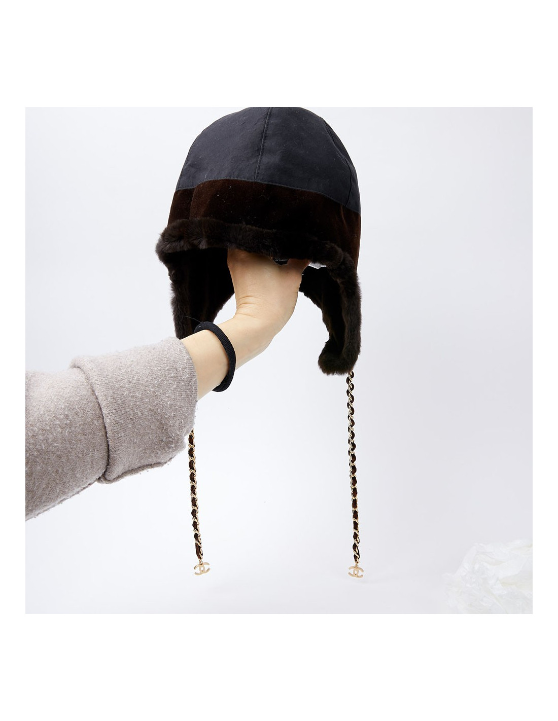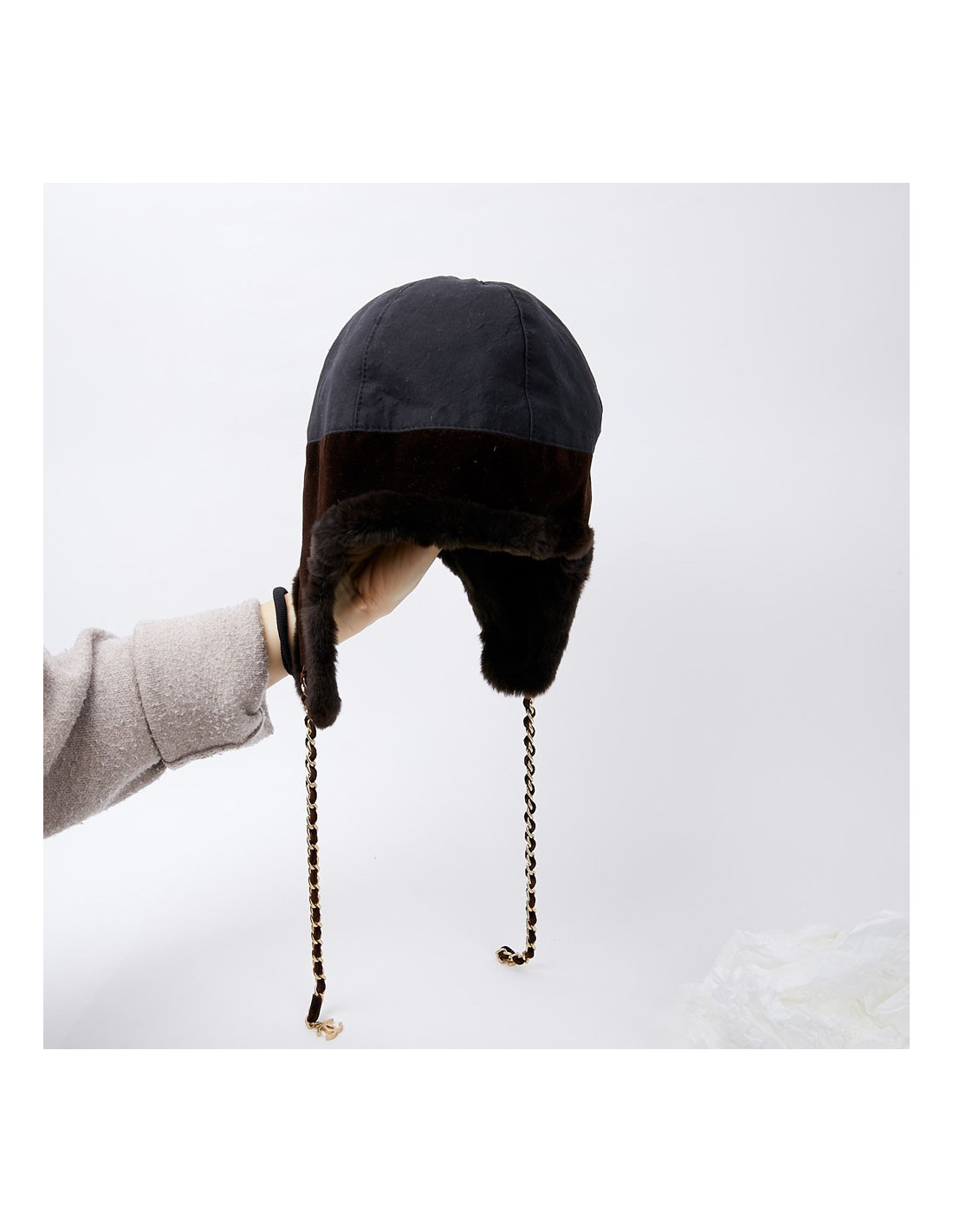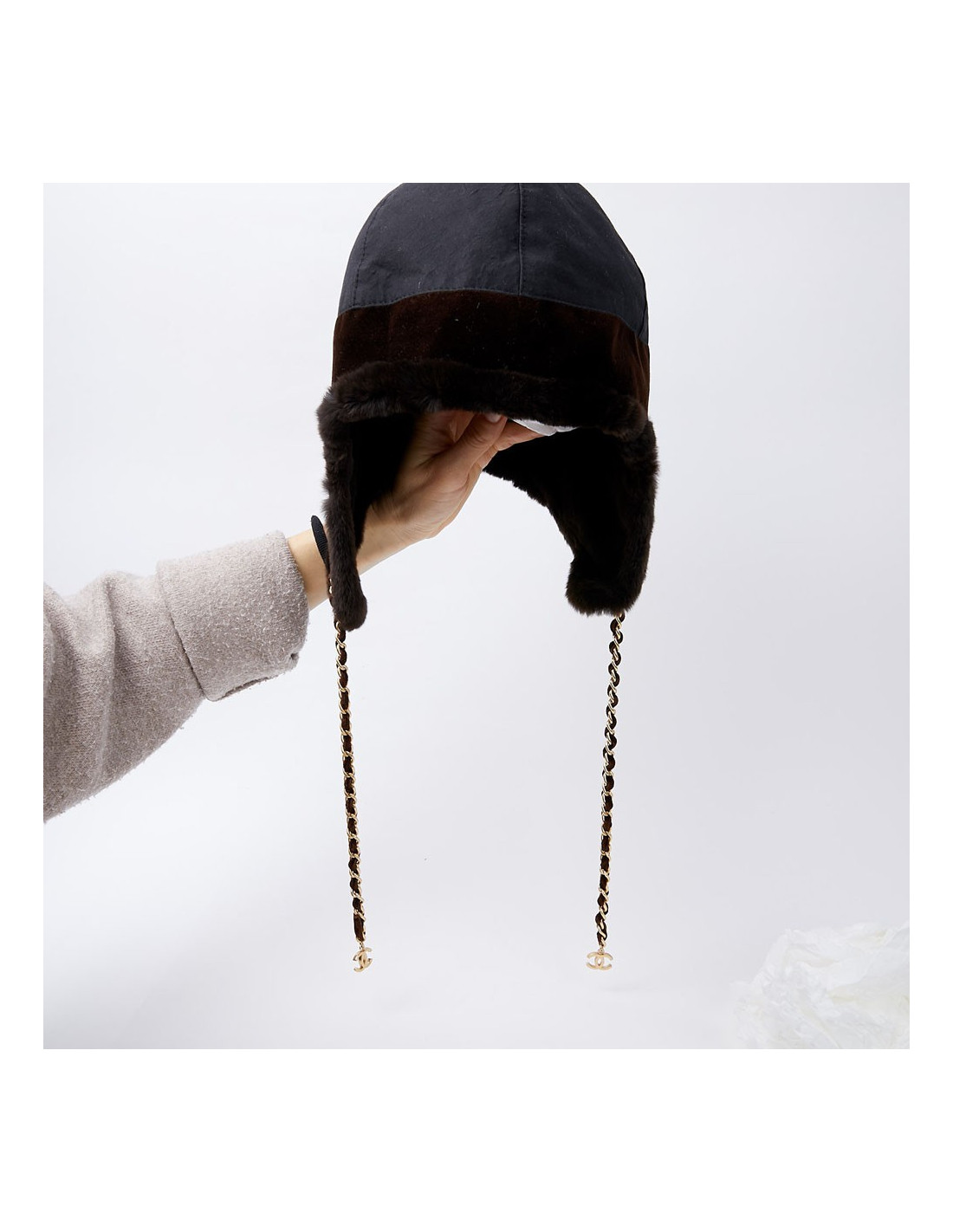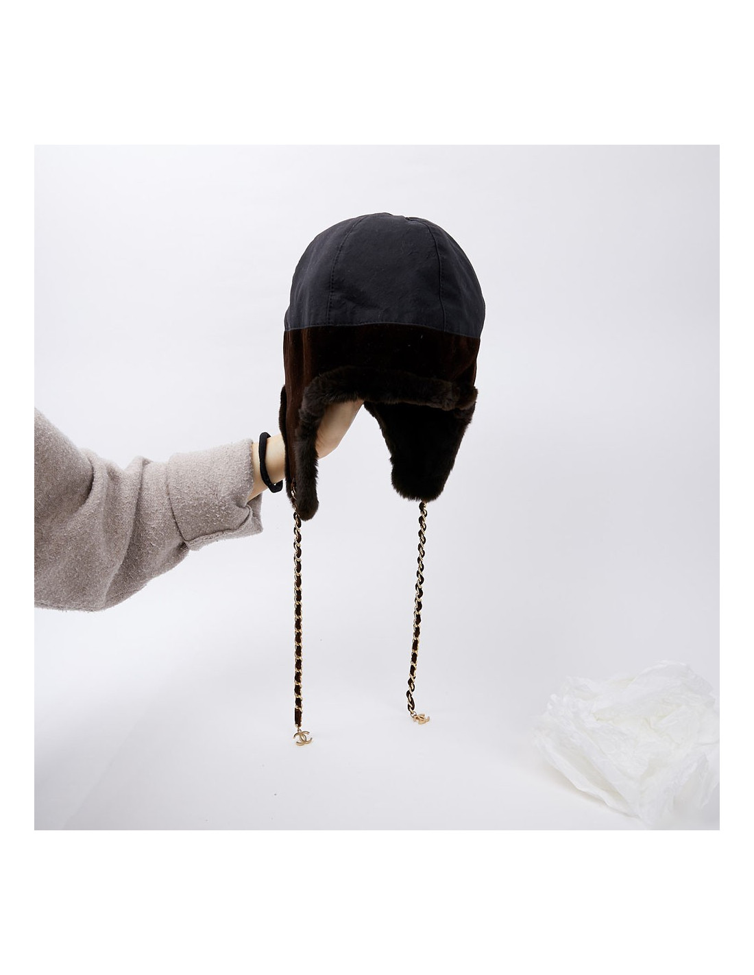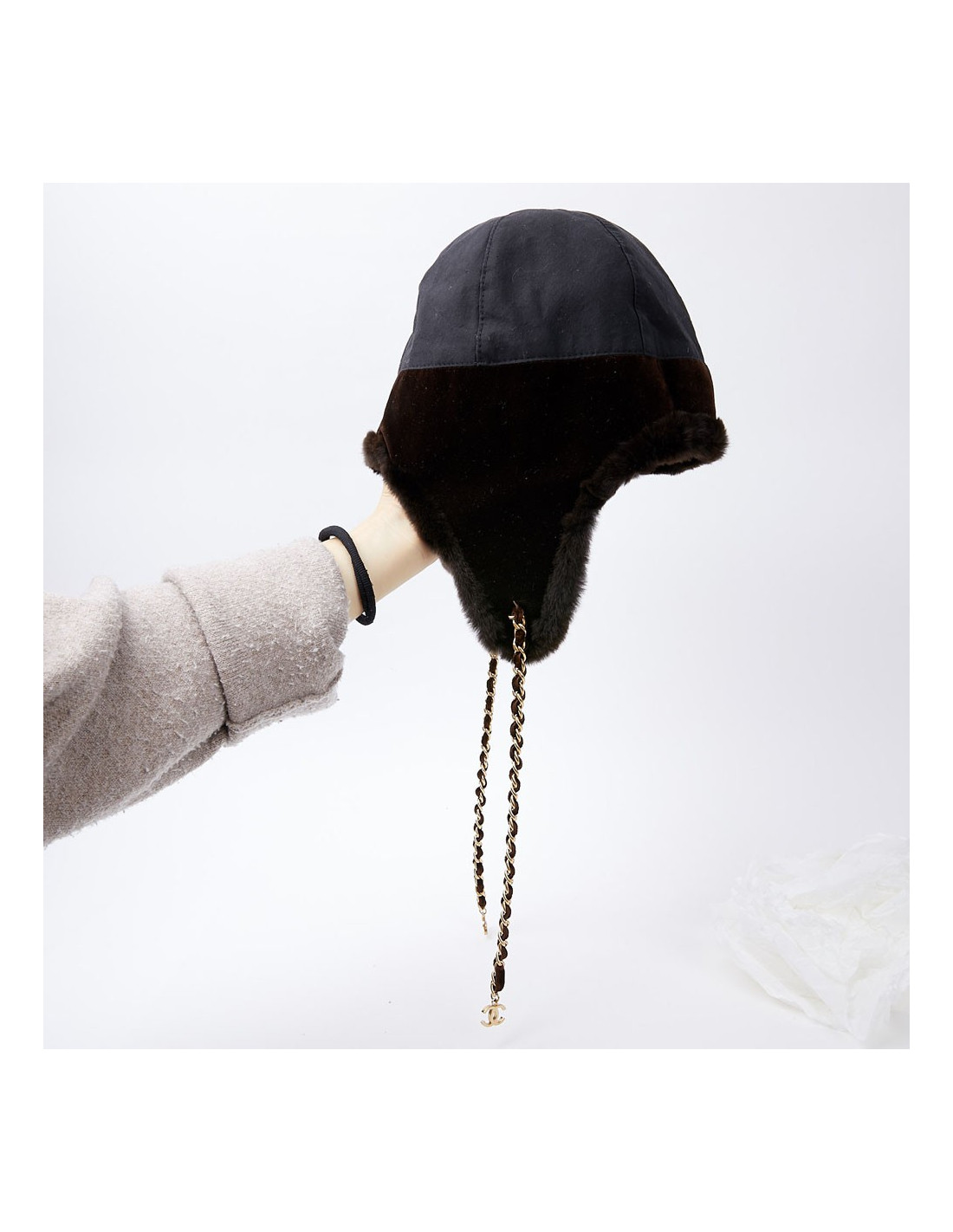 -91.00 € Sold HEADWEAR CHANEL tweed chapka size 57 CHANEL 23125 699.00 € 790.00 € CHANEL tweed and fur chapka size 57 Condition: newMaterials: tweed, orylag fur Colors: black, blue, multicolor tweedSize: 57Measurements: head circumference: 57cm, length on the sides: 20cmDetails: Chanel chapka in multicolored tweed. The chapka is trimmed in black and blue orylag around the face. Delivered in a Valois Vintage Paris pouch View