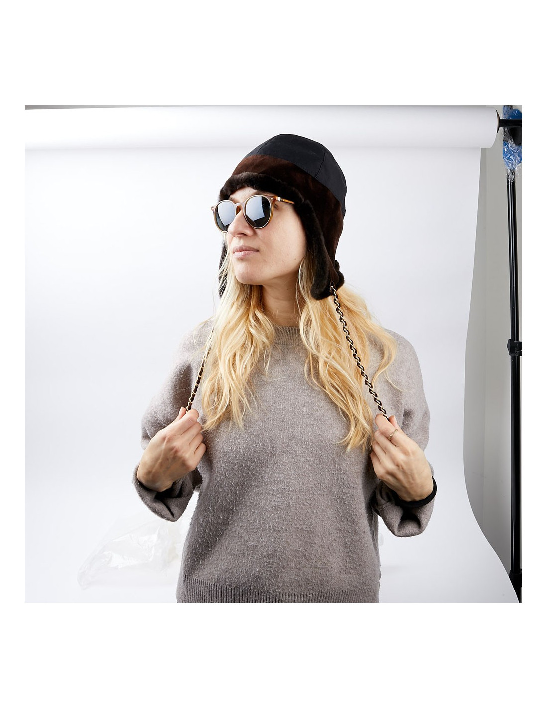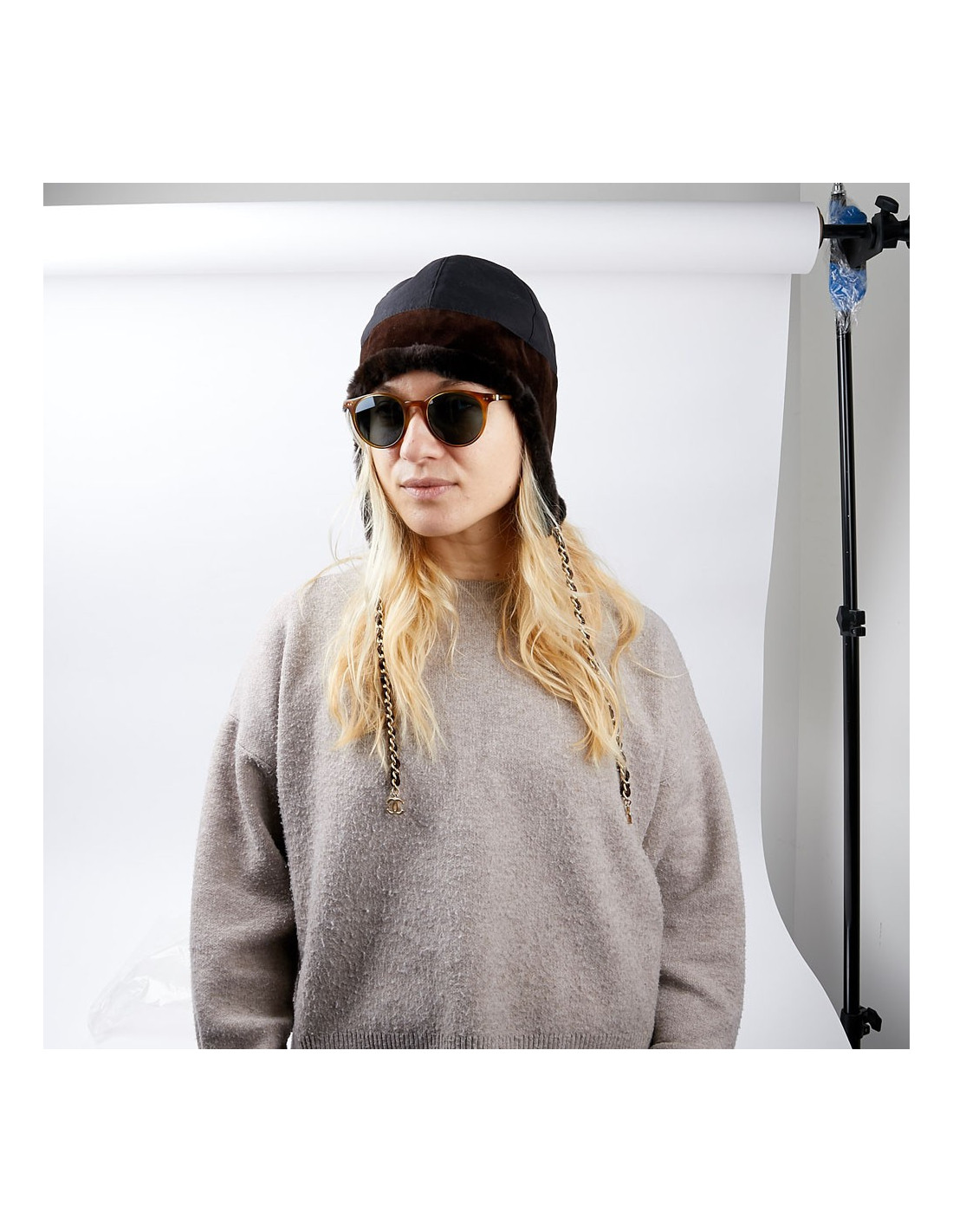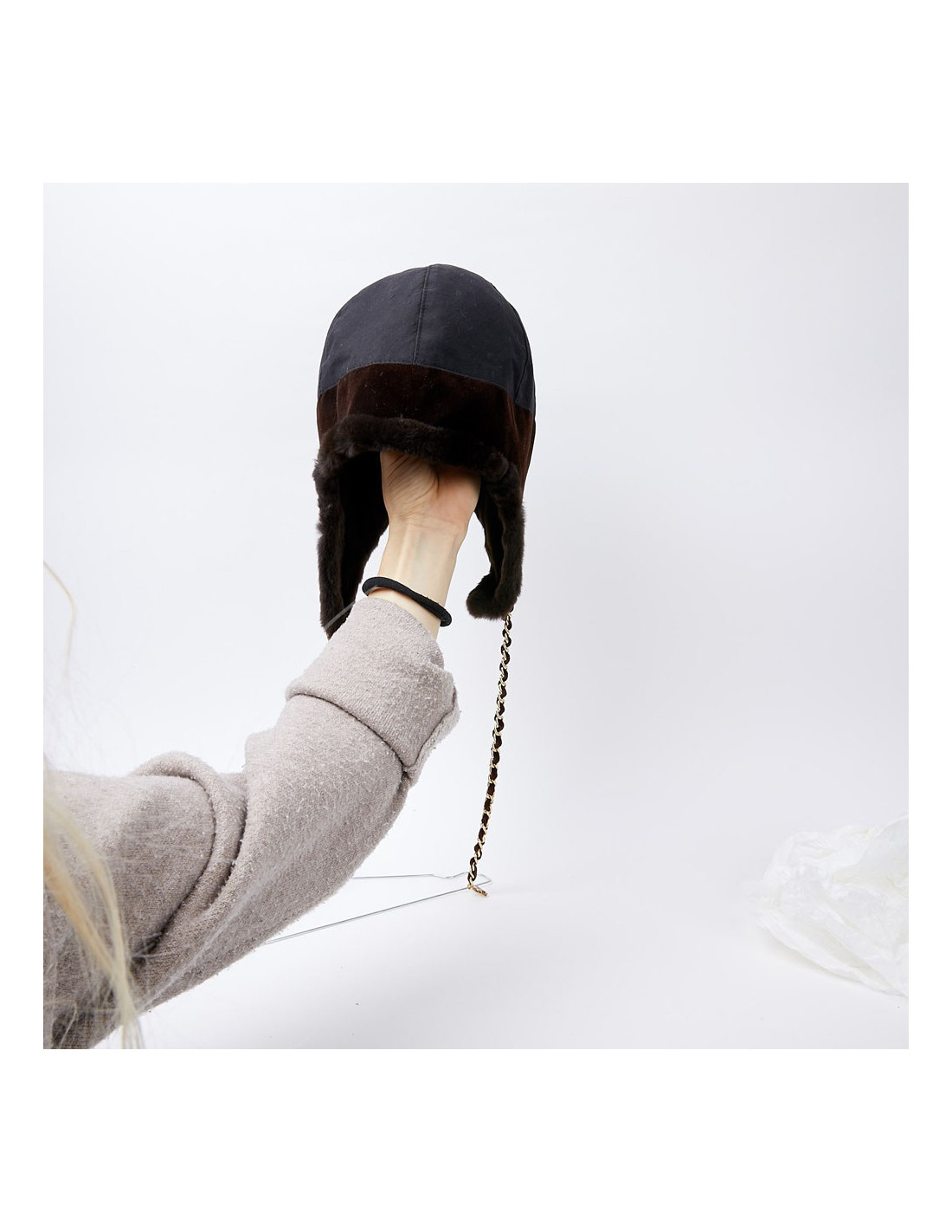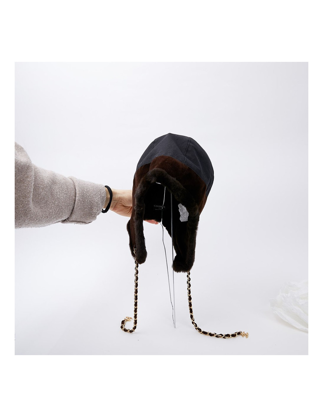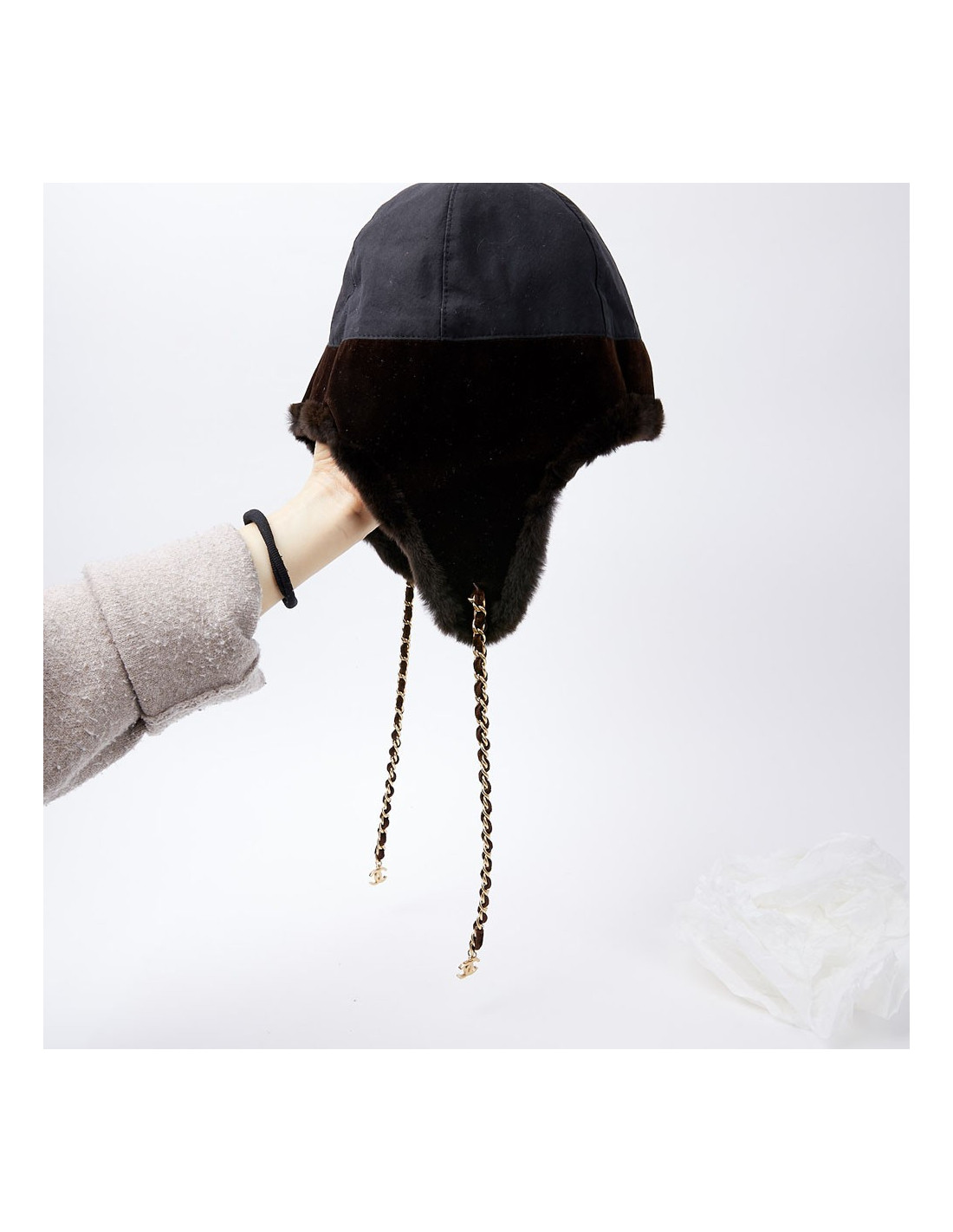 -91.00 € Sold HEADWEAR CHANEL tweed chapka size 57 CHANEL 23125 699.00 € 790.00 € CHANEL tweed and fur chapka size 57 Condition: newMaterials: tweed, orylag fur Colors: black, blue, multicolor tweedSize: 57Measurements: head circumference: 57cm, length on the sides: 20cmDetails: Chanel chapka in multicolored tweed. The chapka is trimmed in black and blue orylag around the face. Delivered in a Valois Vintage Paris pouch View