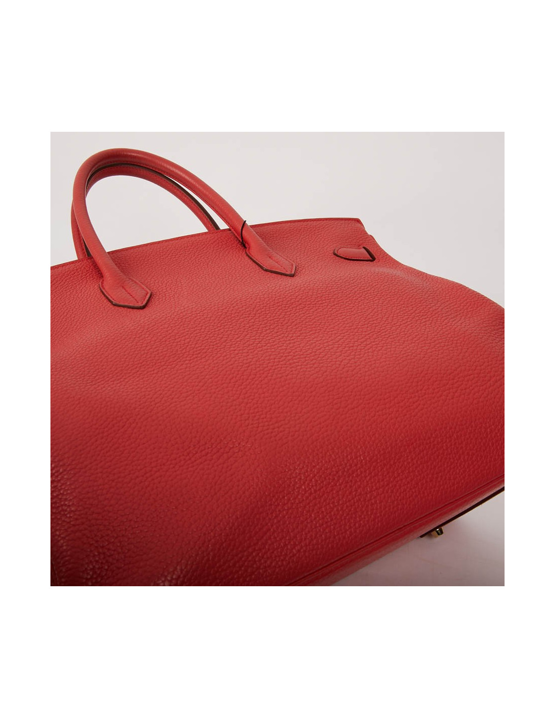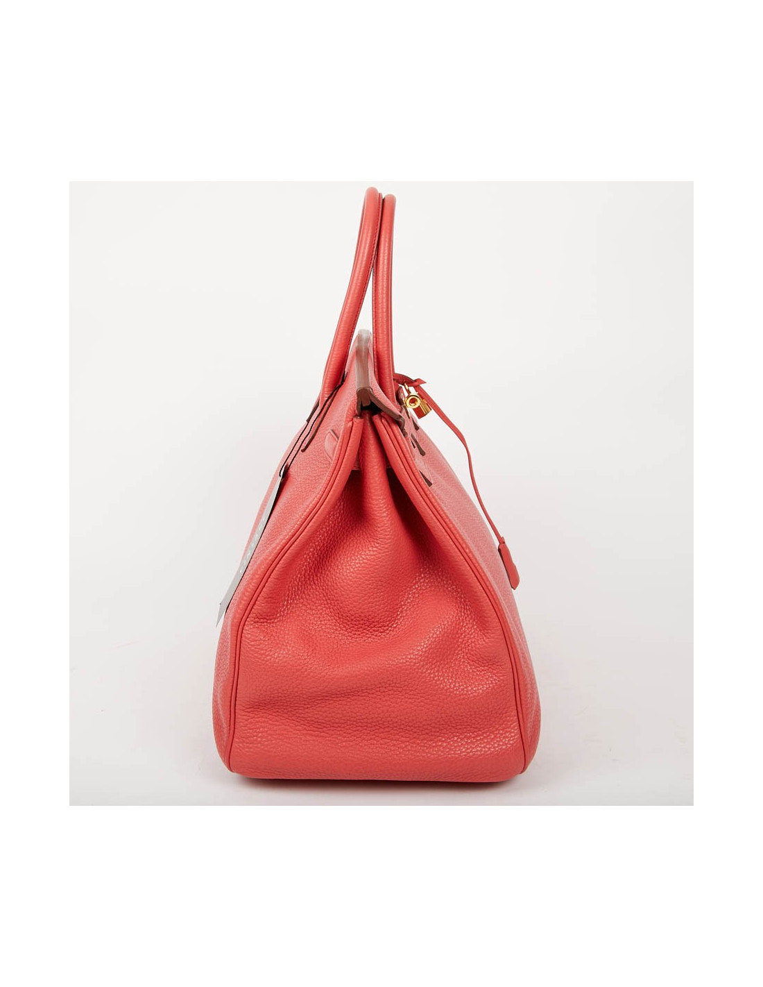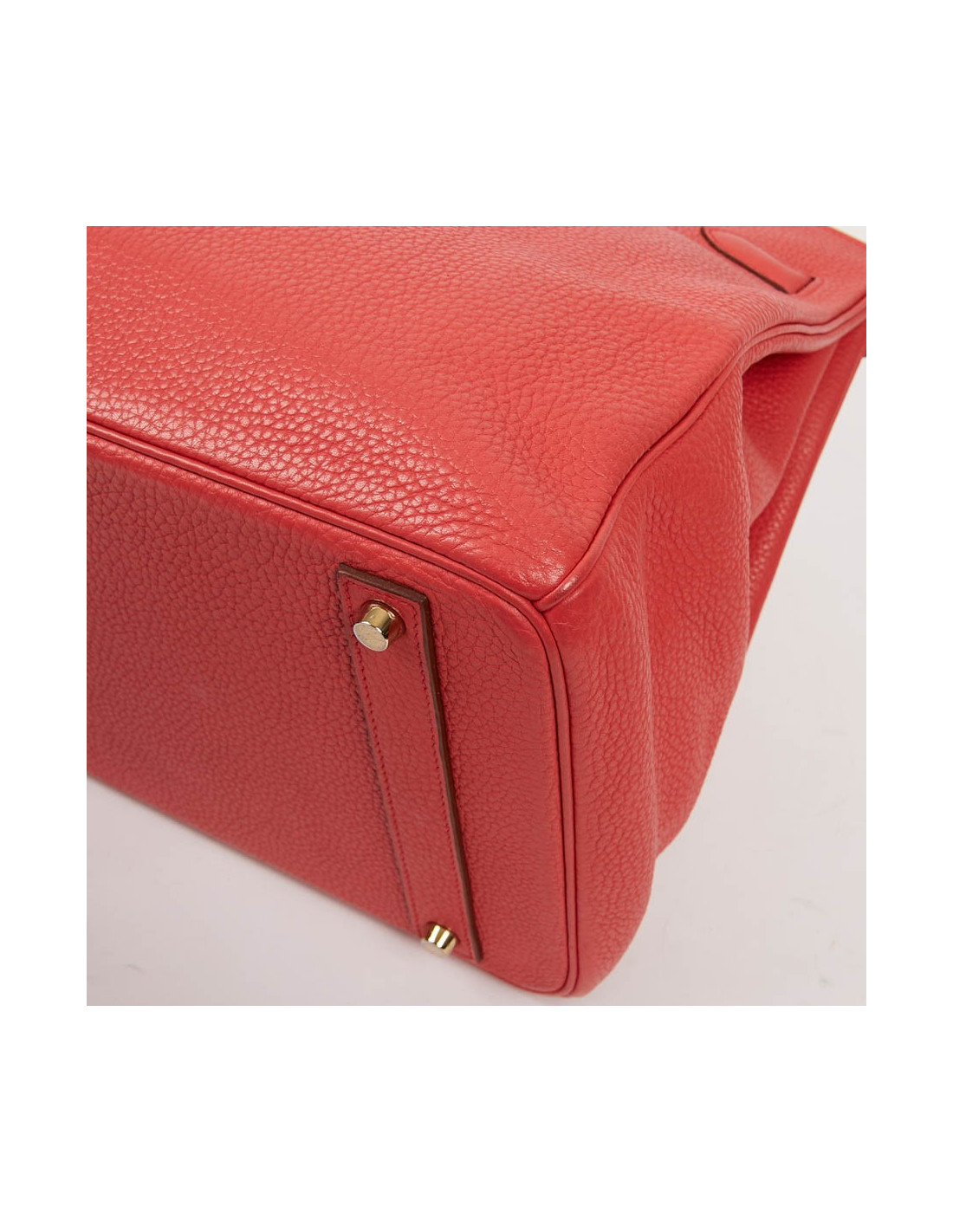 This large Birkin bag, size 40 is in peony Togo leather. The jewelry is in gilded metal.