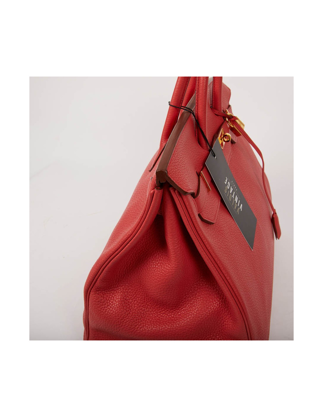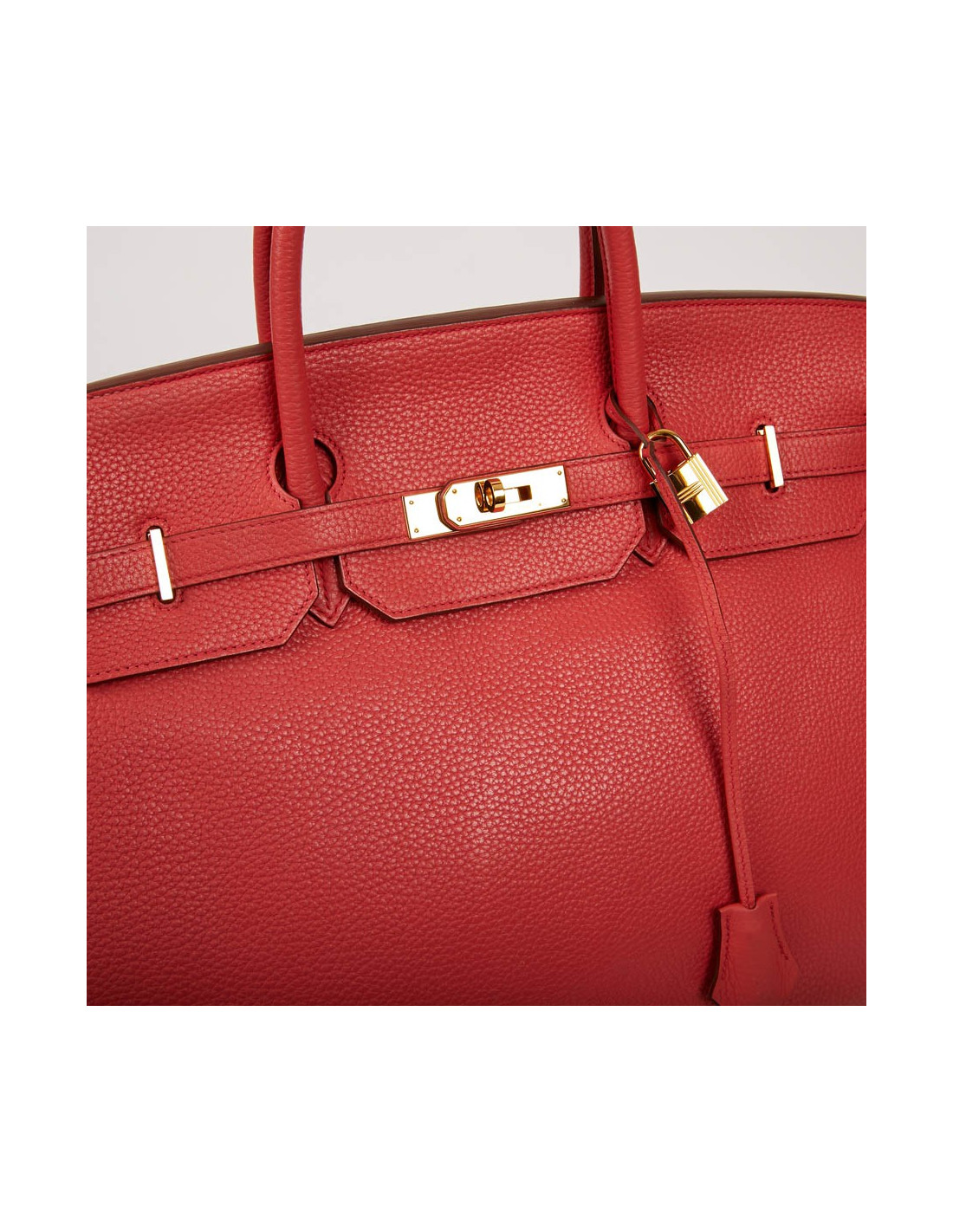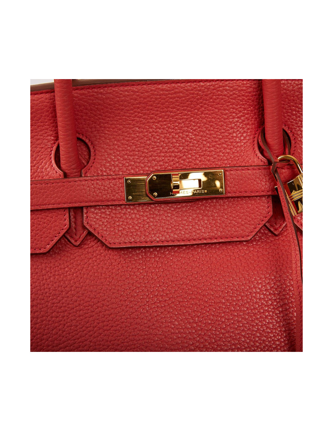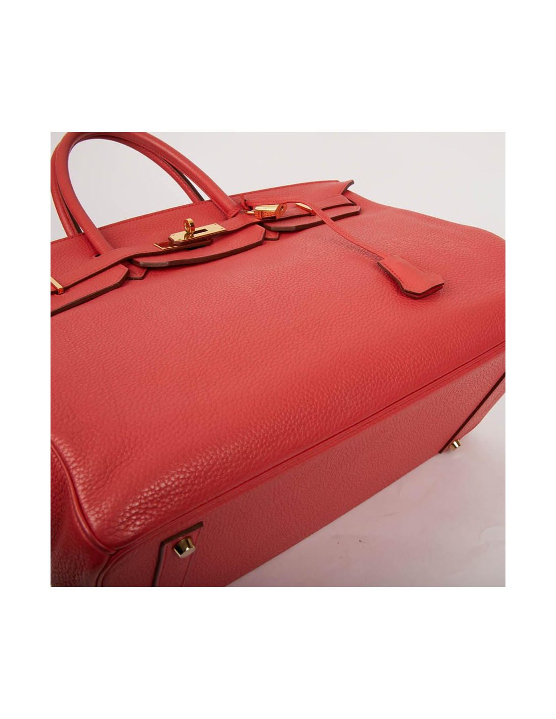 This large Birkin bag, size 40 is in peony Togo leather. The jewelry is in gilded metal.