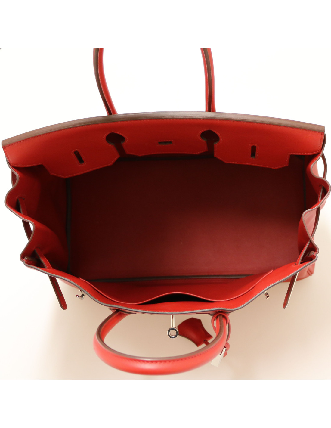 Details : pulls, bells, keys (2) and padlocks. Plaited Swift and Epsom leather: chili red, heart red, H red. Plastics still on hardware. Copy of purchase invoice.