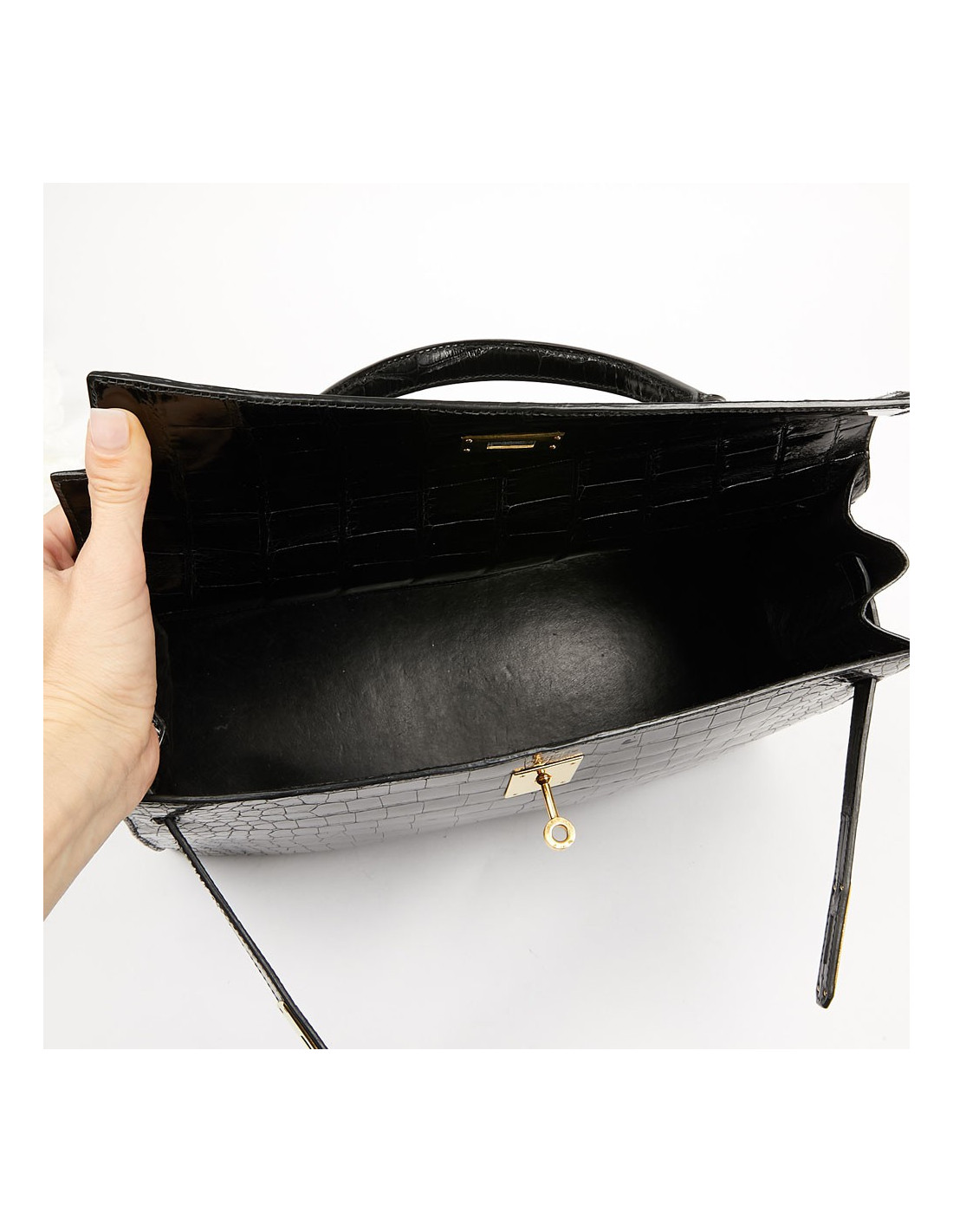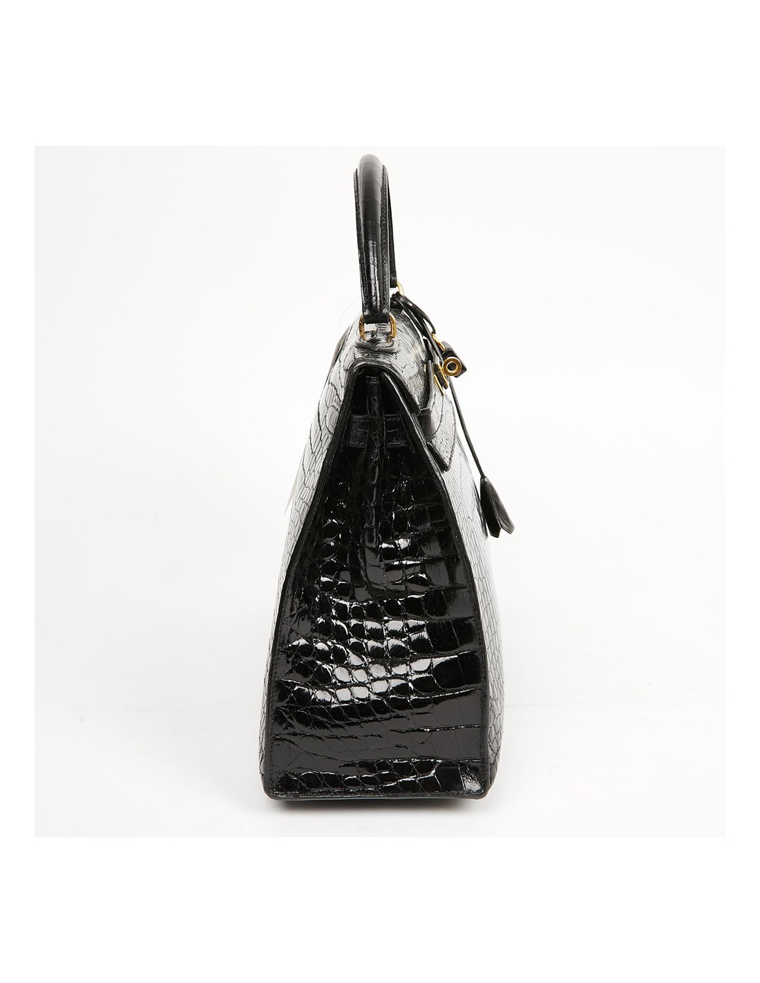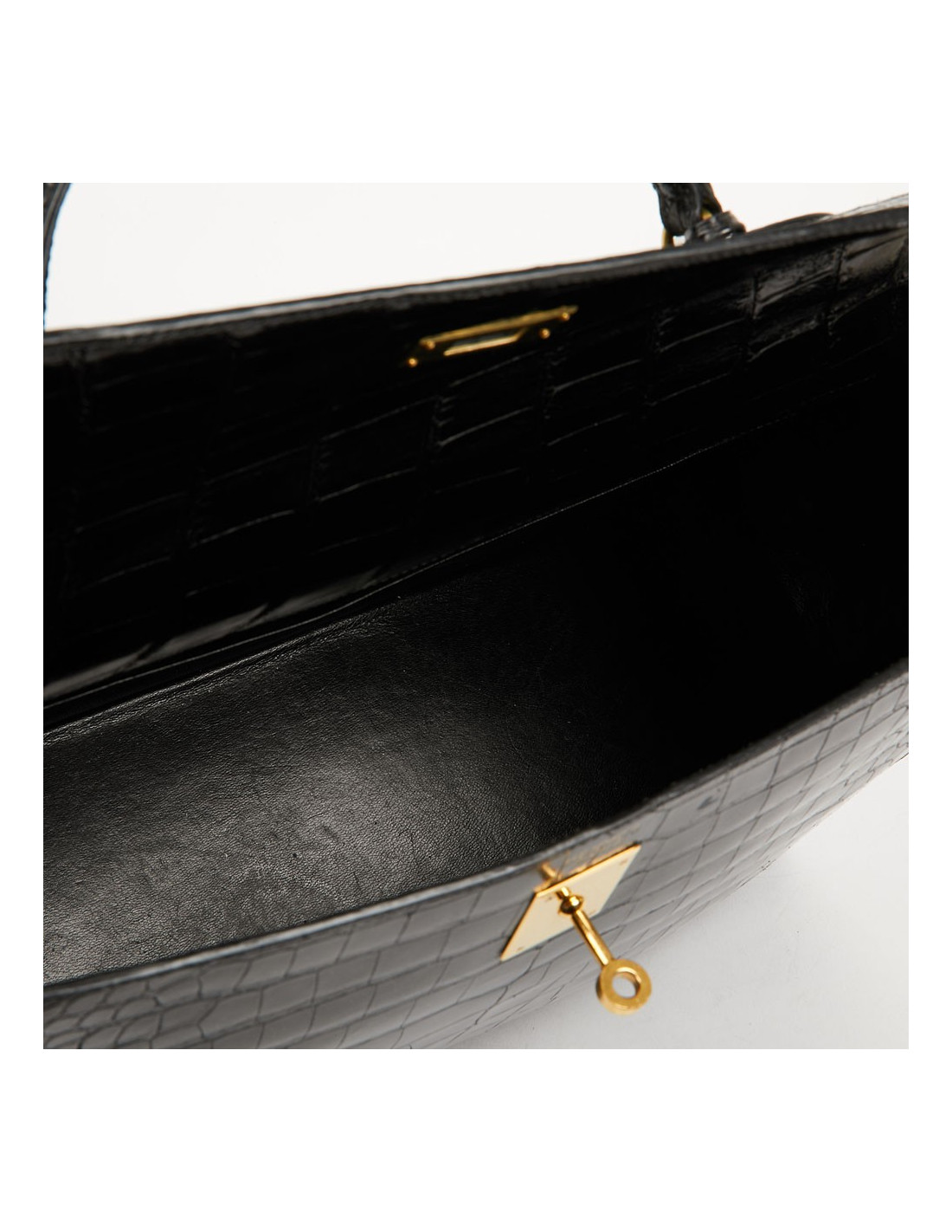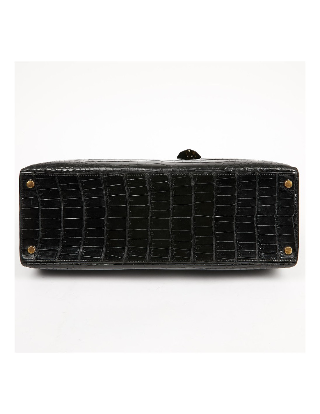 This large Kelly 35 bag is made of black Porosus crocodile, lined with smooth leather. Inside is a large flat pocket on one side and two small on the other side. The trimmings are in gold metal. The handle as well as the bell and padlock have been changed. A shoulder strap has been added, it is not original. The bag has no wear and tear. Micro scratches are visible on the metal parts.