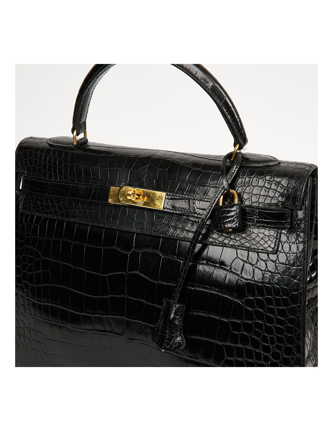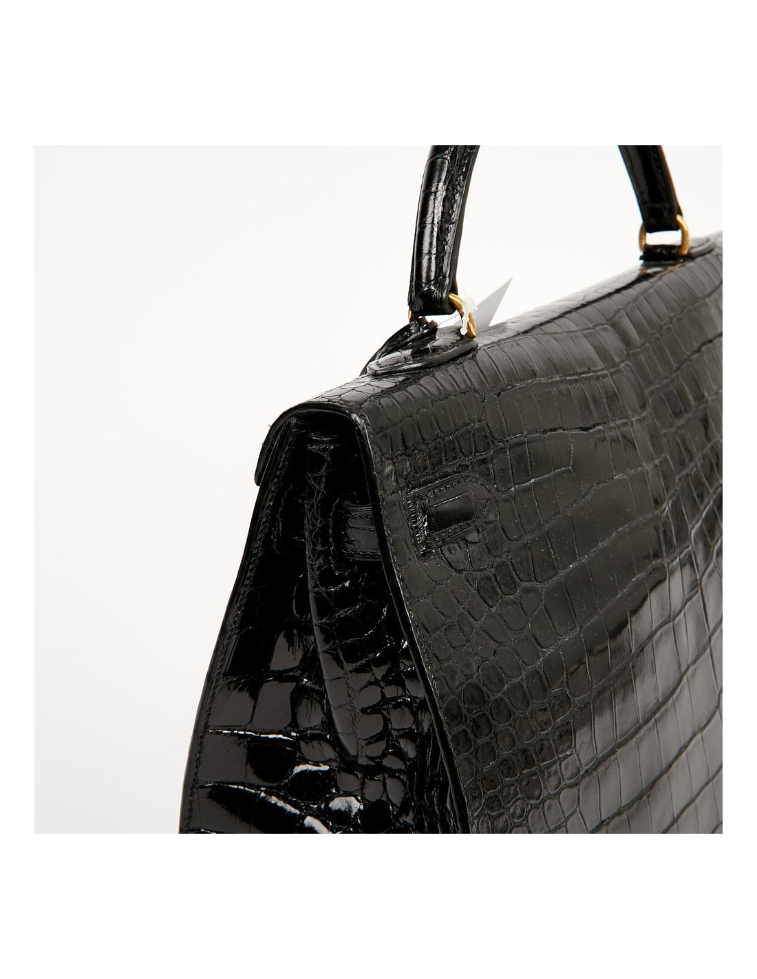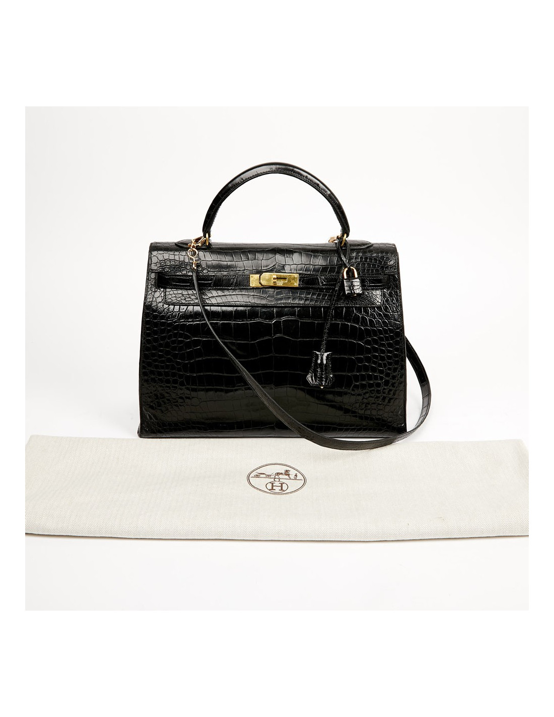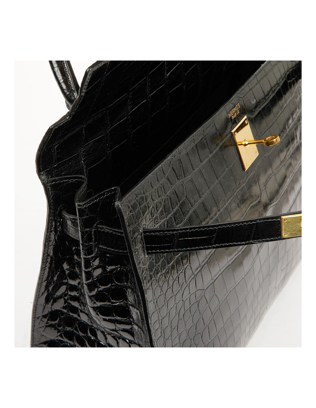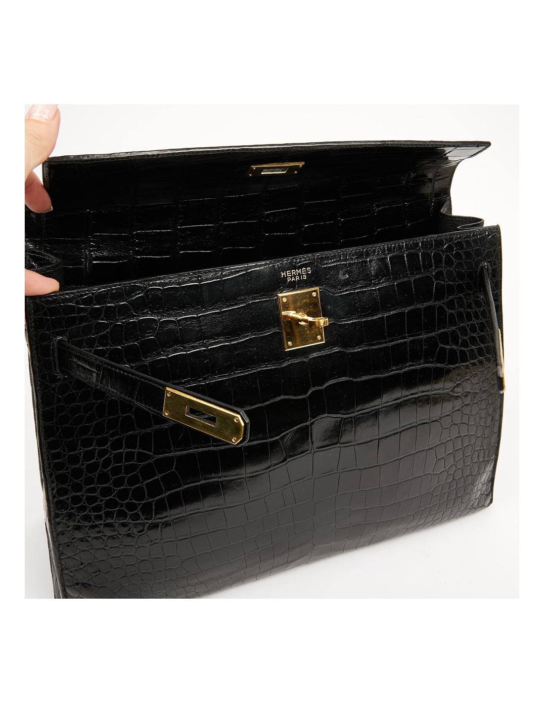 This large Kelly 35 bag is made of black Porosus crocodile, lined with smooth leather. Inside is a large flat pocket on one side and two small on the other side. The trimmings are in gold metal. The handle as well as the bell and padlock have been changed. A shoulder strap has been added, it is not original. The bag has no wear and tear. Micro scratches are visible on the metal parts.