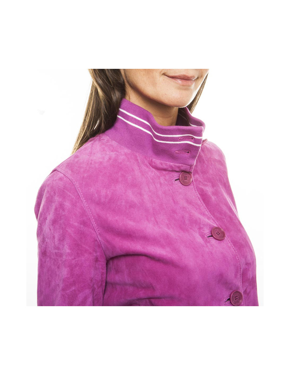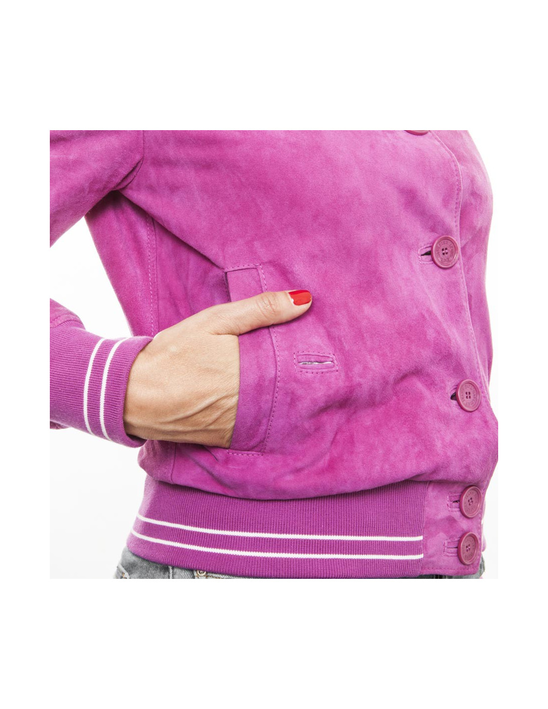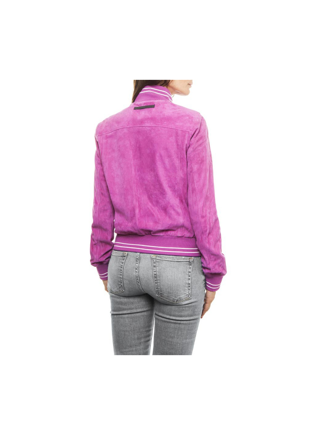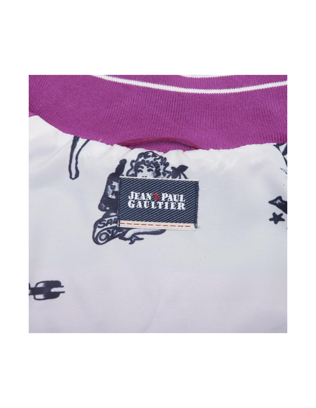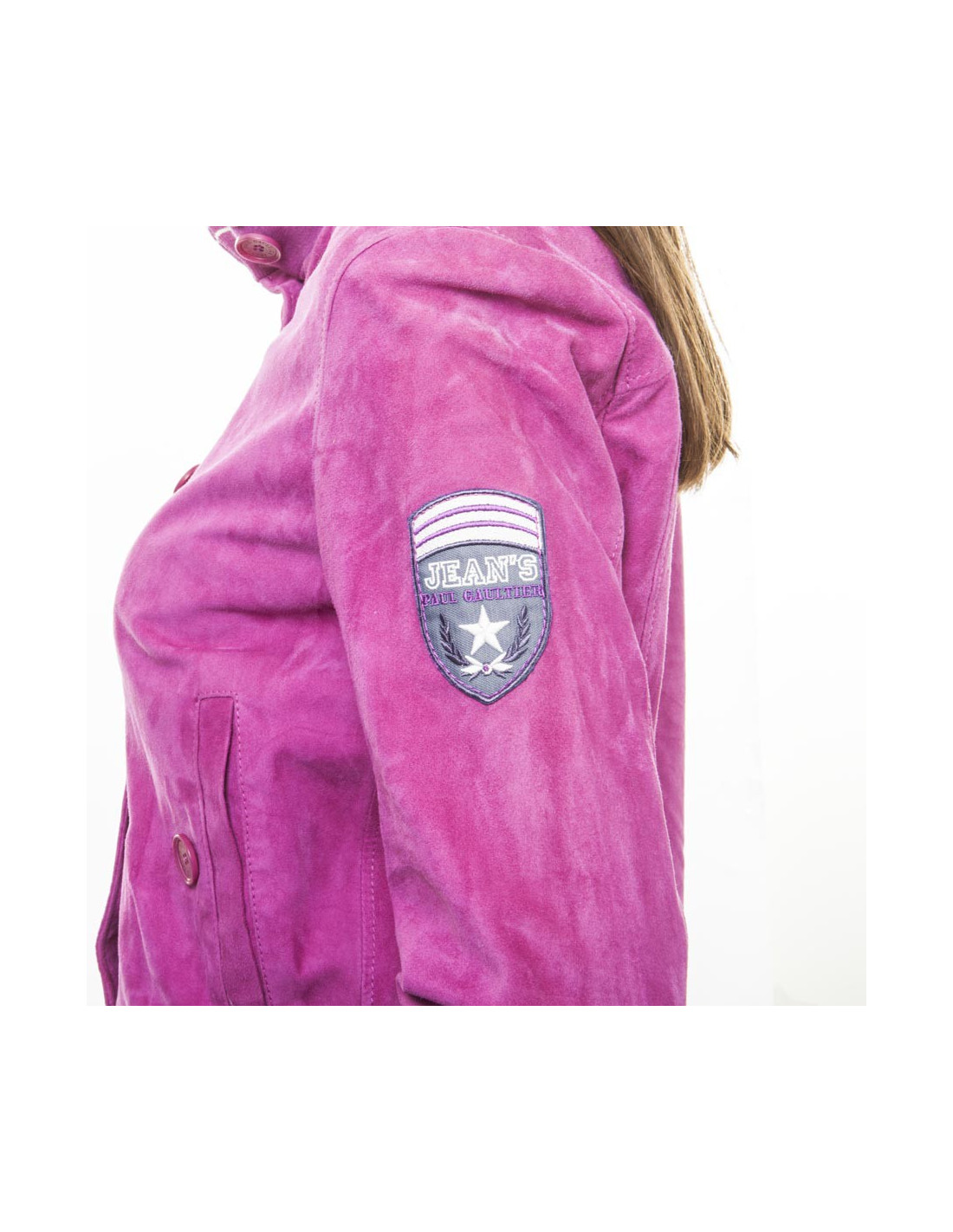 Jean Paul Gaultier jacket in fuchsia velvet calfskin. It closes with 6 buttons, with two pockets. Elasticated at the wrists and lower back. There is a "Jean's Paul Gaultier" badge on the left shoulder of the jacket. White polyester interior with navy blue designs.