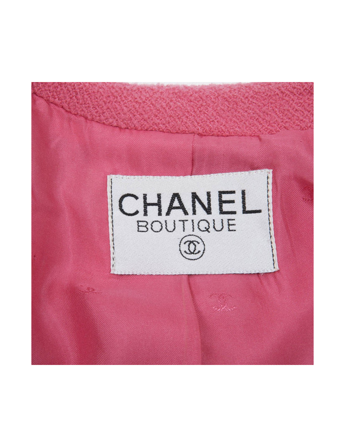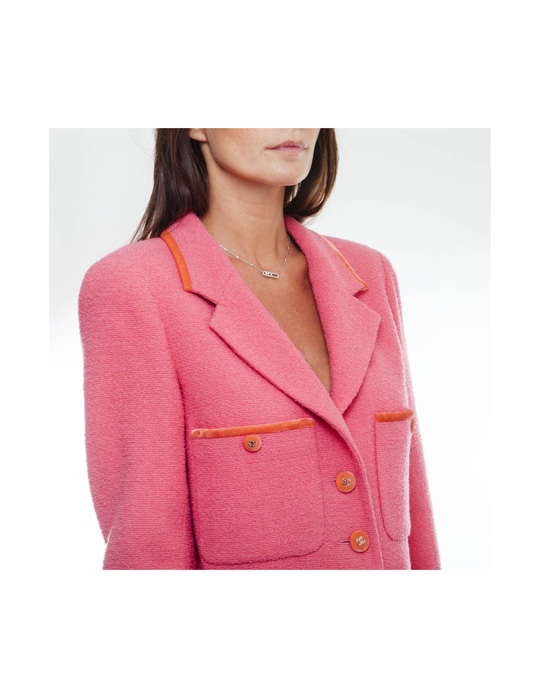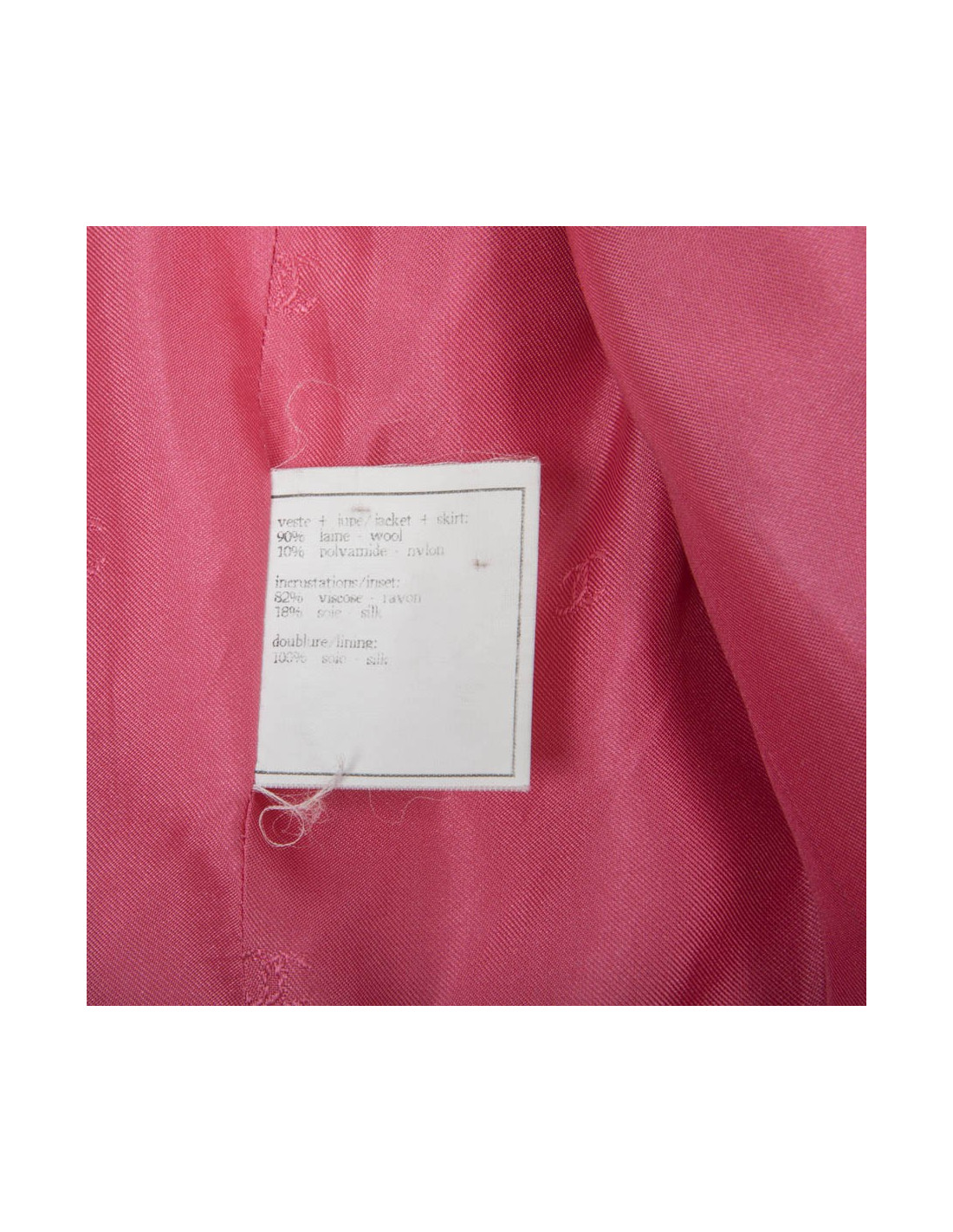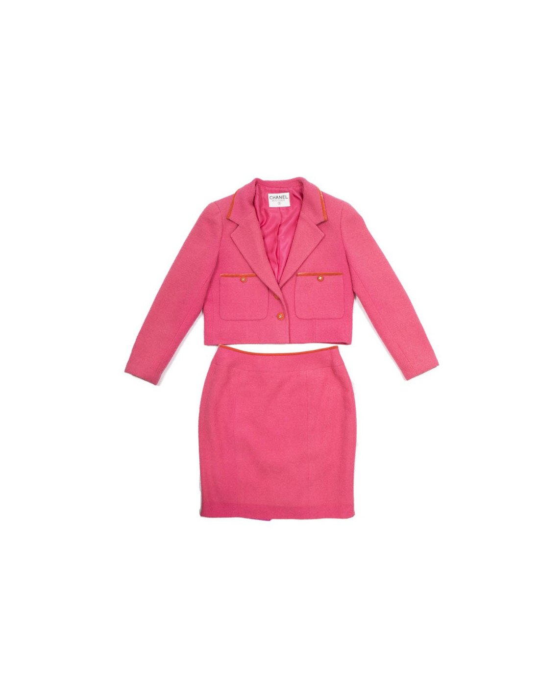 Chanel skirt suit in pink tweed. The jacket can be worn alone. The skirt is split on the outside and closed by 3 buttons, lined by a pink silk logo 'CC'.
