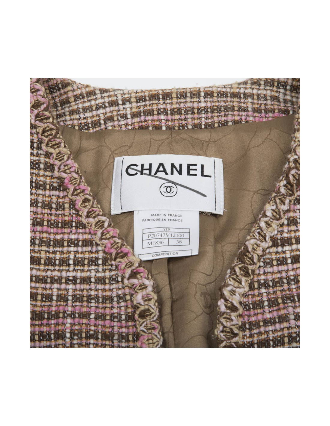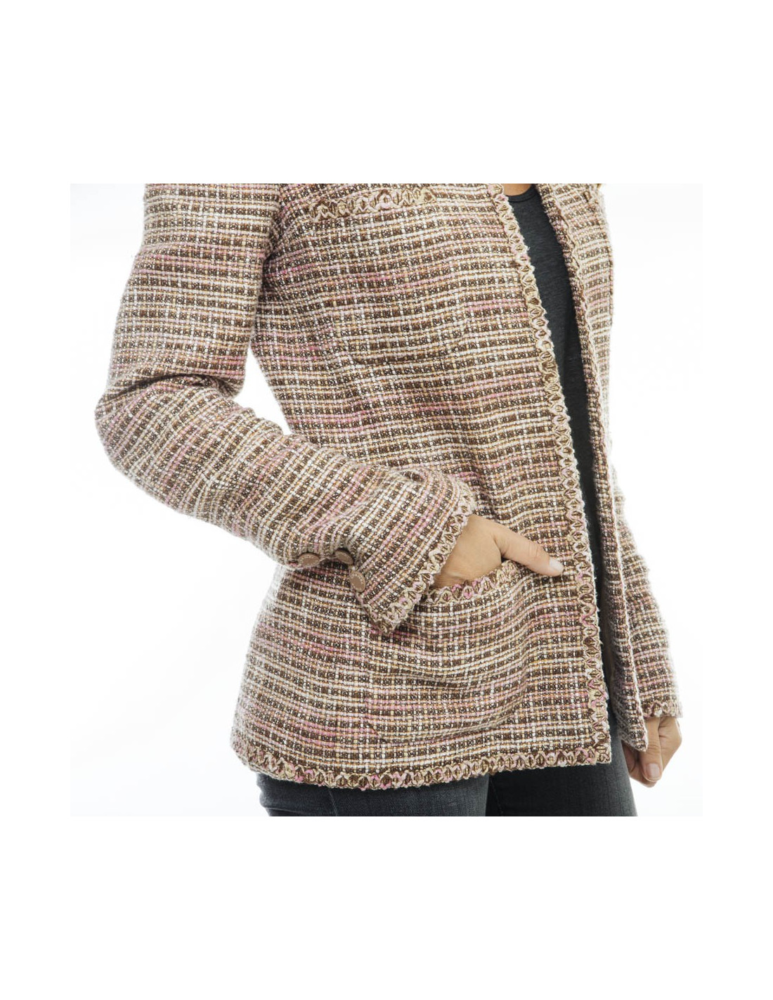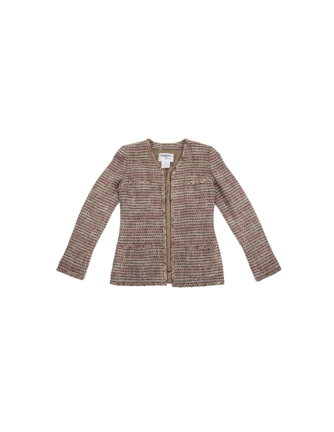 Chanel great classic. CHANEL jacket, with four pockets, in beige, pink and brown tweed linen and cotton. Each wrist has 3 buttonholes with 3 brown buttons "CHANEL PARIS".