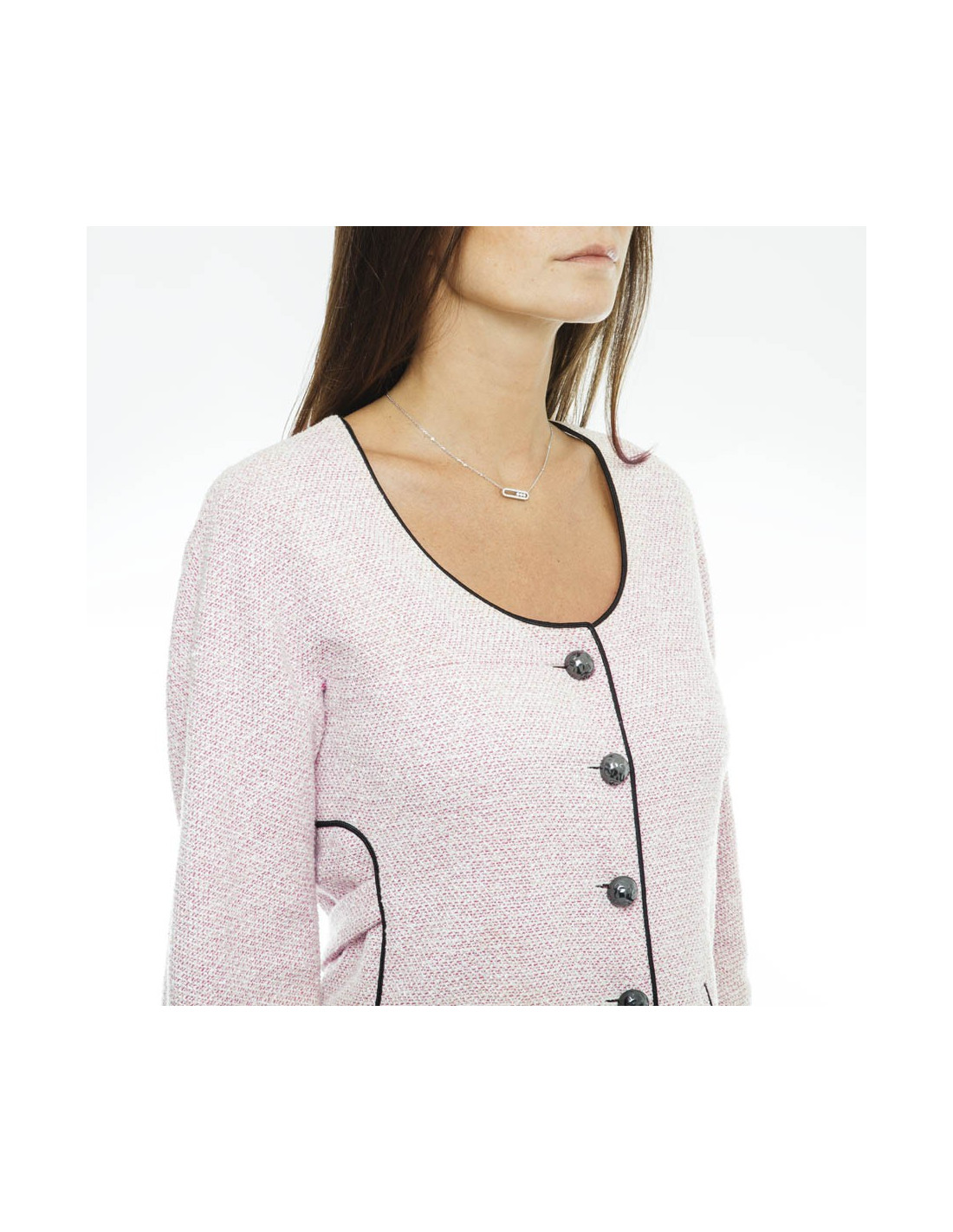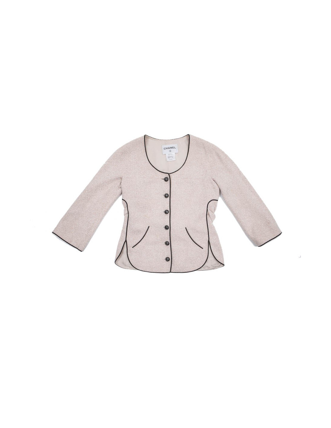 The jacket has a thin black edging. The sleeves are 3/4 and the CC buttons are in palladium-like metal hammered.