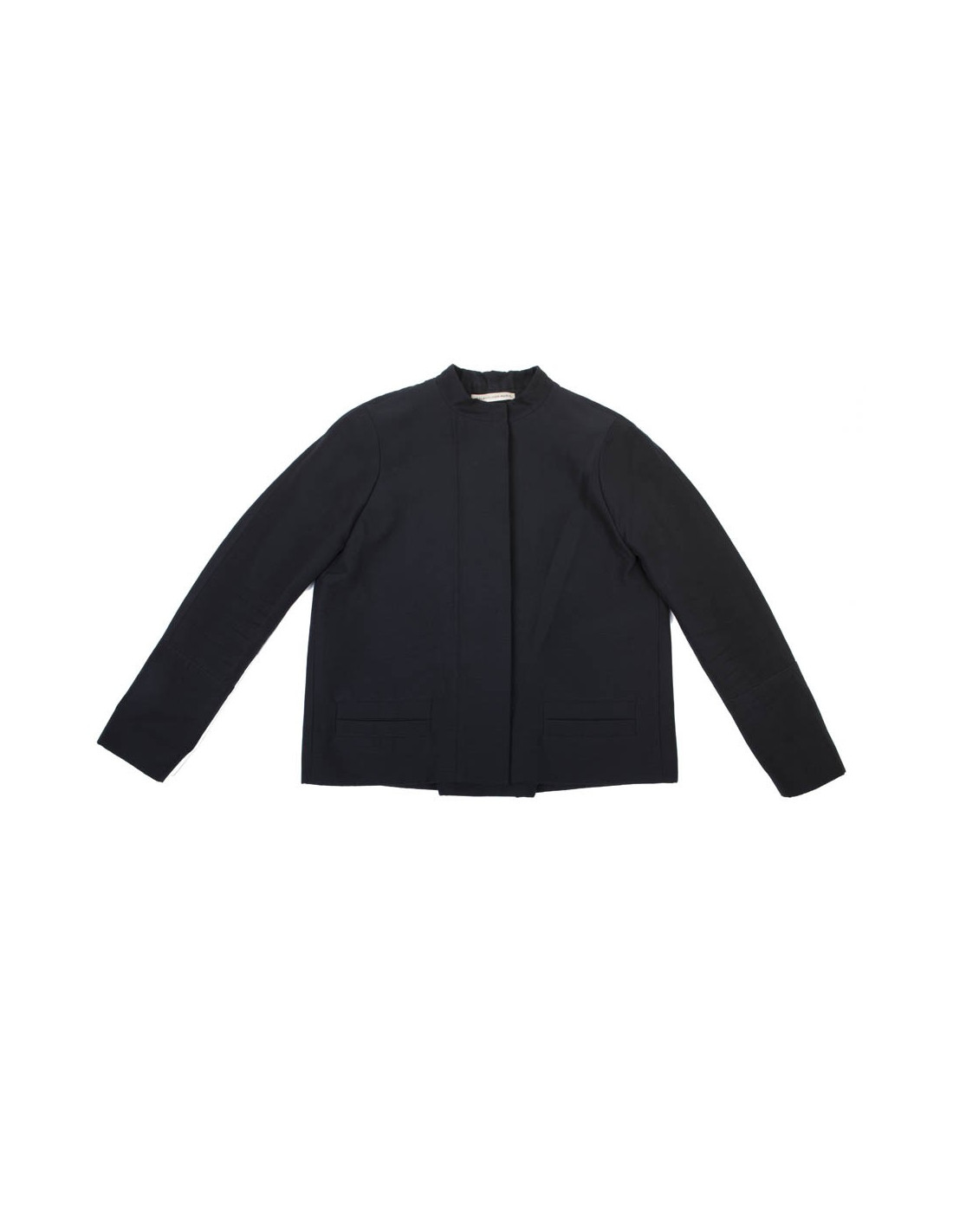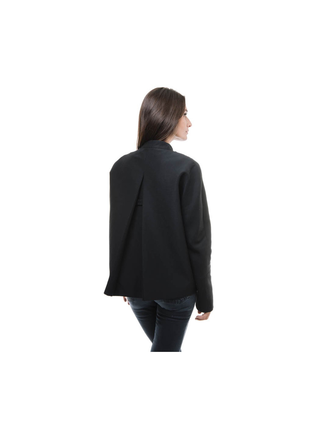 Balenciaga jacket in black gros grain. It has 2 pockets on the sides and closes with 6 buttons coated with coarse grain. In the back a large hollow pleat concealing 2 straps closed by a button.