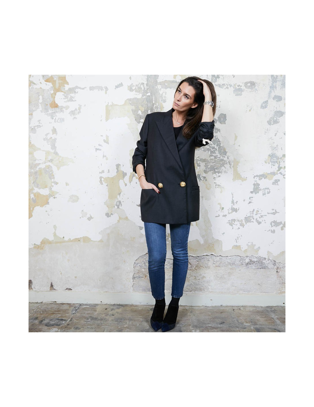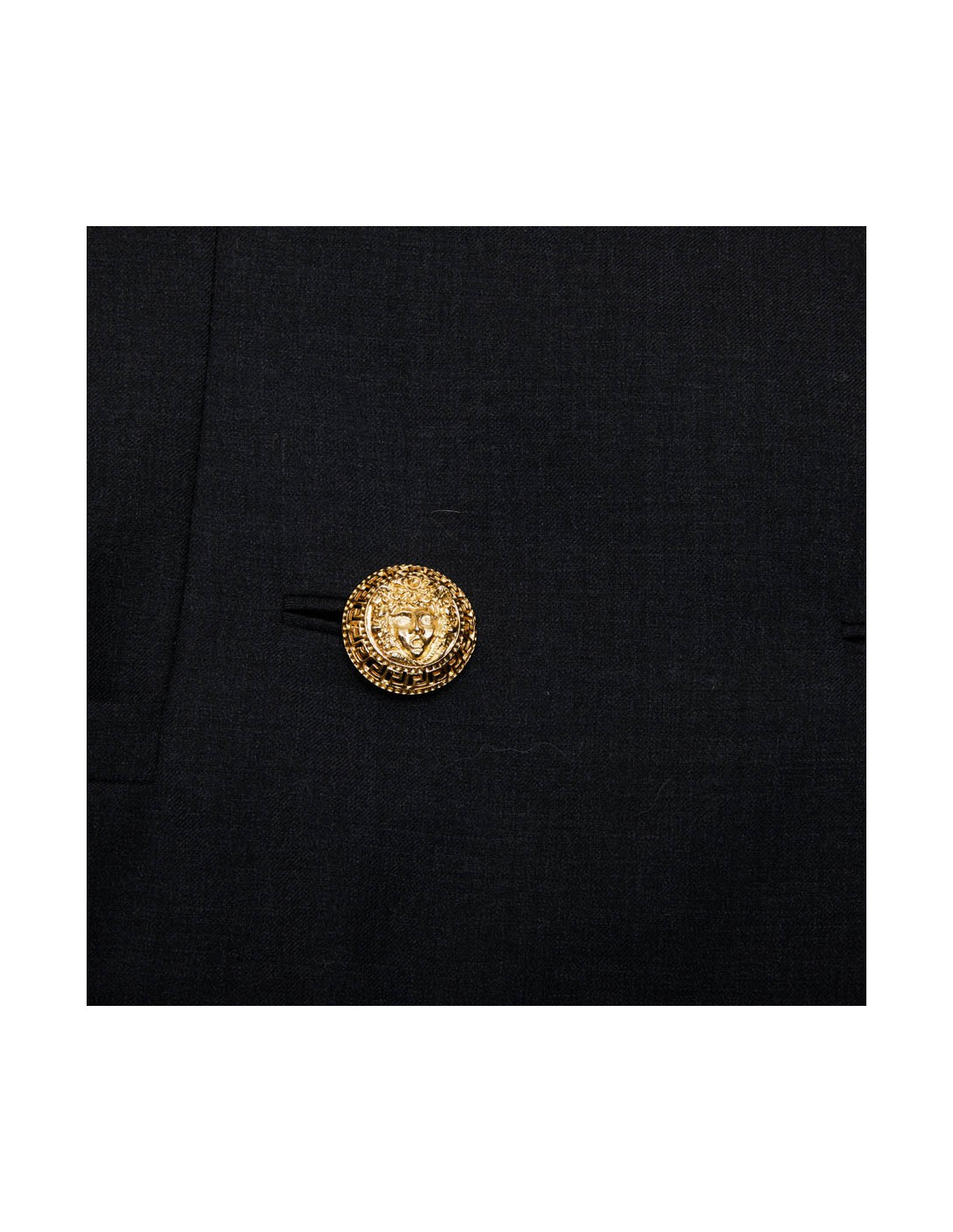 Two straight pockets on the sides. Two imposing buttons emblazoned with the lion's head dear to Gianni Versace in gilded metal.