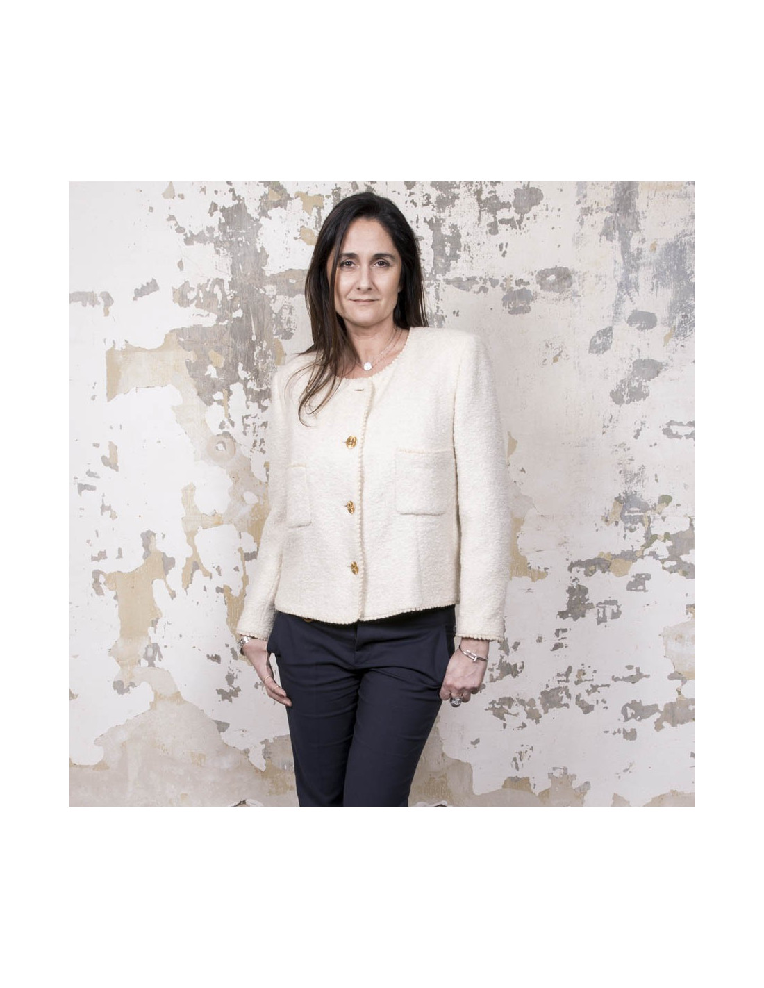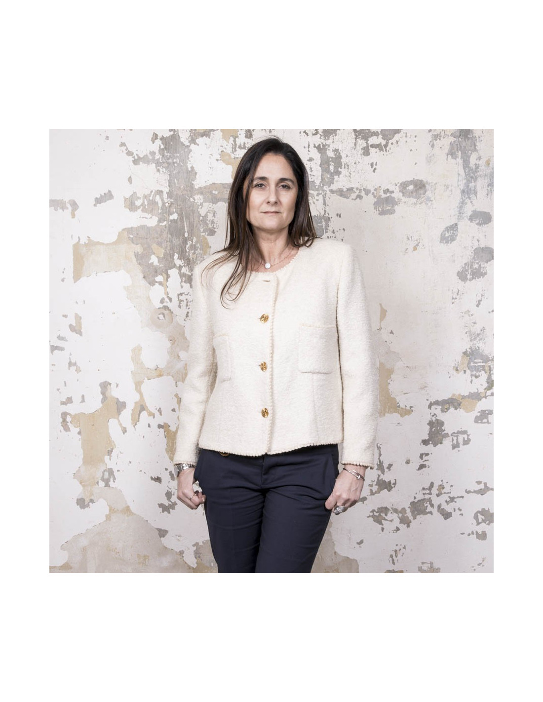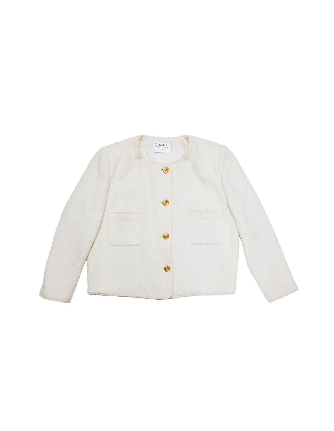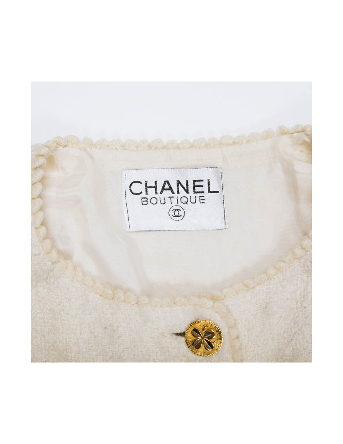Chanel vintage ecru tweed jacket. It closes with four golden metal buttons. We find the same button at each wrist and two slit pockets at the waist.