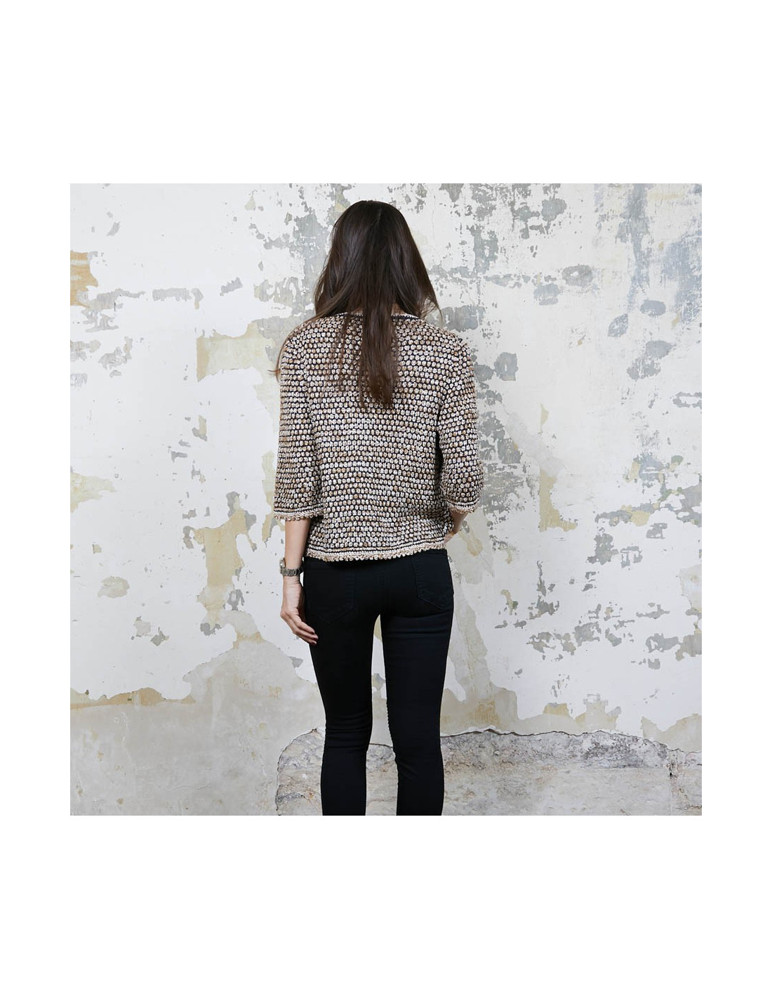 Dimensions of the jacket flat: Shoulder width 38 cm, underarm width 44cm and total height 56cm. The sleeves are 3/4 and measure 41cm.