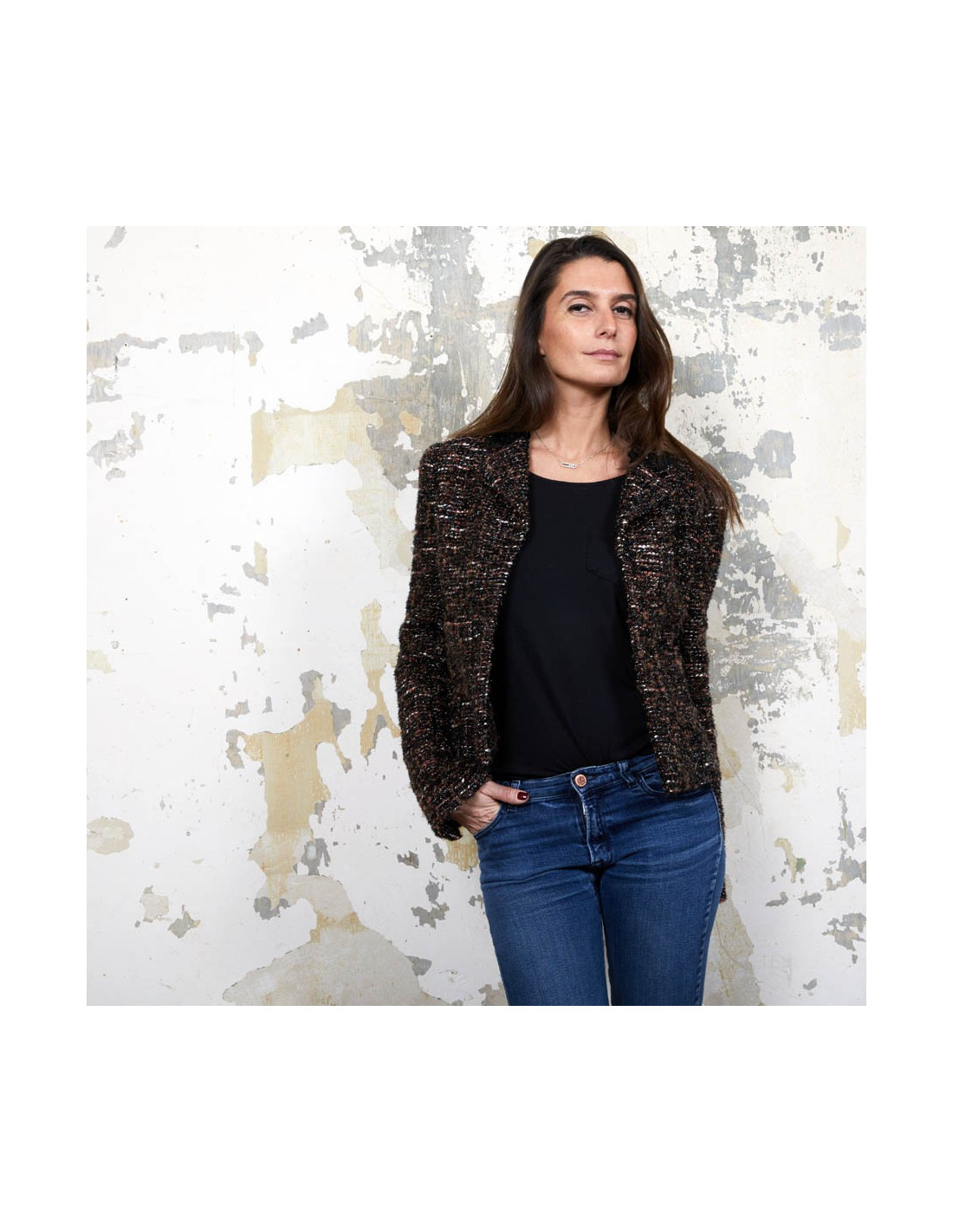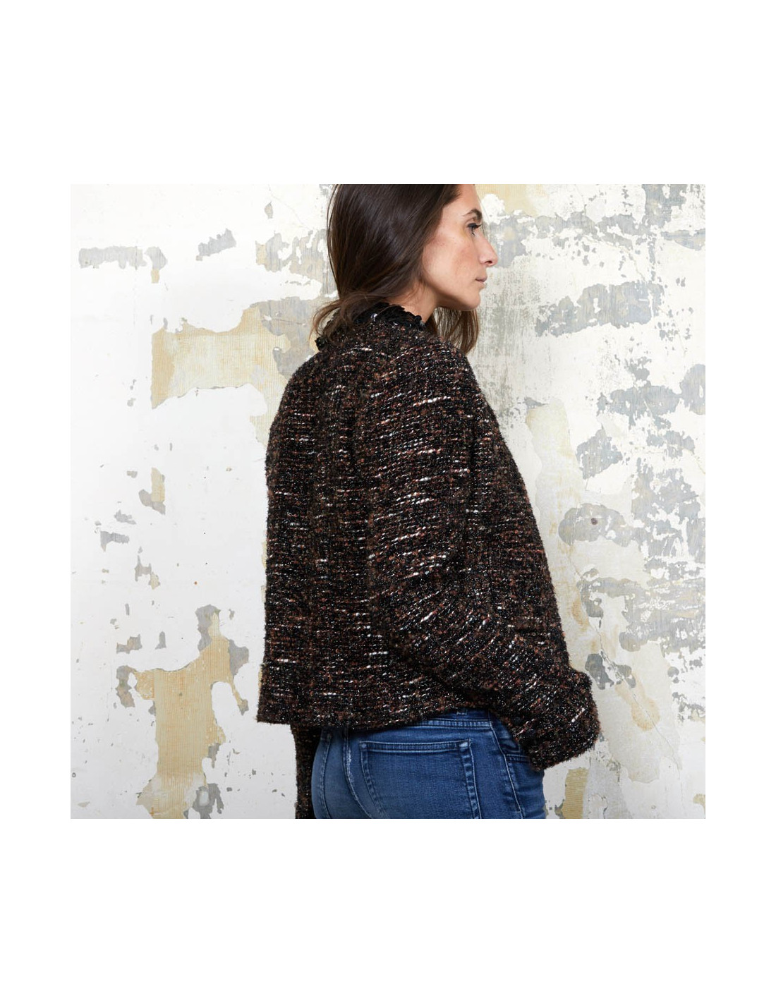Chanel jacket in brown, black and white tweed woven with black shiny threads. Size40 (no size tag). It is lined in brown monogram silk.