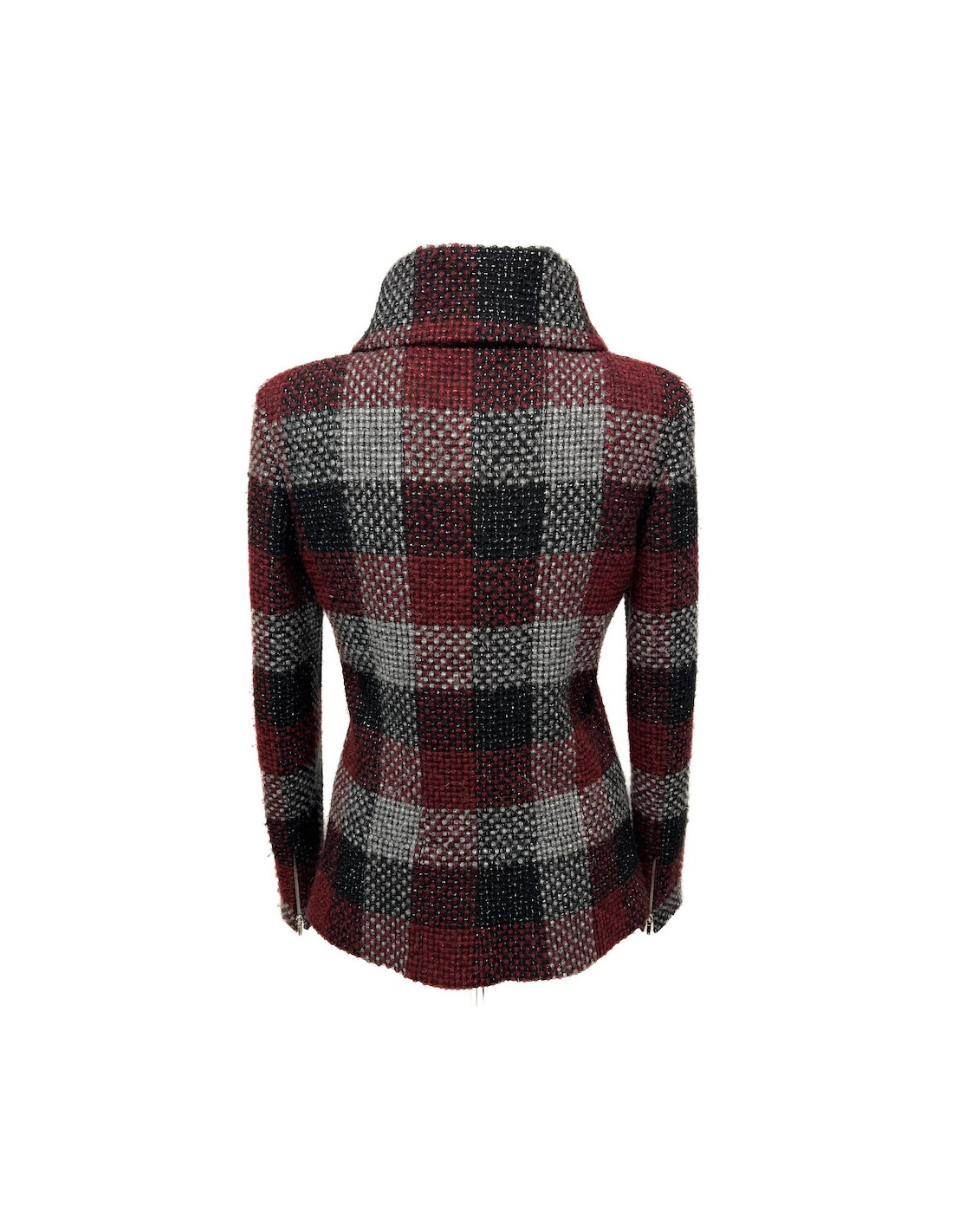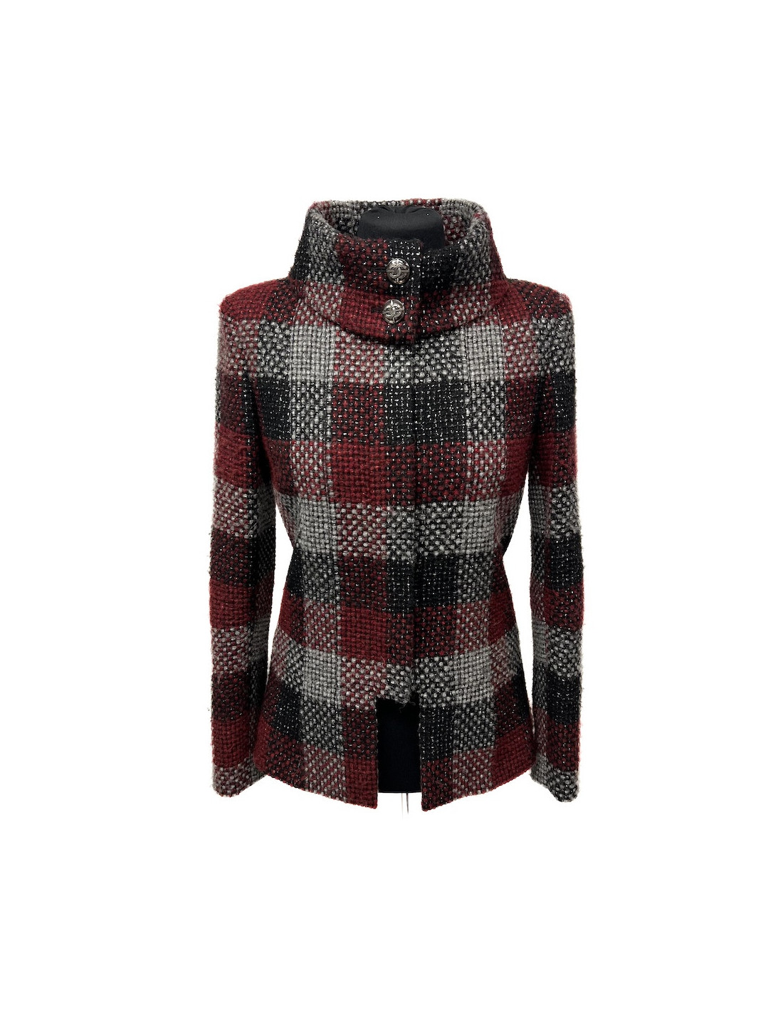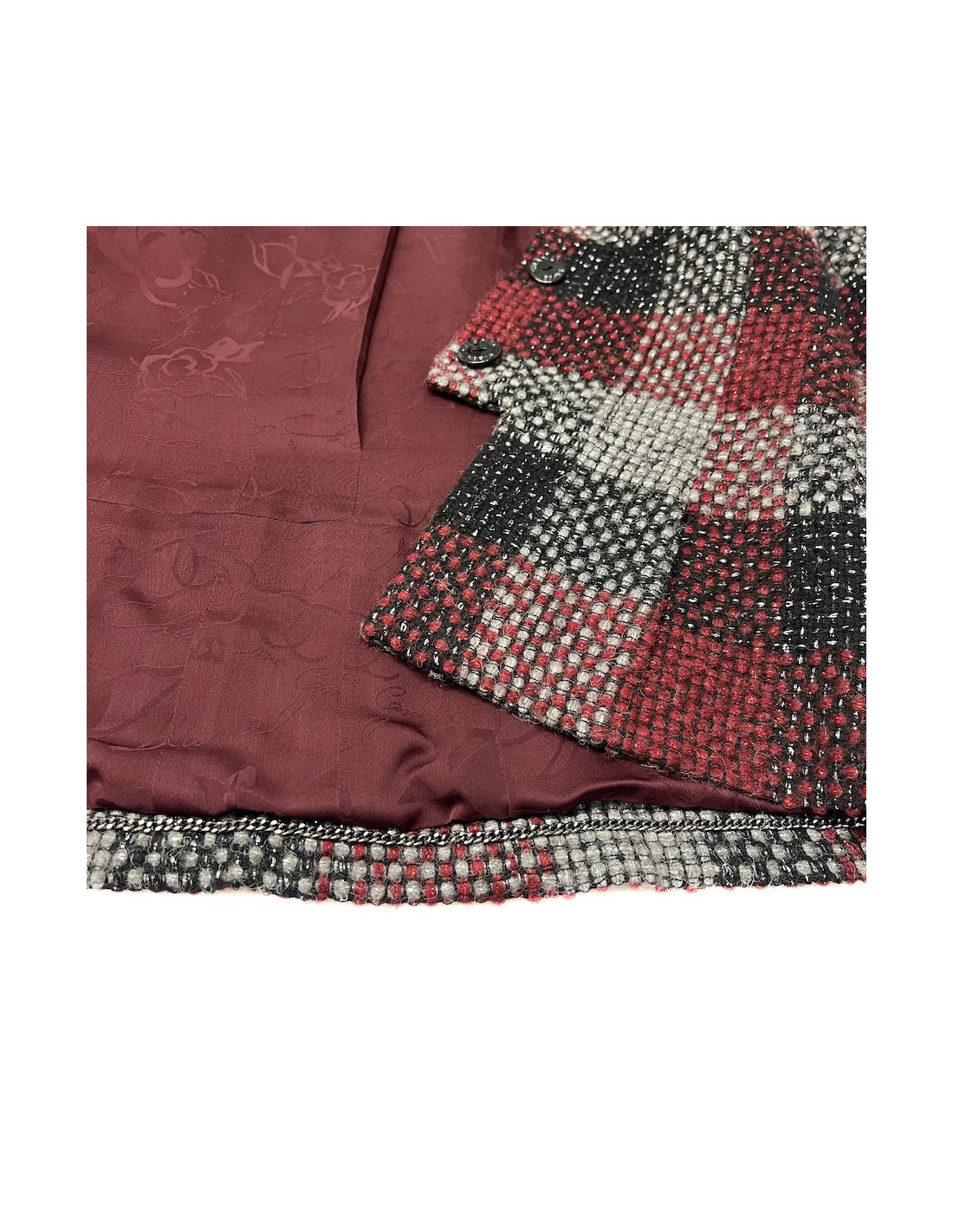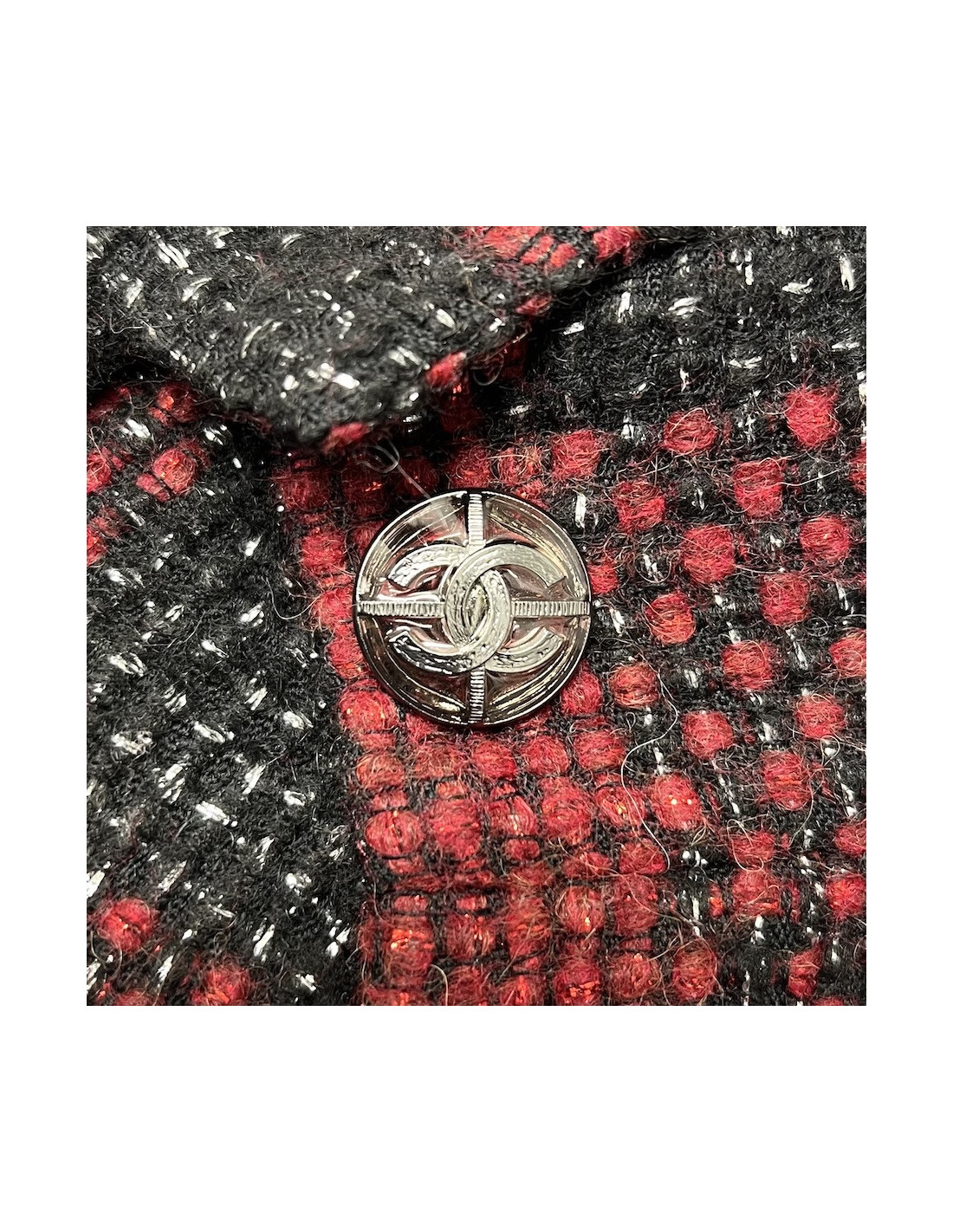 Superb Chanel jacket in tweed with red, silver and black check. It closes with black buttons marked under a paste. The lining is in burgundy monogram silk.