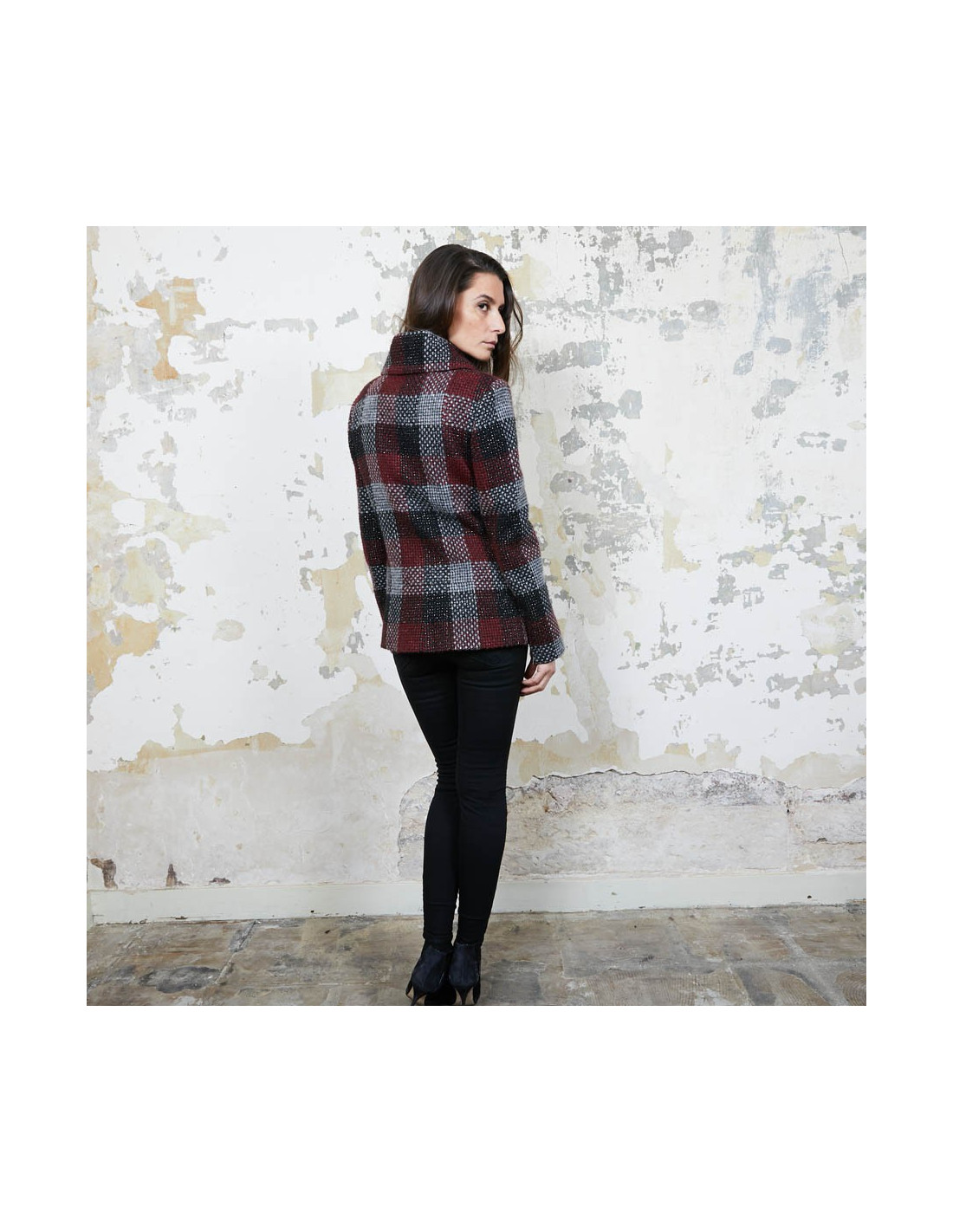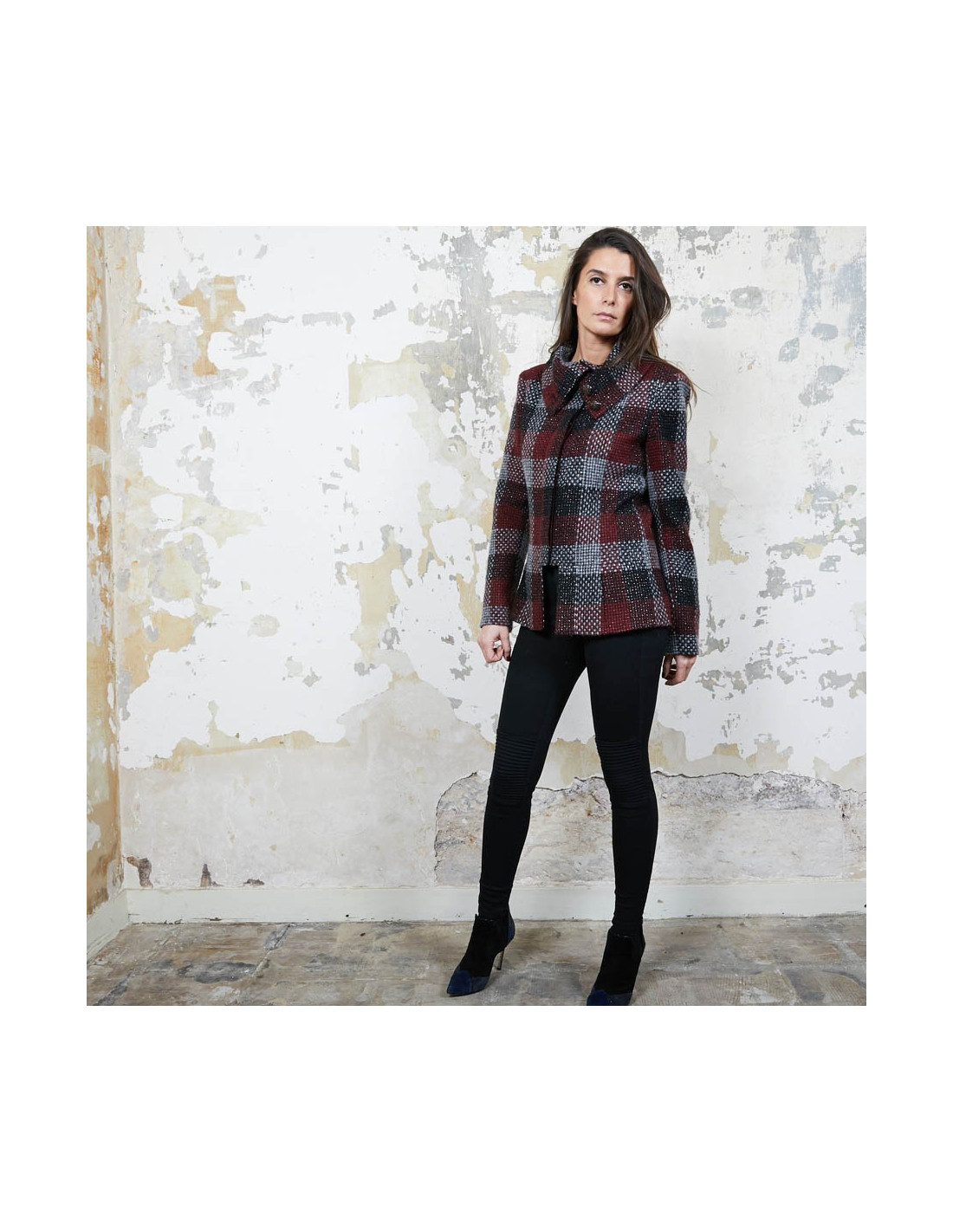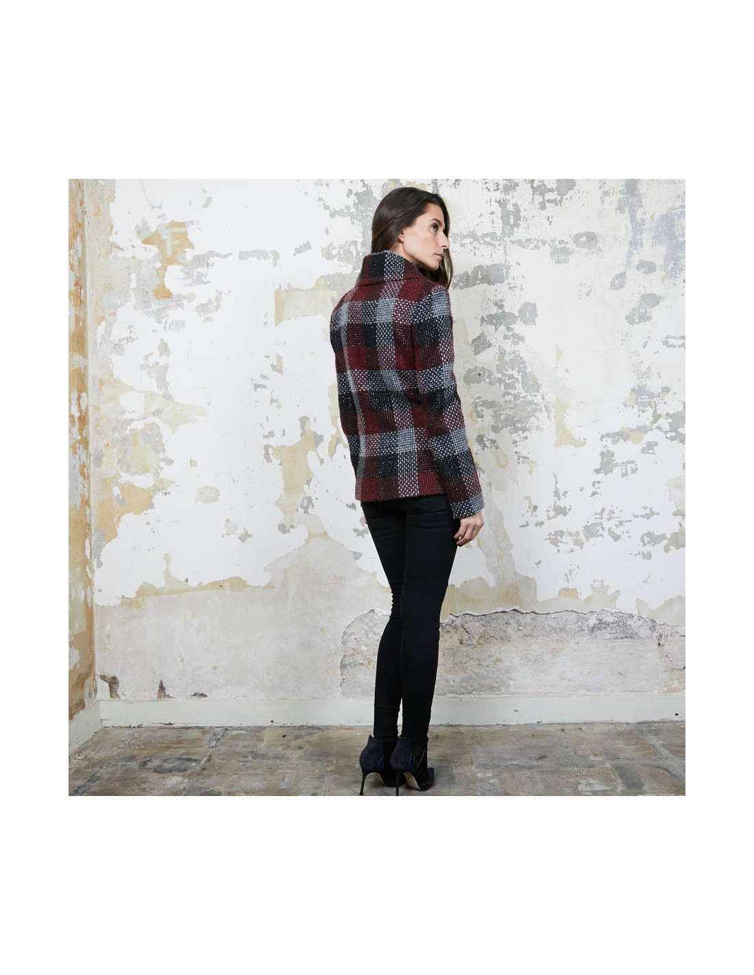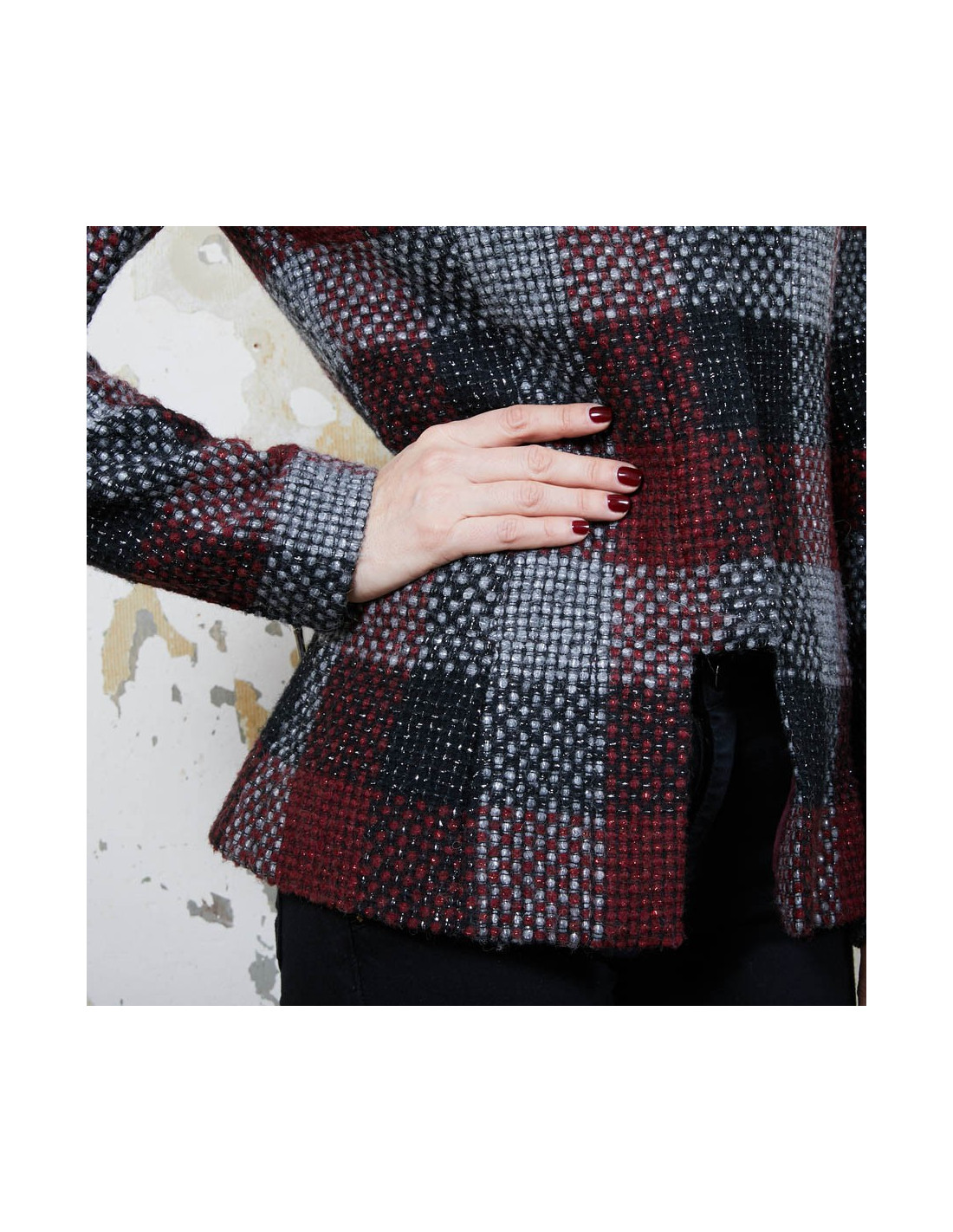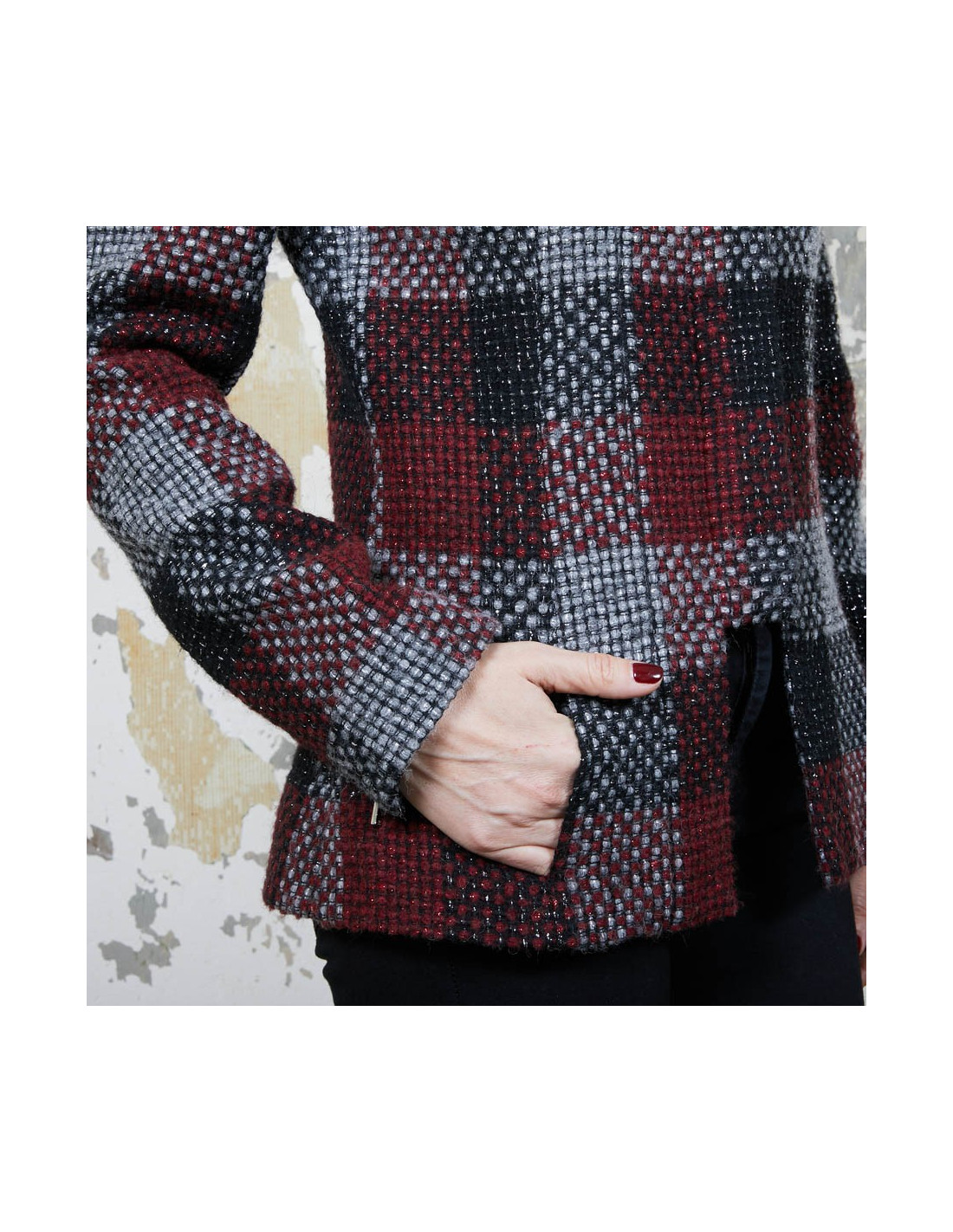 Superb Chanel jacket in tweed with red, silver and black check. It closes with black buttons marked under a paste. The lining is in burgundy monogram silk.