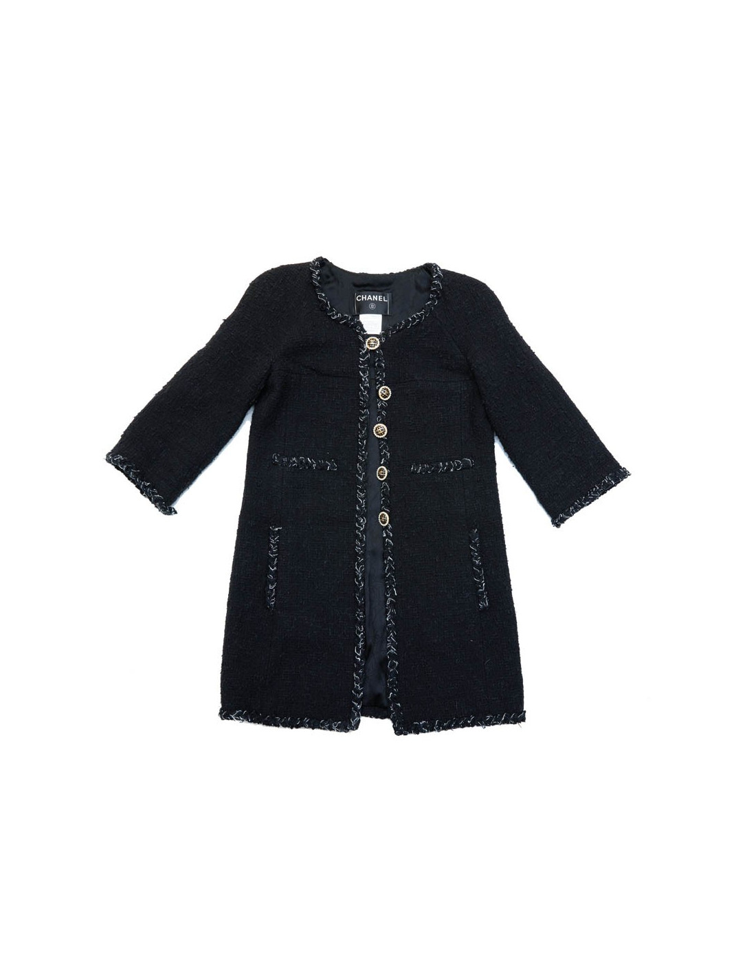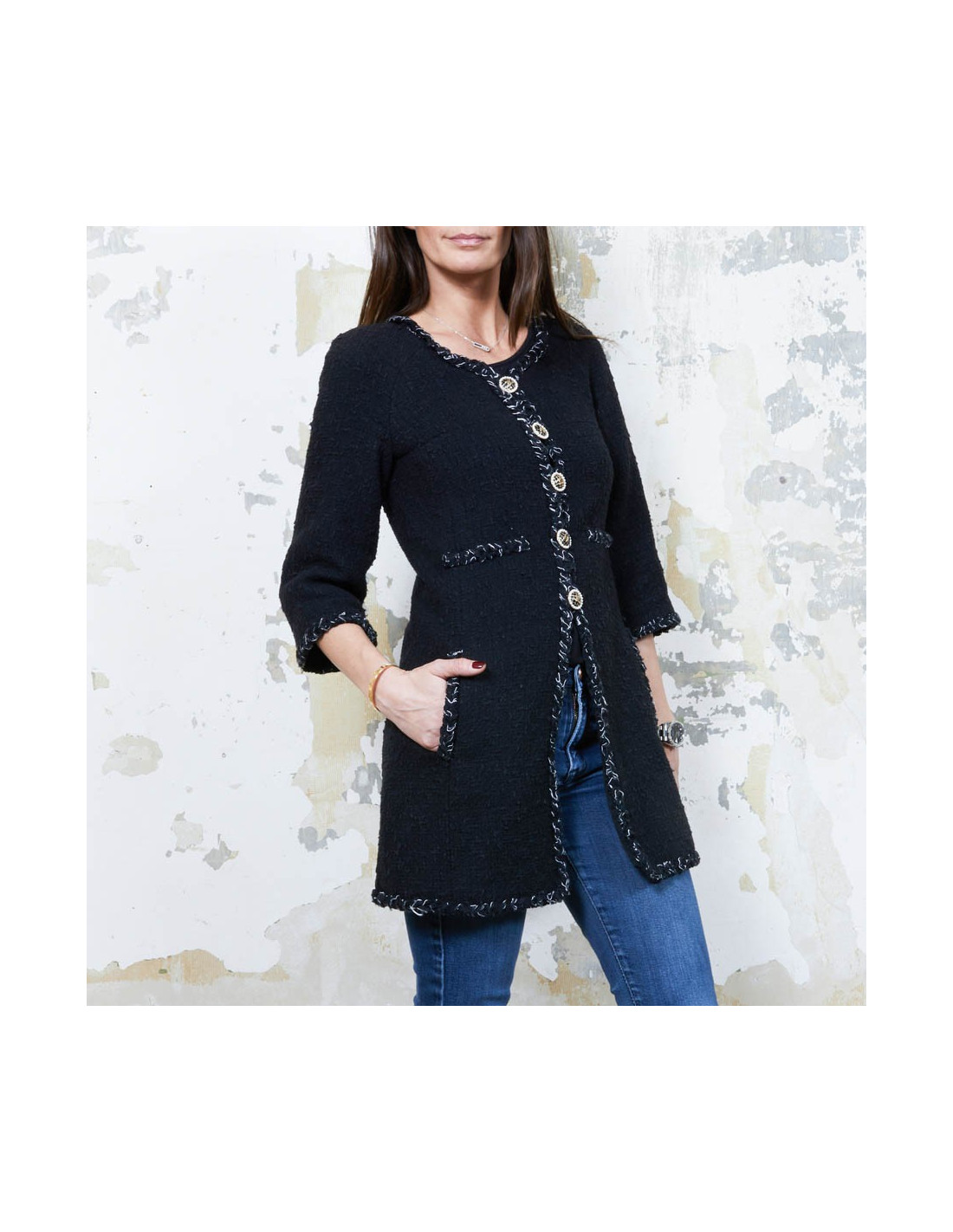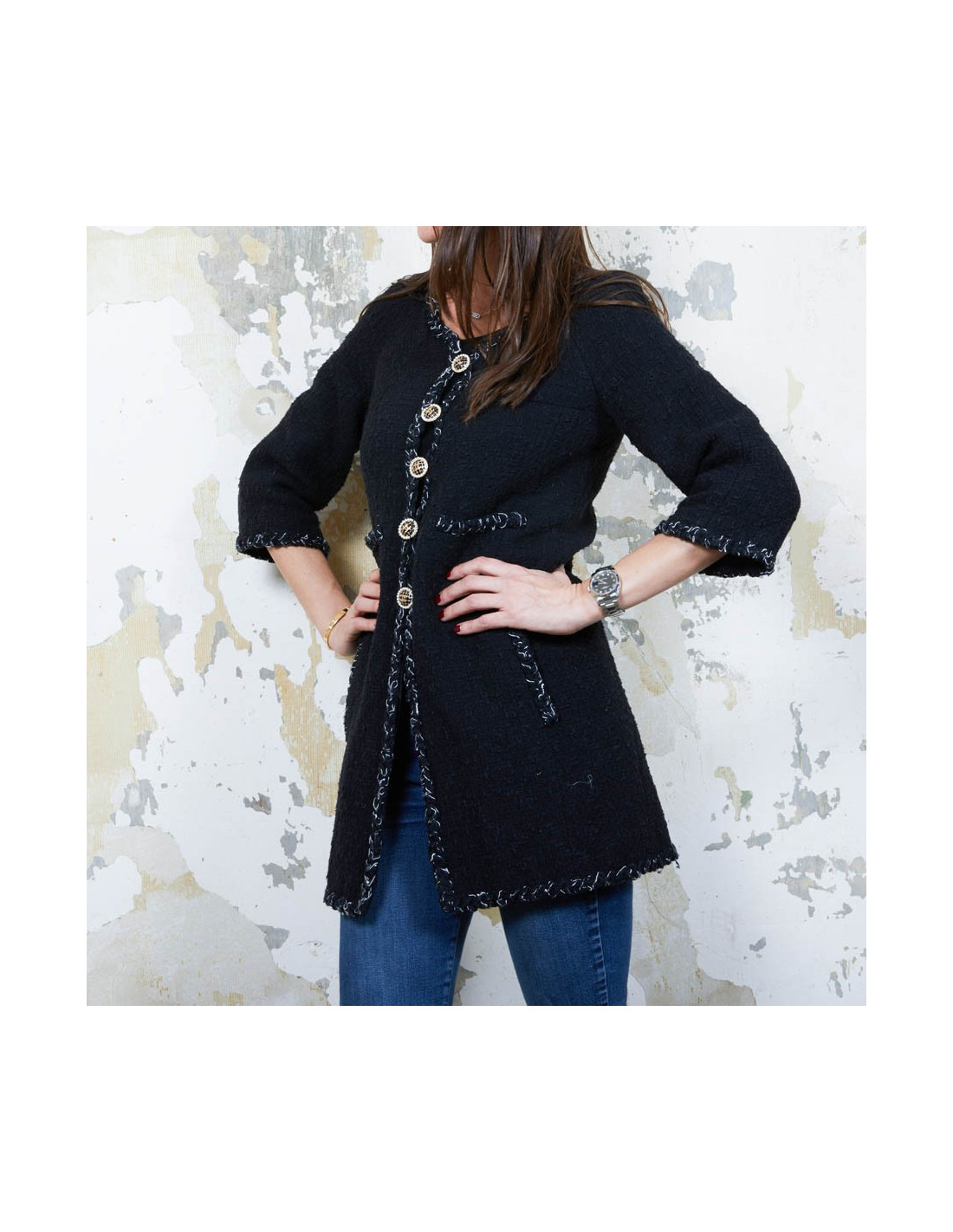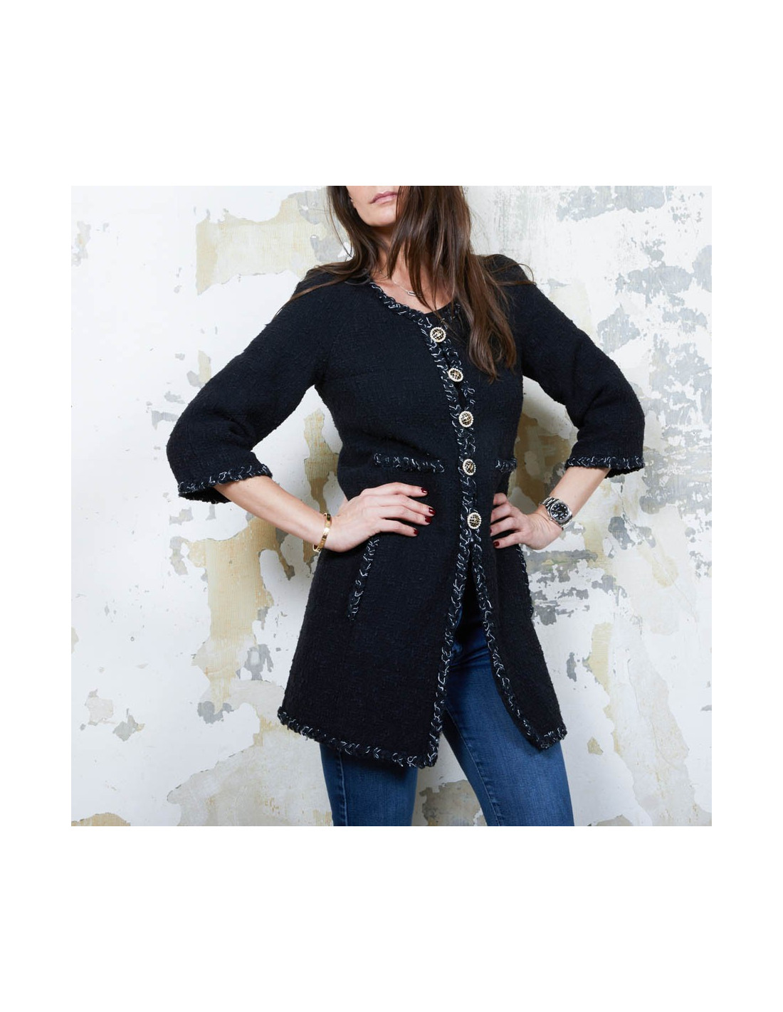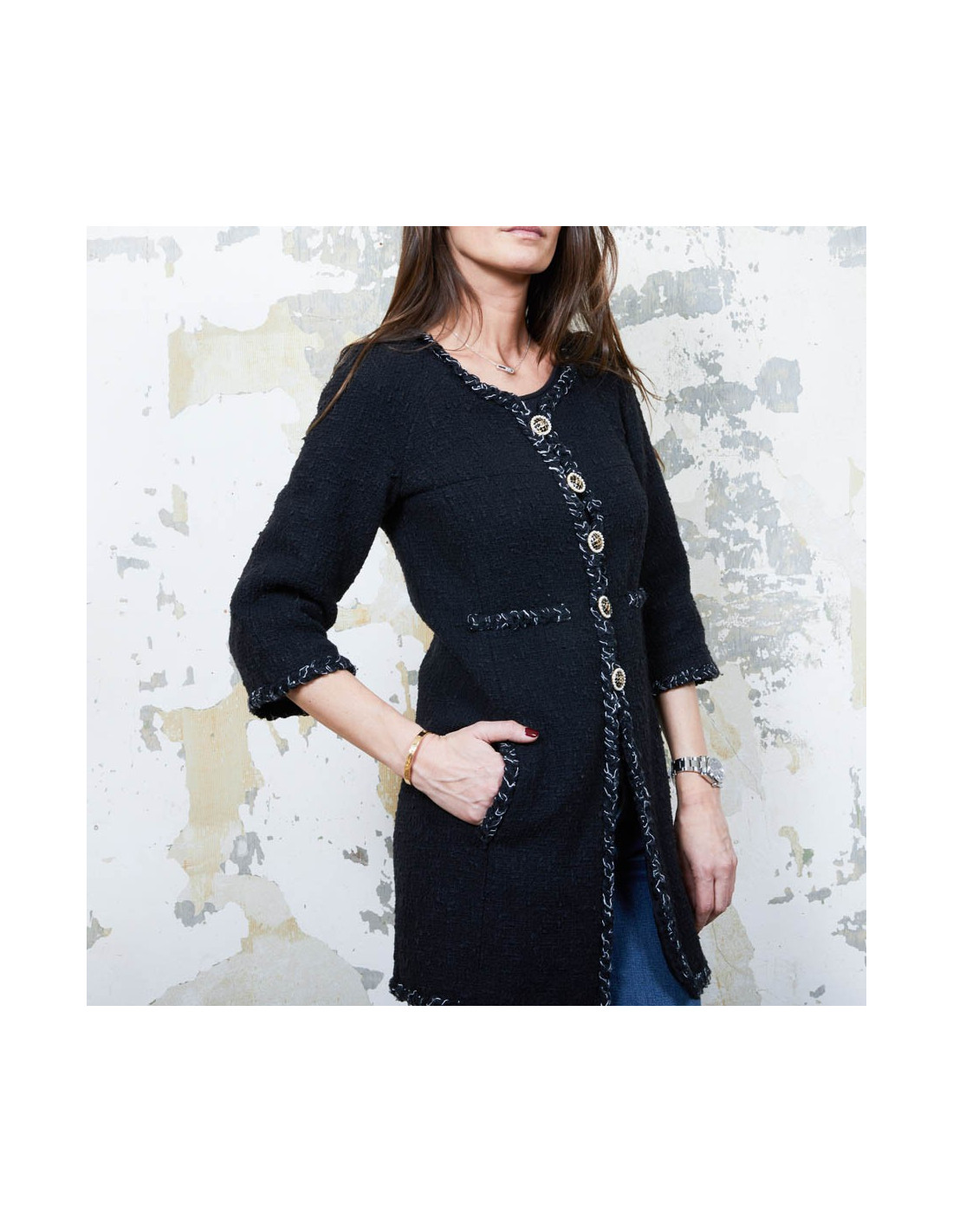 Iconic Chanel long jacket in black tweed. Spring 2007 collection. Made in France. Size 34