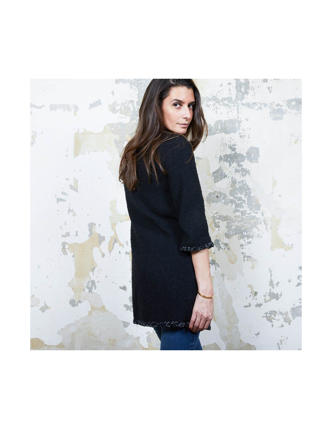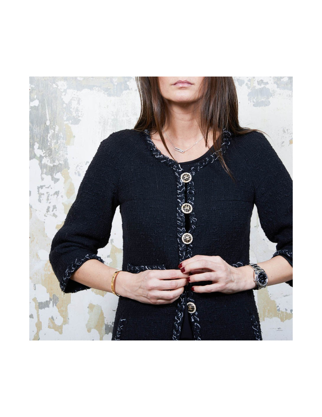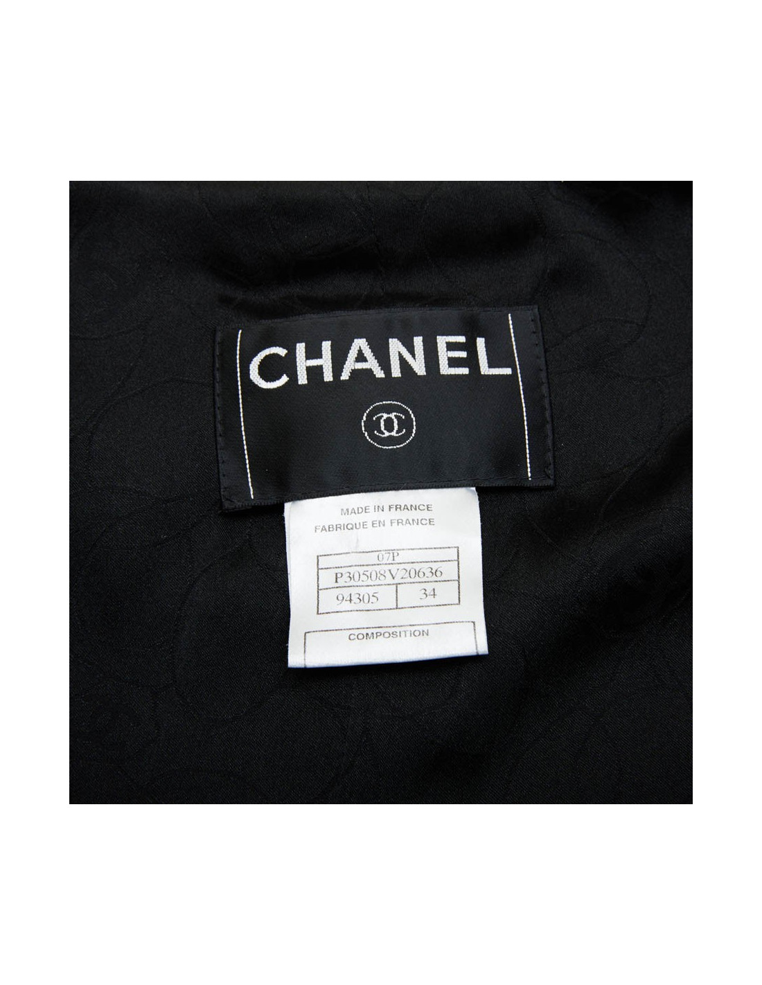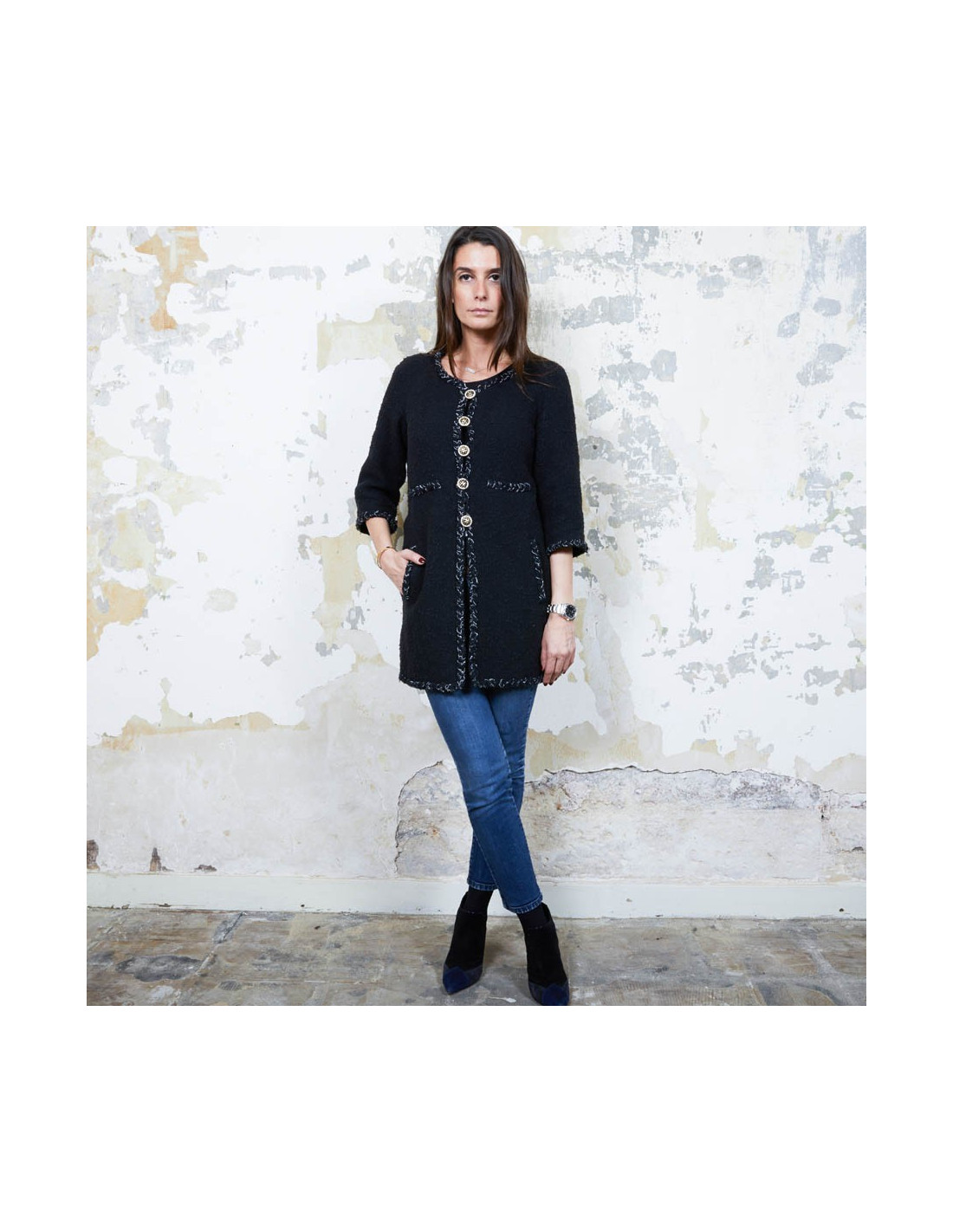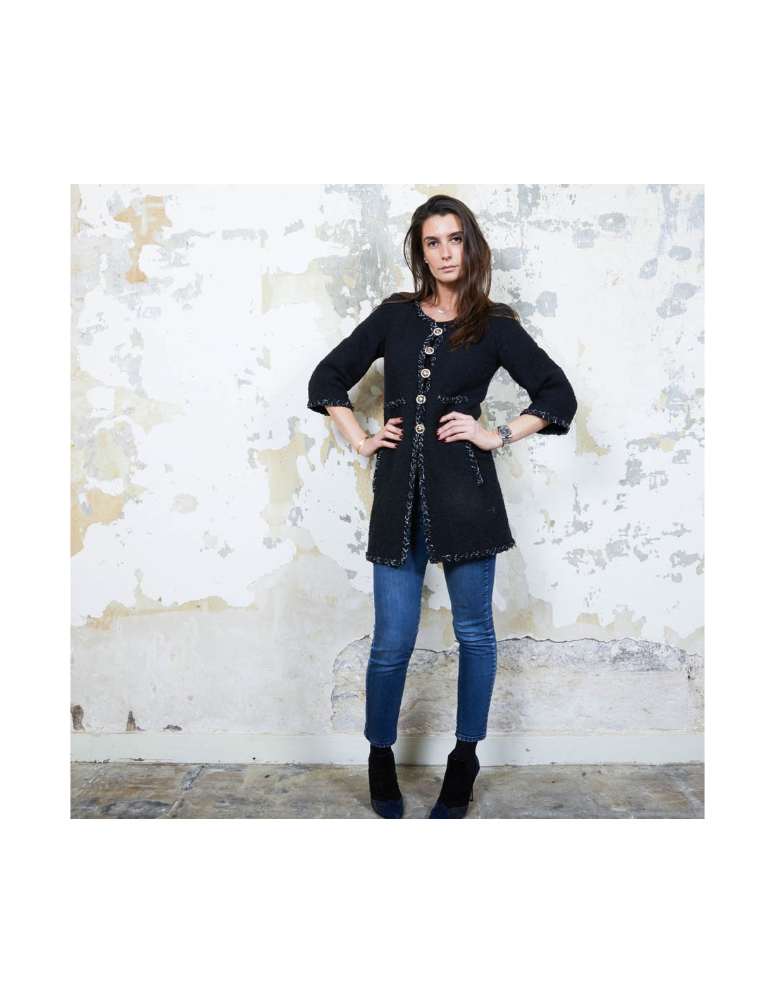 Iconic Chanel long jacket in black tweed. Spring 2007 collection. Made in France. Size 34