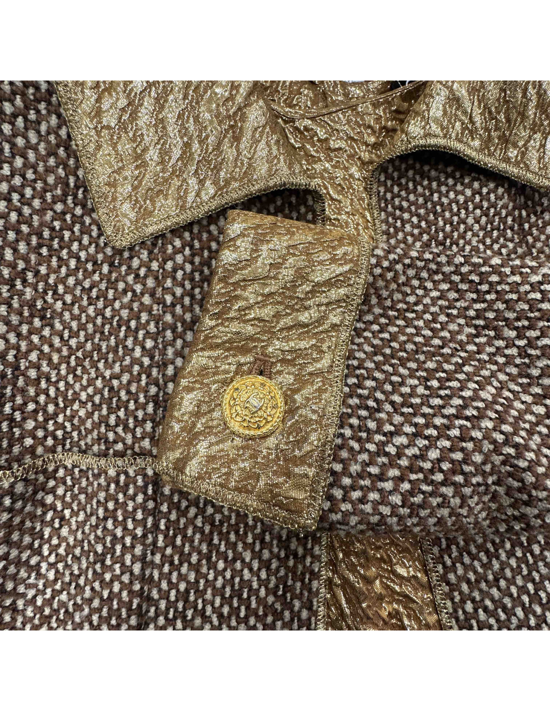 Details: Vintage matching jacket and top. The jacket is made of brown and beige wool, with gold lamé cuffs and collar. An embossed gold button at each cuff. The matching top is a sleevless blouse made of gold lamé silk. Festive, refined and timeless, they can be worn as a twin set or separately.