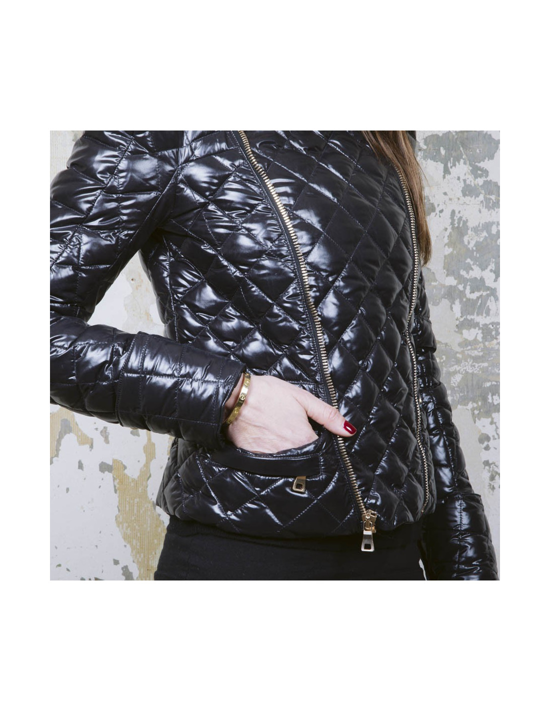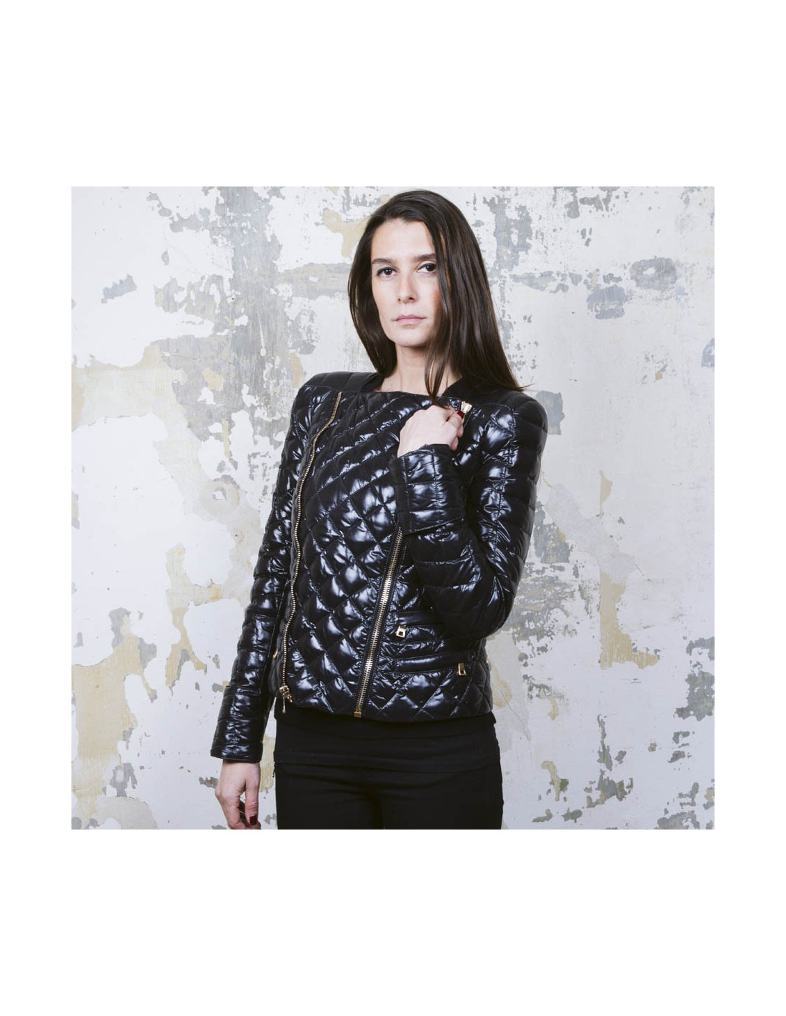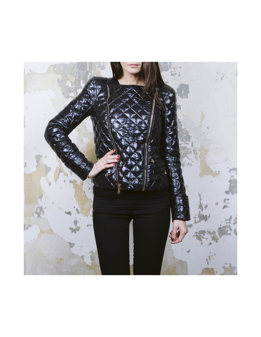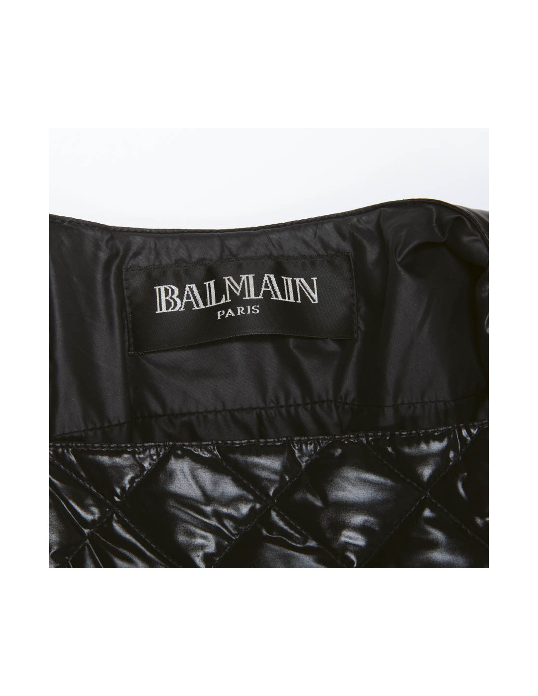 Balmain black perfecto down jacket. Duck down filling and feathers. Five golden buttons on each wrist. Two zippered pockets on each side and a patch pocket. It closes with a zipper. Very good condition.