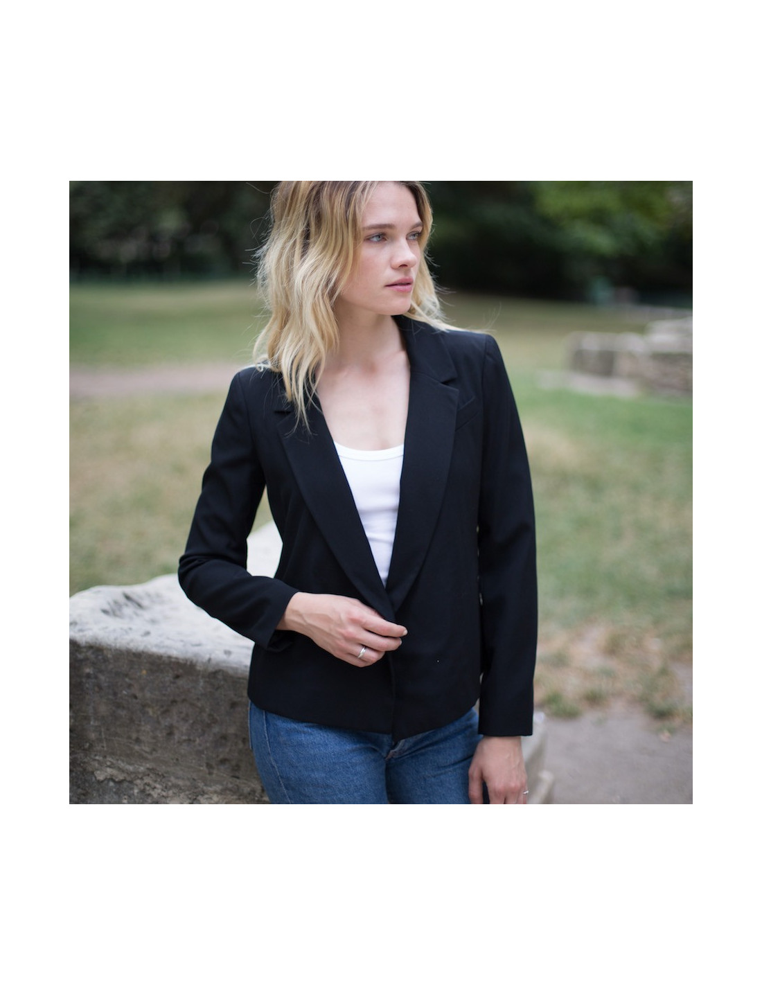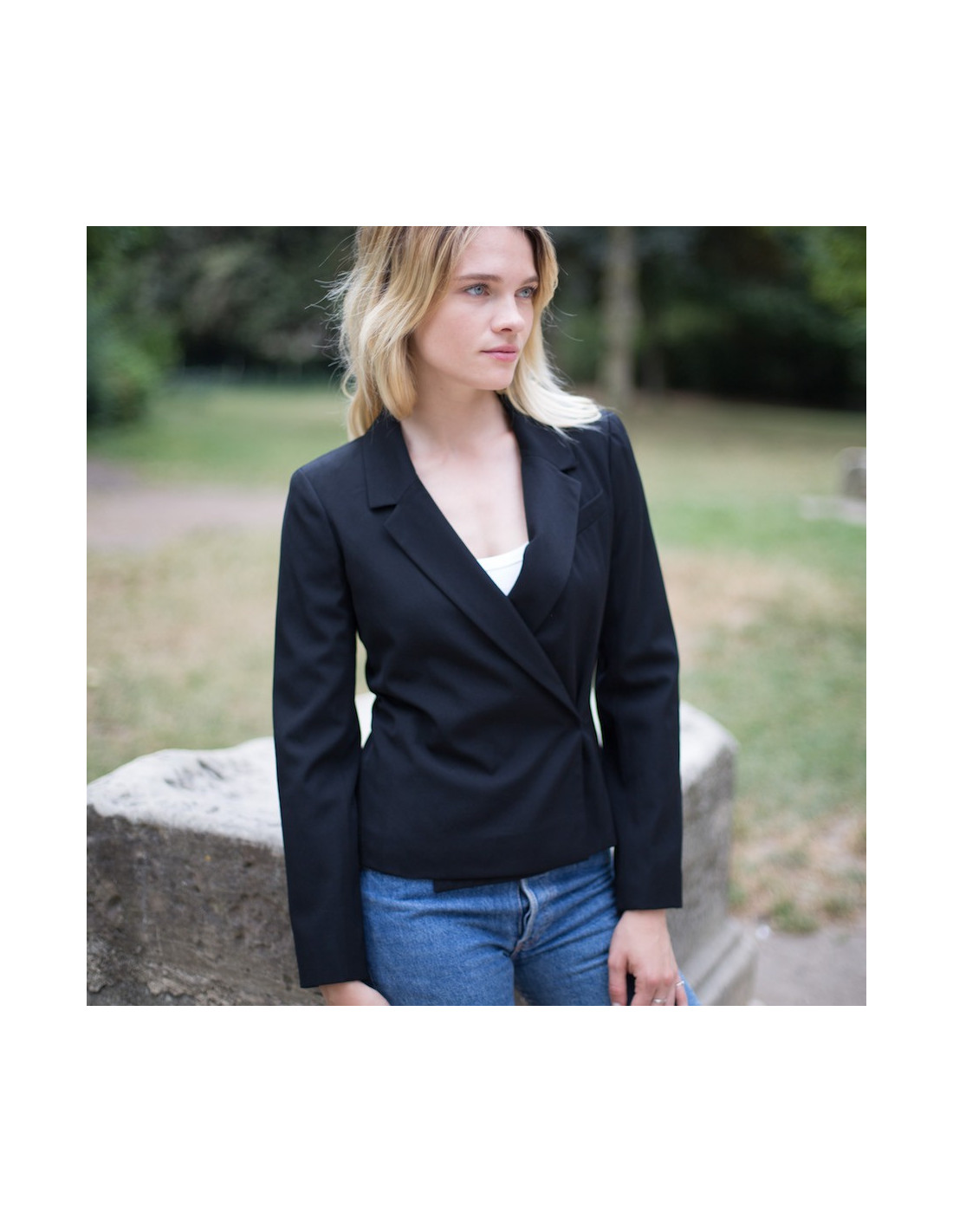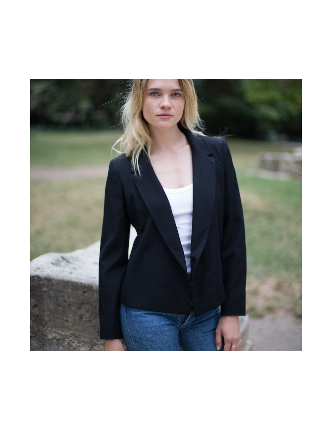 Vintage CHANEL black wool cropped jacket, size 34, double-breasted in front and fastened with a snap button. A classic piece that adds a touch of elegance to any outfit. The lining is black silk with an aged silver chain at the bottom of the jacket. It has a false slit pocket on the chest. In very good condition.