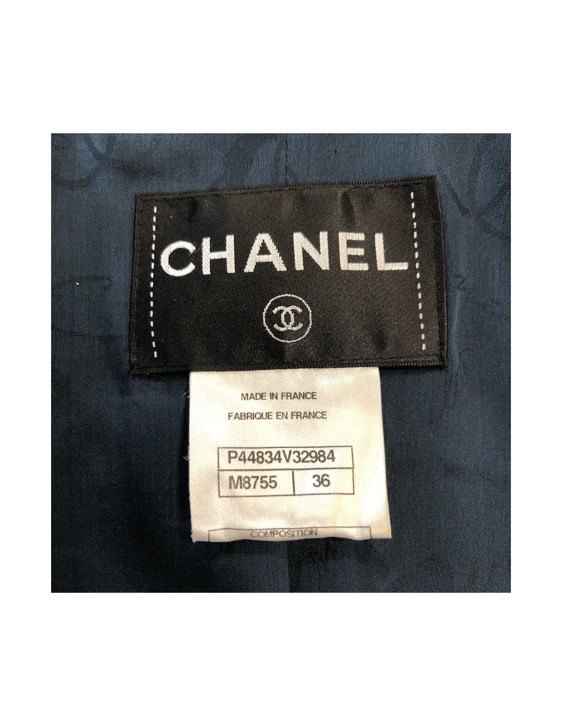 in details This CHANEL T36 CHANEL jacket is made in France. It is made from a blend of wool, cotton, acrylic, viscose, polyamide and polyester. The flat dimensions are: sleeve length 39 cm, shoulder width 42 cm, total length at the collar 48 cm, wrist circumference 43 cm.