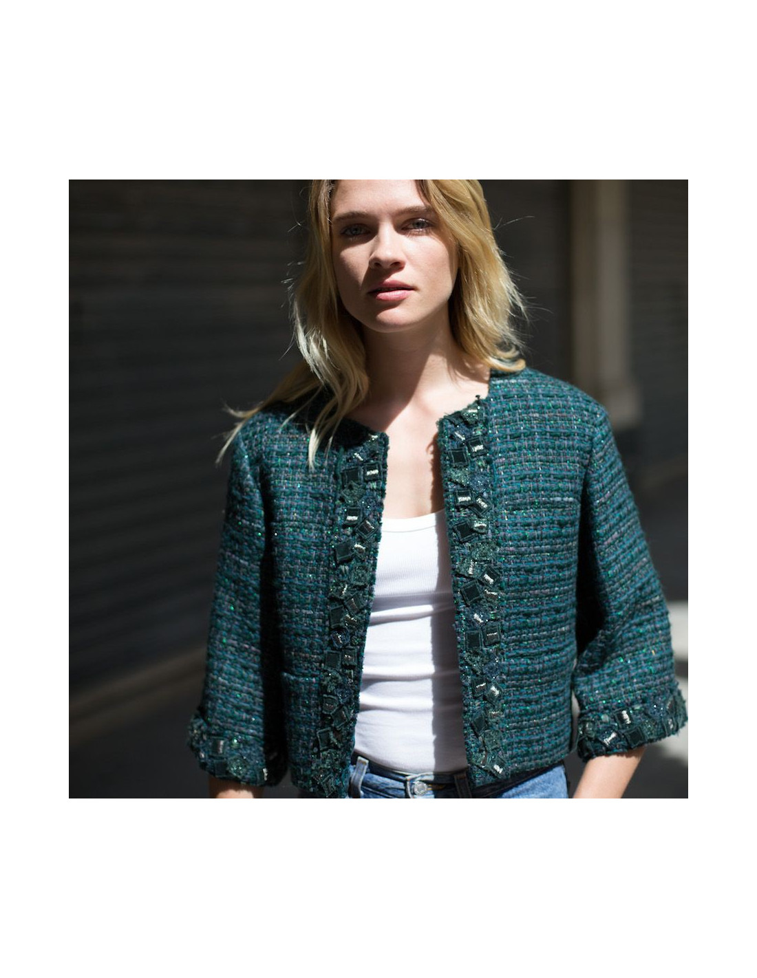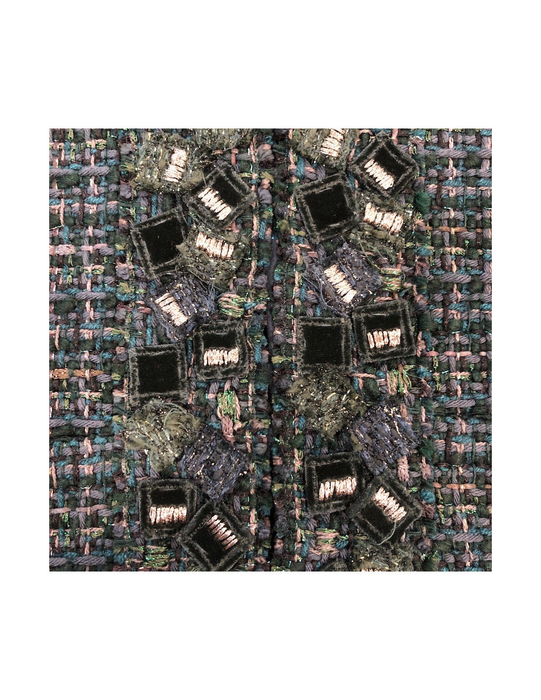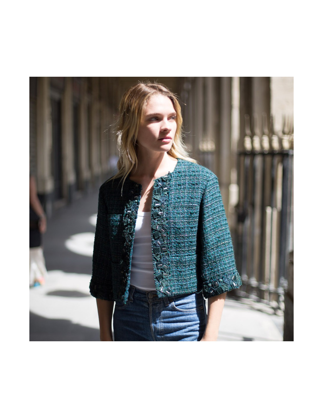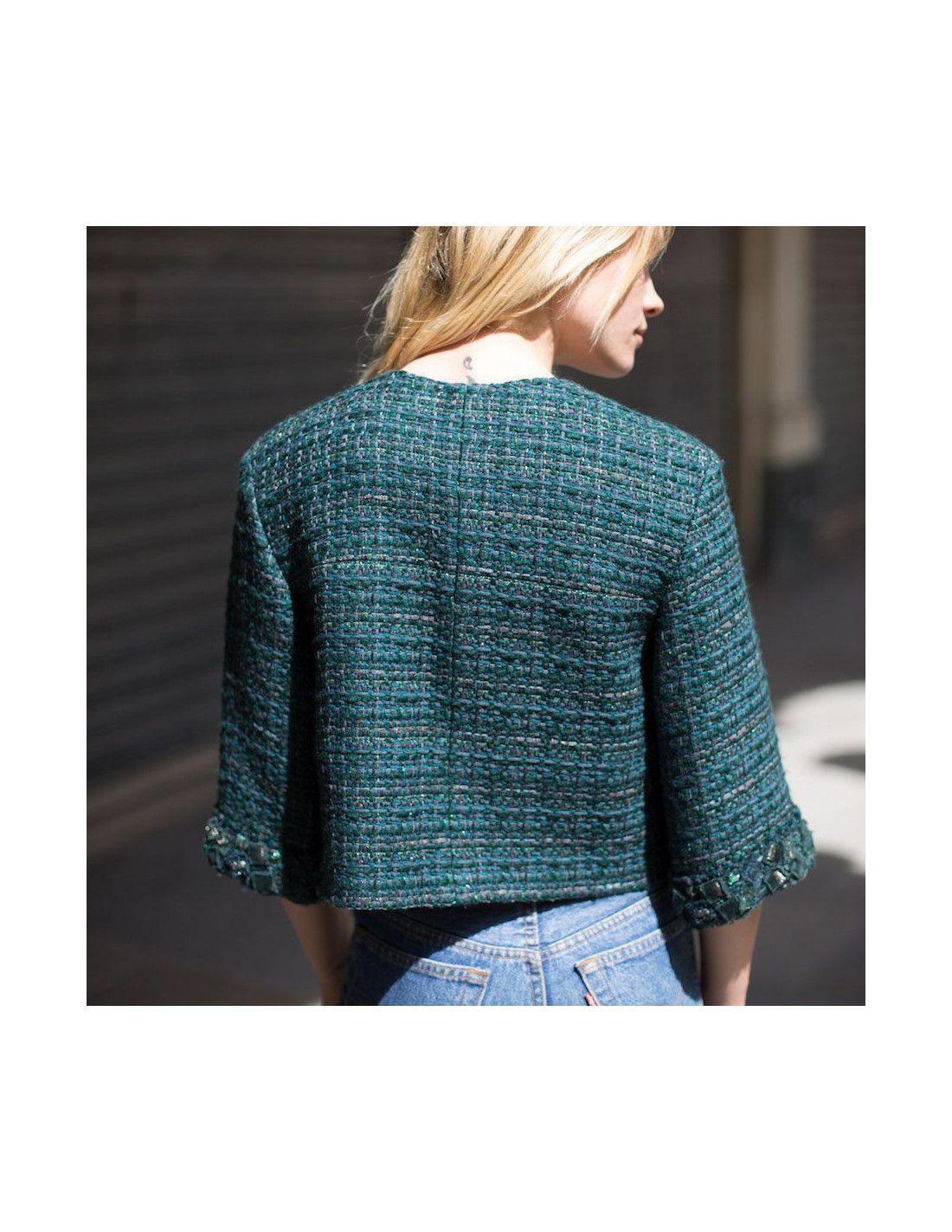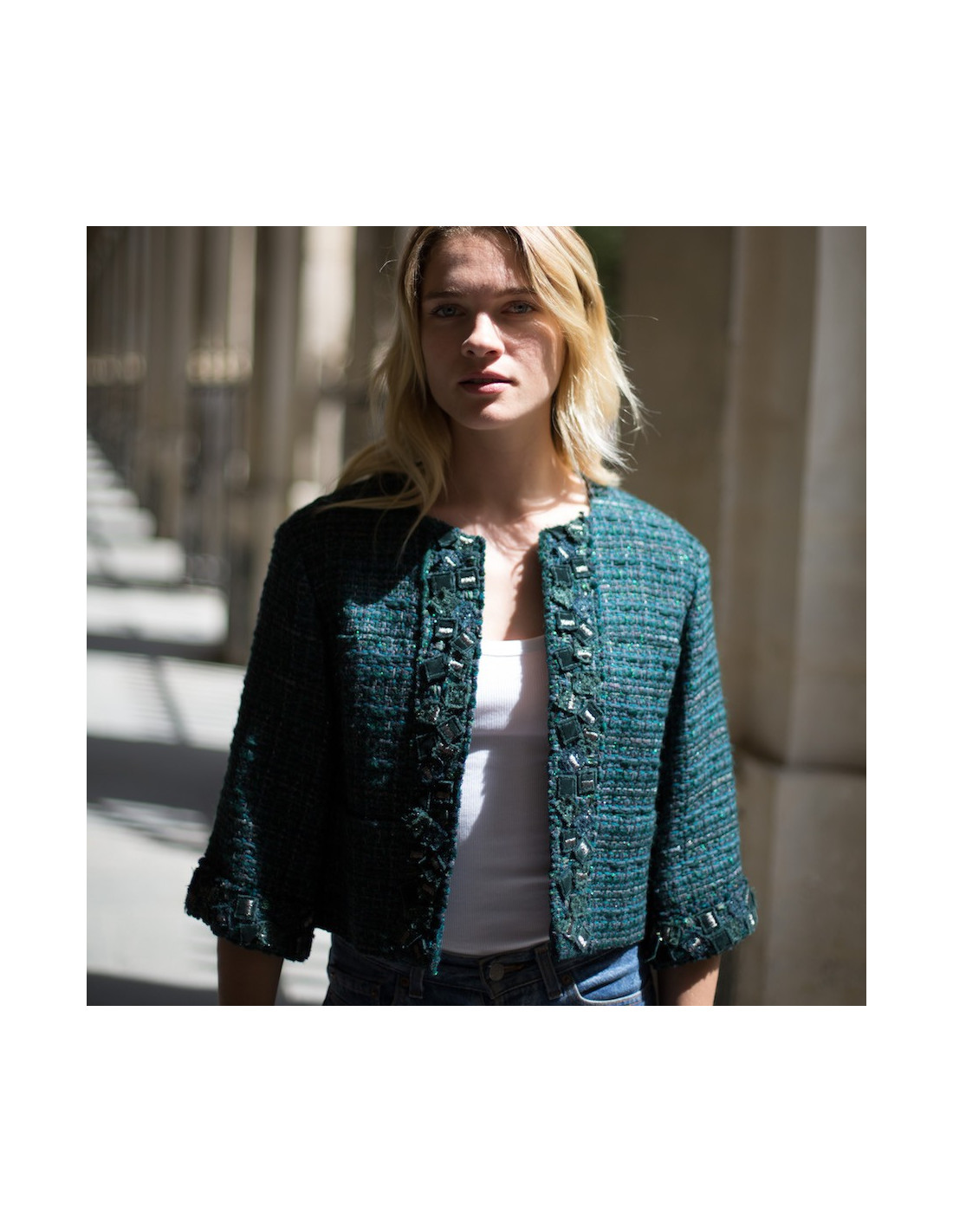 CHANEL T36 blue and green tweed short jacket. It closes with four small invisible hooks. It is braided with two bands of small squares in velvet, bronze threads and green threads. Four patch pockets on the front of the jacket. With its three quarter wide sleeves, it gives a bolero effect. Monogram silk lining. On the bottom of the jacket, we find the essential little chain. The jacket is in very good condition.