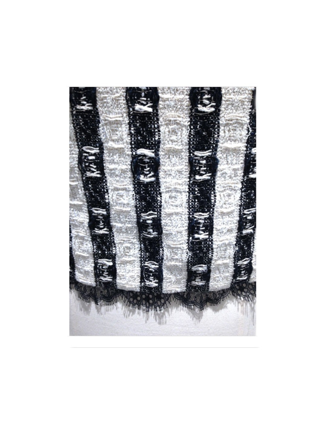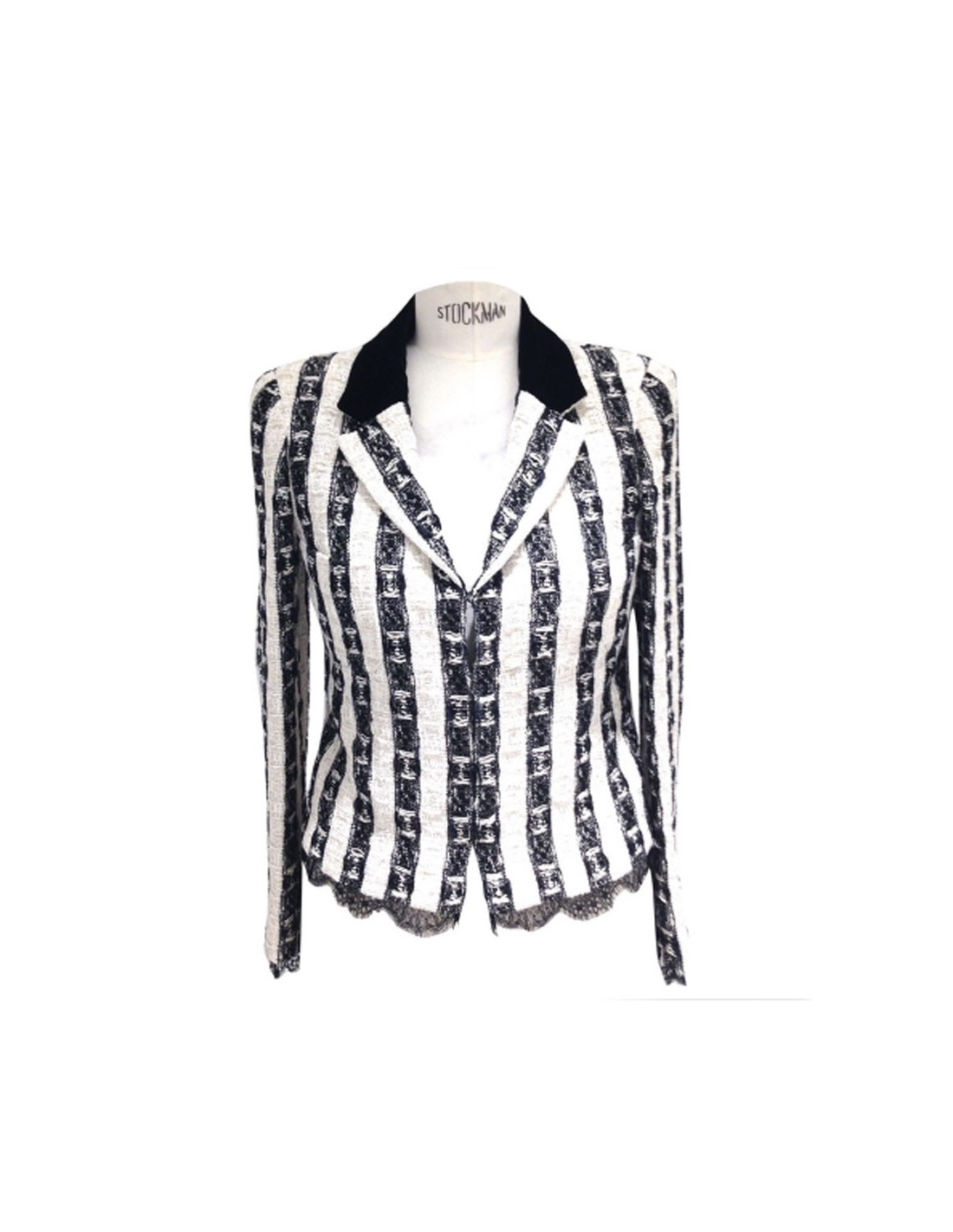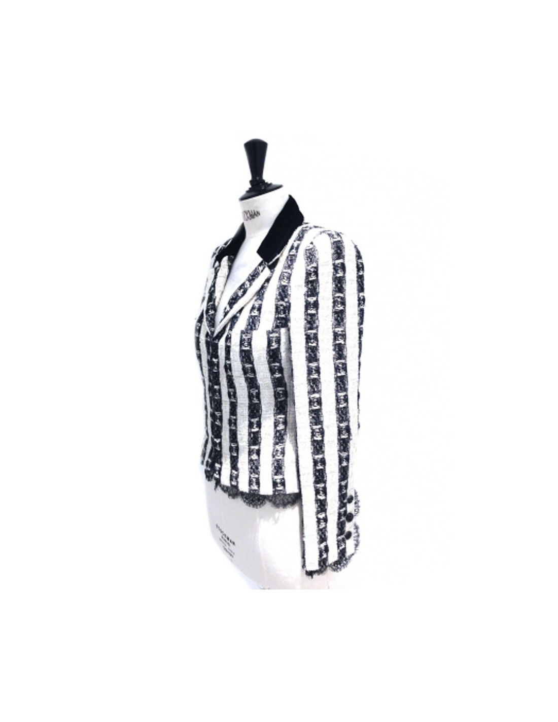 CHANEL tweed jacket with broad stripes black and unbleached, size 40, the autumn-winter 2004 collection. Black velvet collar adorns the jacket with elegance. The jacket has two pockets at the level of the chest. The delicacy of the Black Lace of this LESAGE home on all the lining of the vese, as well as the sleeves, make it an exceptional timepiece. Each handle opening is accessorised with three designer buttons of the CC acronym and small black rhinestones. Length: 58 cm Shoulder width: 41cm, Chest width: 46 cm