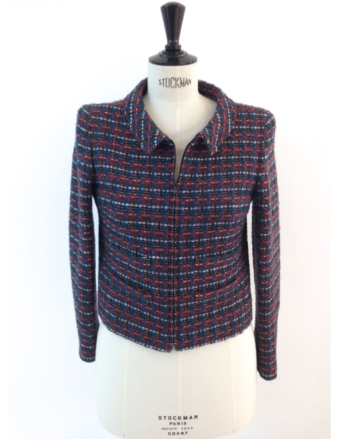 Tricolor tweed CHANEL jacket size 38 in the fall / winter 2002 collection. The tweed is coloured blue duck, dark green, red, white and pink aged. The jacket closes with a fine zipper. The blue duck silk lining is embroidered camelias (symbol of the House), and the abbreviation CC. The jacket has four false pockets.