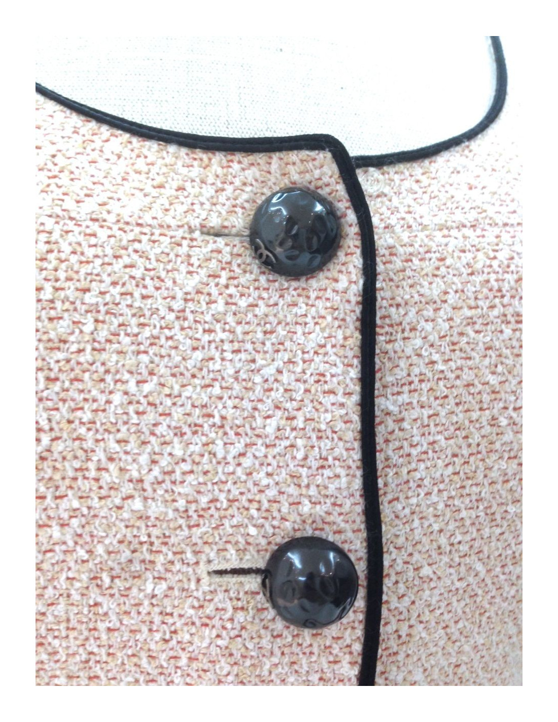 Pastel pink tweed with black edging in satin CHANEL jacket, size 36, collection spring-summer 2012.